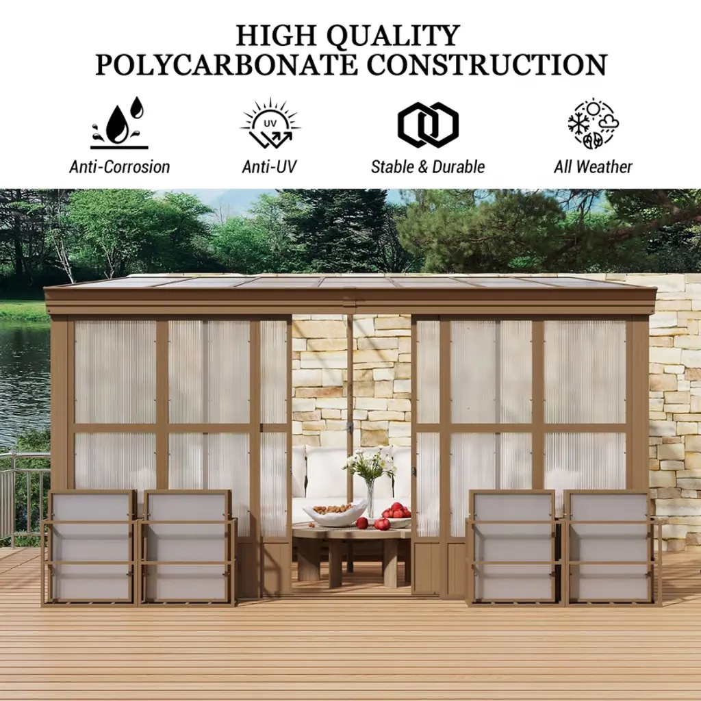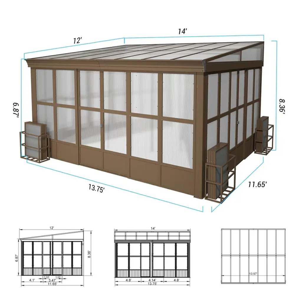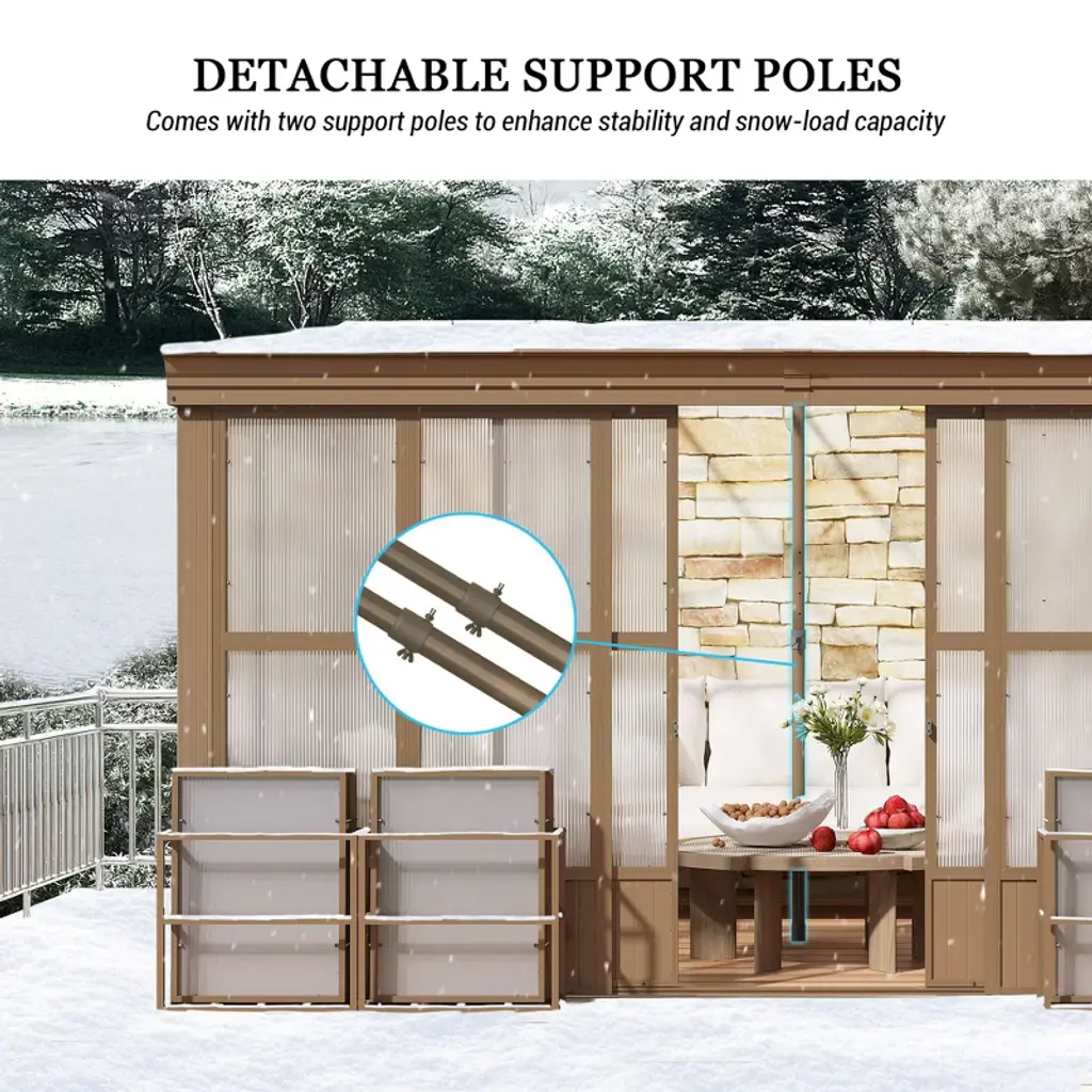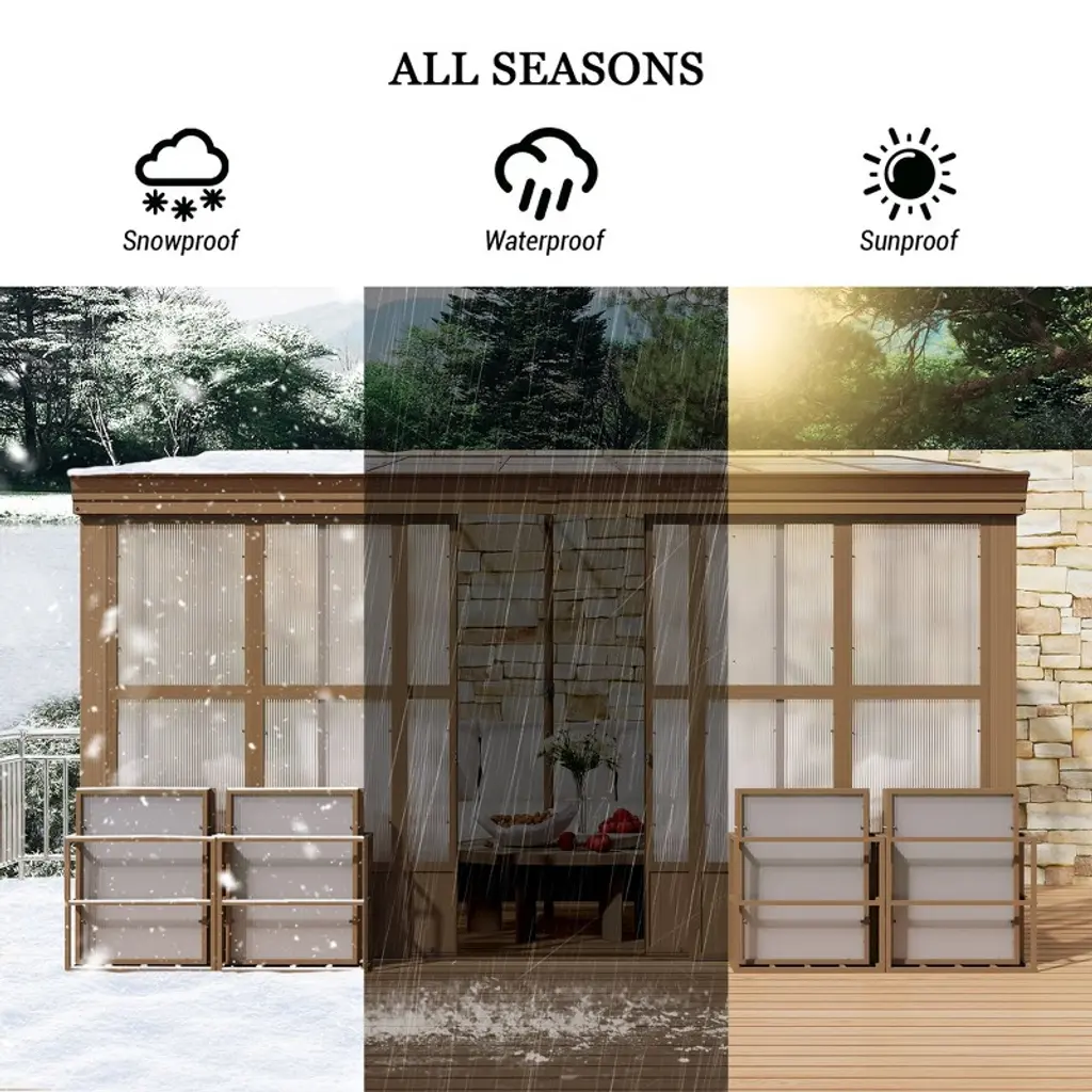 Transform your outdoor space with our spacious wall-mounted sunroom. Featuring a sturdy aluminum frame and a UV-treated polycarbonate roof, it provides comfort and protection. Enjoy seamless indoor-outdoor integration with sliding doors, enhanced privacy with detachable screens, and excellent ventilation with breathable mesh screens.