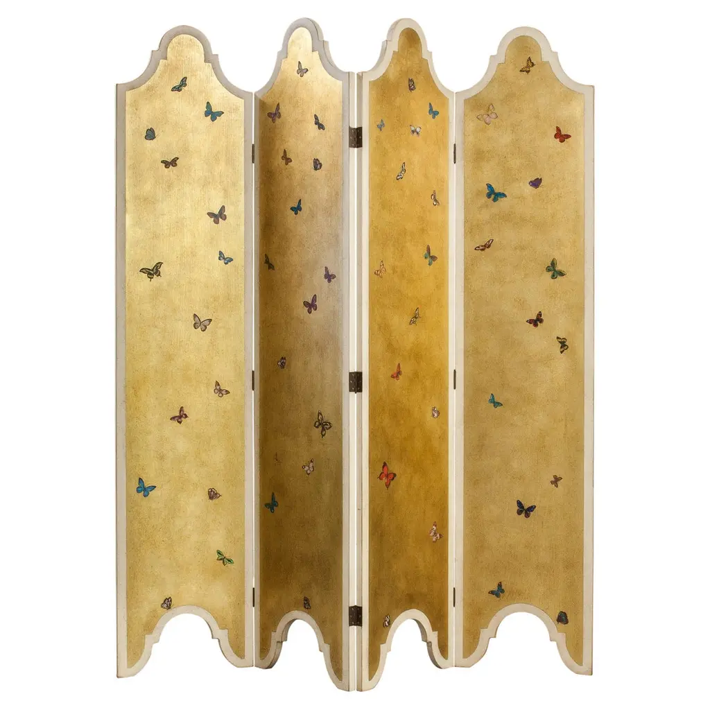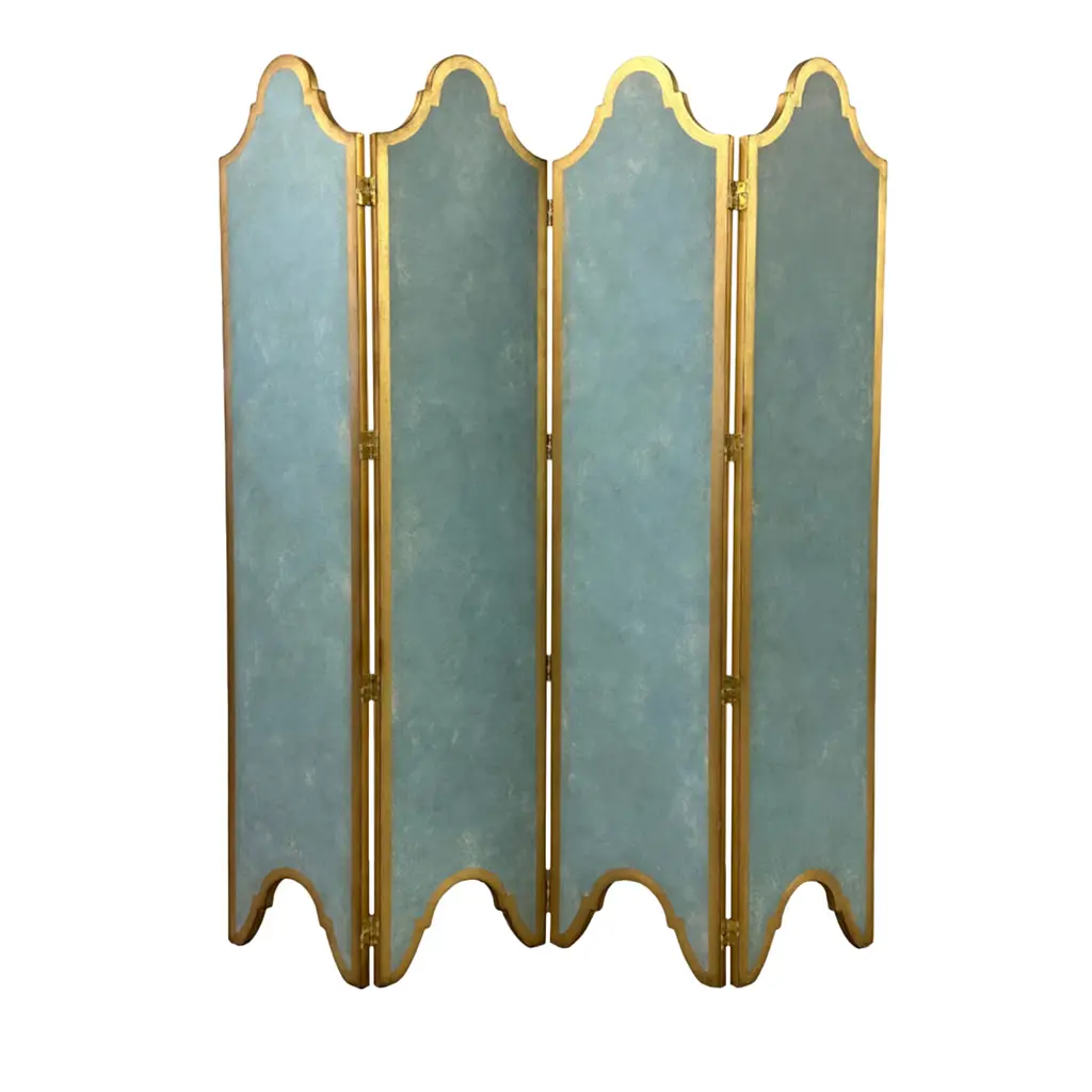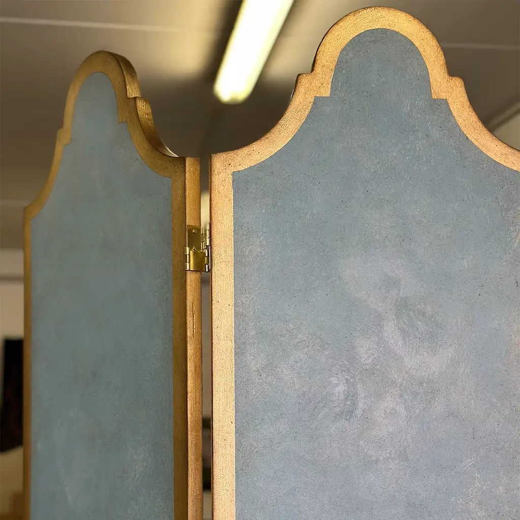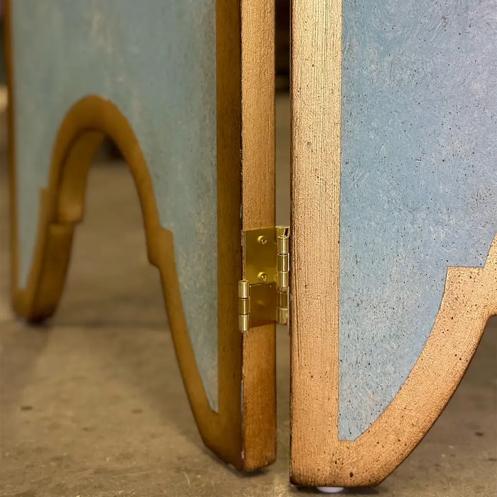 The Moro Screen is the perfect choice to elegantly separate spaces in a room with an eye-catching shape and lovely design object. The peculiarity about this room divider is that is painted with a different color on each side: Parma Blue on one side and Light Taupe on the other, both elegantly embraced by the gold leaf on the edges. Whether as a way to hide something or as a divider to create more intimacy, this hand-painted screen serves as both function and fine art. Customizable upon request. This piece is currently on show and immediately available at Artemest Galleria New York.