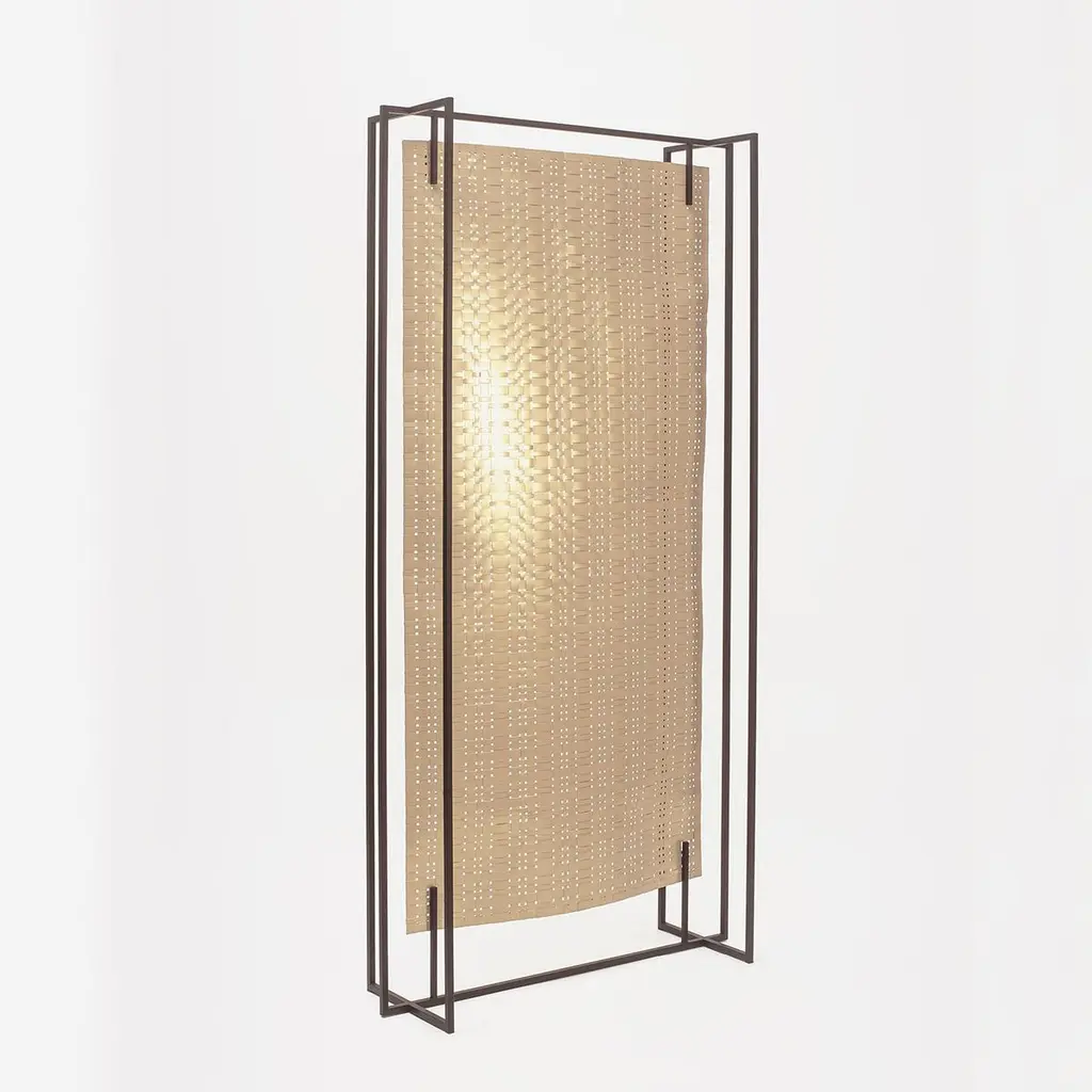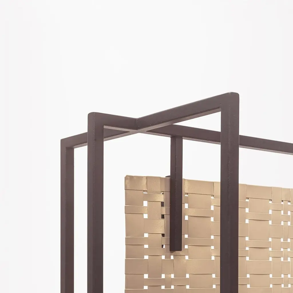 This contemporary screen is perfectly suited for dividing a large, loft-style interior, separating a private corner in a bedroom, or even creating a dynamic backdrop for a bare wall. An open, geometric frame in black-painted tubular iron showcases the double-sided panel fashioned of Splot, a handwoven aluminum mesh created by Inthegarden Design Studio, its champagne-gold tones and rich texture recalling that of ancient tapestry. In line with the company's commitment to sustainable production, the aluminum used is recovered from industrial production waste.