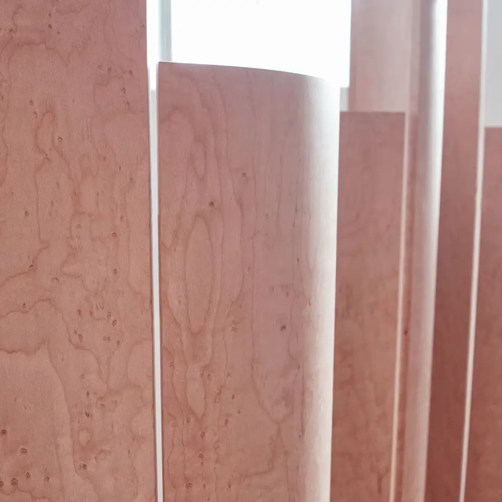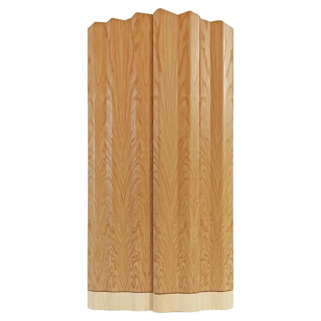 Precious Burl Wood Wave Sculpture designed by Daniel Nikolovski. This nature-inspired room divider has a subtle wavy silhouette that is both visually stunning and elegant. Made of exclusive and precious maple burl veneer, the panels are connected by invisible brass hinges. The organic waves are a contemporary interpretation of the iconic mid-century room screen. This splendid luxury piece can be used to separate different living areas. When closed, it becomes a stunning sculptural column.