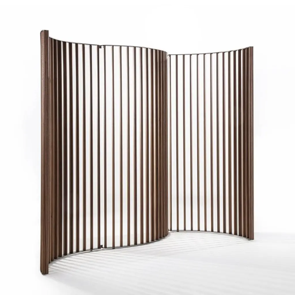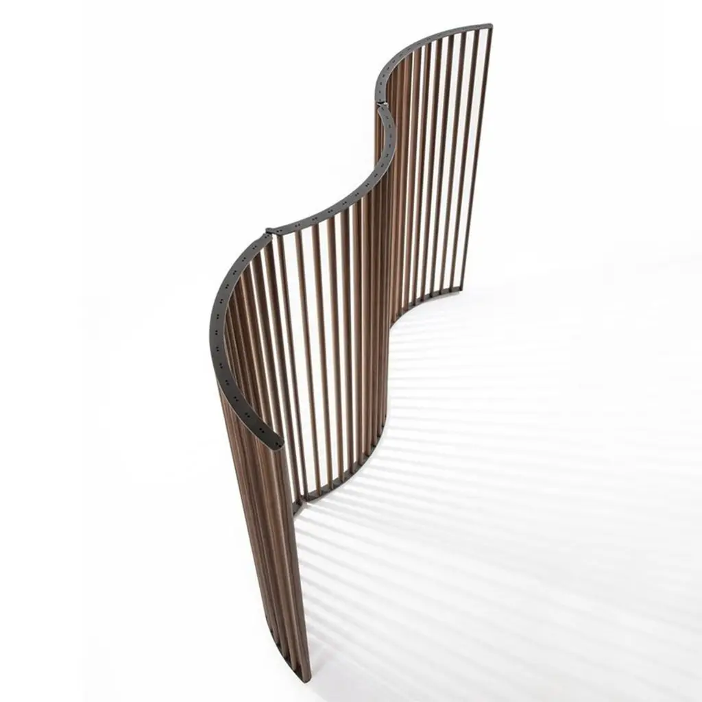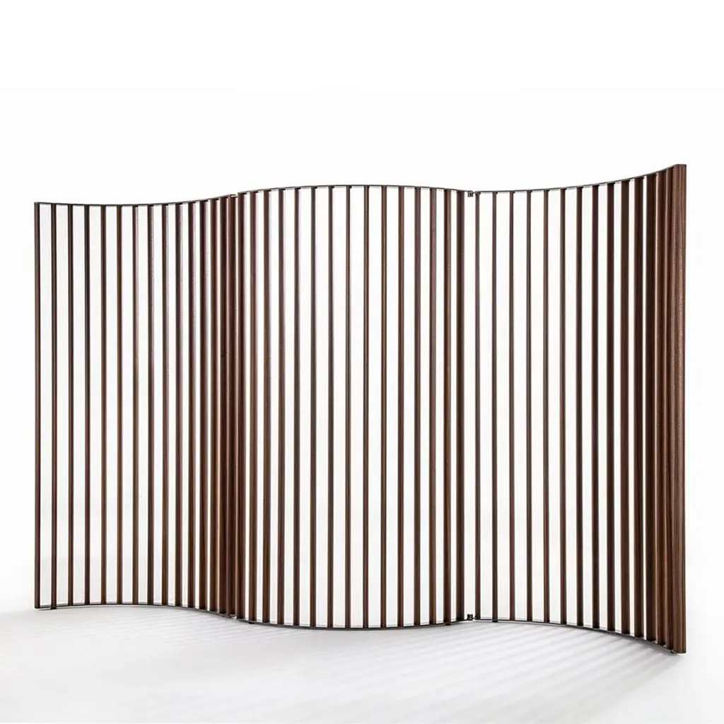 Screen Ondulate Set of 3 made with 3 curved panels.Each panel is made in aluminium bars covered with solid walnut.With top and bottom metal frame with adjustable small feet.Panels are hinged together for free configurations.Single panel dimensions: L101 x D23,5 x H192 cm.Unit panel, price: 6450,00€.Set of 2 panels, price: 13400,00€.Set of 3 panels, price: 19900,00€.