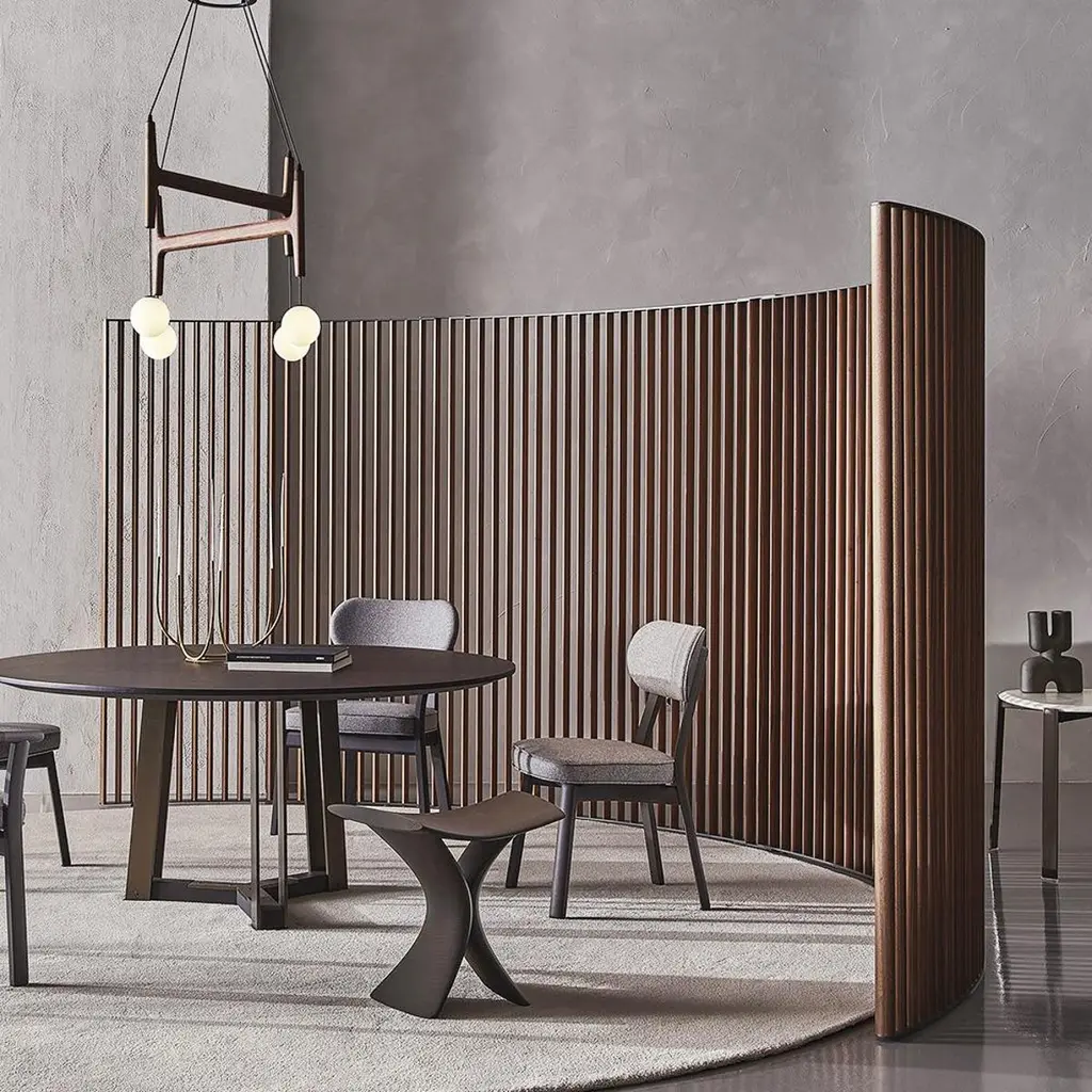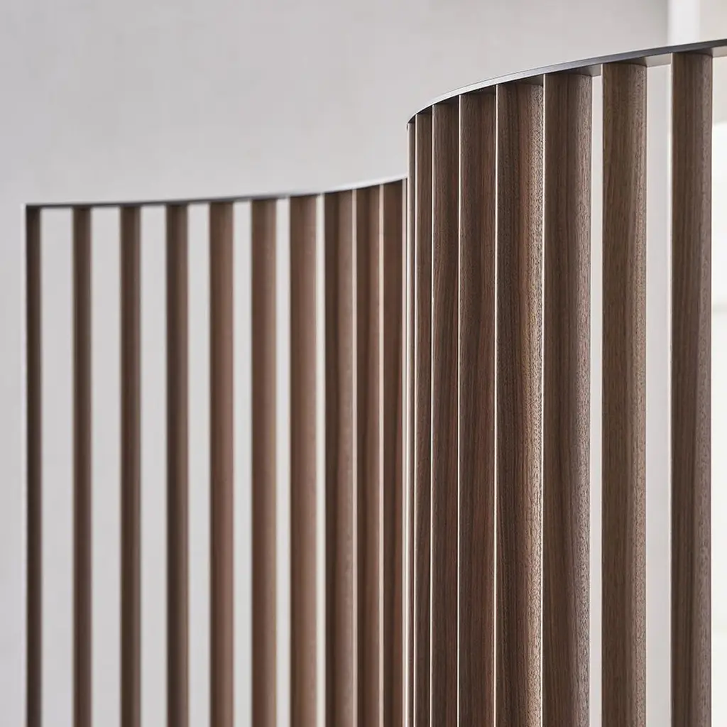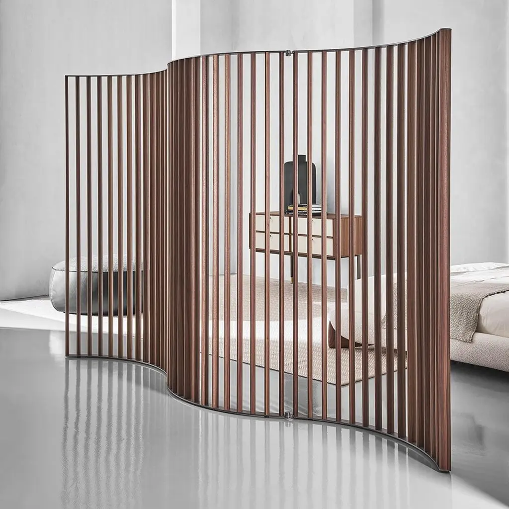Screen Ondulate Set of 3 made with 3 curved panels.Each panel is made in aluminium bars covered with solid walnut.With top and bottom metal frame with adjustable small feet.Panels are hinged together for free configurations.Single panel dimensions: L101 x D23,5 x H192 cm.Unit panel, price: 6450,00€.Set of 2 panels, price: 13400,00€.Set of 3 panels, price: 19900,00€.