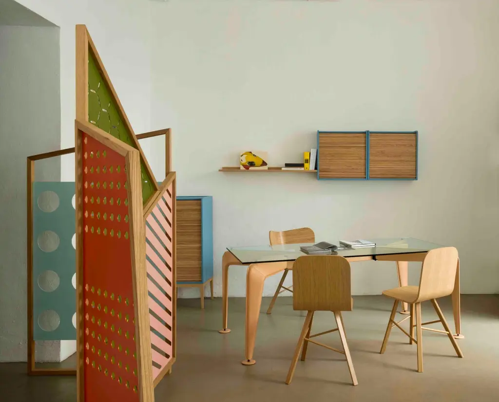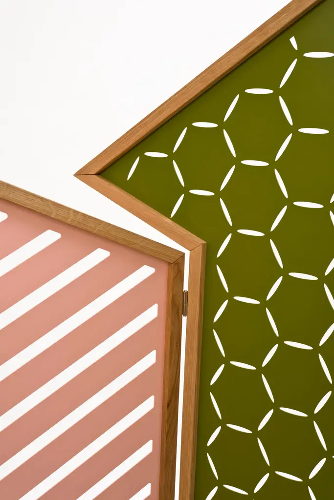 Opto 1/2 folding screen, colors Lacquered by Colé Italia with Lorenz + KazDimensions: H 200, W 300, D 4 cmMaterials: Laser-cut metal panels inside the frame.Finishing: Natural Oak WoodAlso Available: Natural Oak, Black Oack, and Black Anthracite or Lacquered in four bright colors orange, green, rose, pale blue.It’s name is Opto because clearly inspired by the art world and, in particular, to optical Bauhaus works by Lazlo Moholy Nagy. Solid wood frame in oak wood, with an irregular geometry. Laser-cut metal panels inside the frame, black anthracite or lacquered in four bright colors. Custom finishing available.Colé is a young Italian design brand, with a high-end production 100% made in Italy. Born from the experience of Matteo De Ponti, architect, who grew up in one of the most outstanding Milanese design families, and the artistic sensibility of Laura Macagno, degree in Economics and passionate of art and design. Our Mission is to create design icons, beautiful and comfortable pieces that can Stand the test of time, furnishing houses of international and sophisticated clients, and realized with craftsmanship, thus unique. “We love objects which own deep roots, excellent quality, and a strong evocative power. Archetypal forms dressed with new beauty without losing their classical composure”.Our expressive research is inspired by the utopian force of Italian eminences grises architects and designers of the ’50s, the Scandinavian design, the Bauhaus, ethnic handcraft and houses of famous writers of the XX century, all different as a style but united by the intense soul of those who worked and lived there.