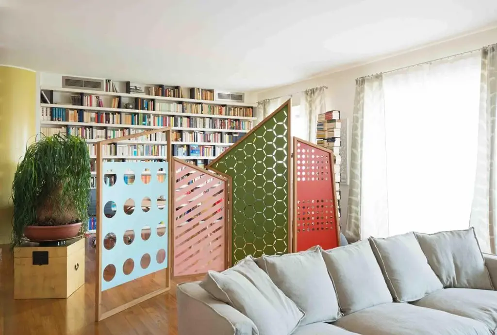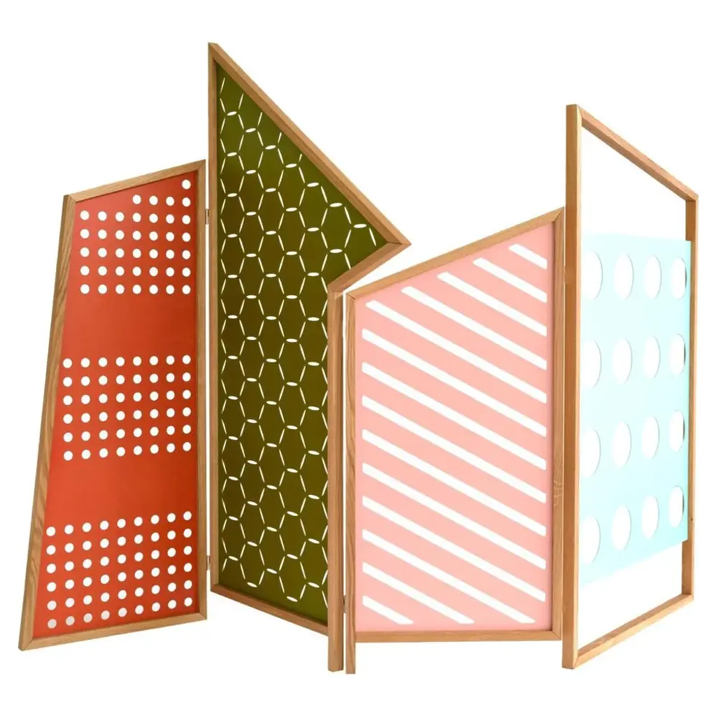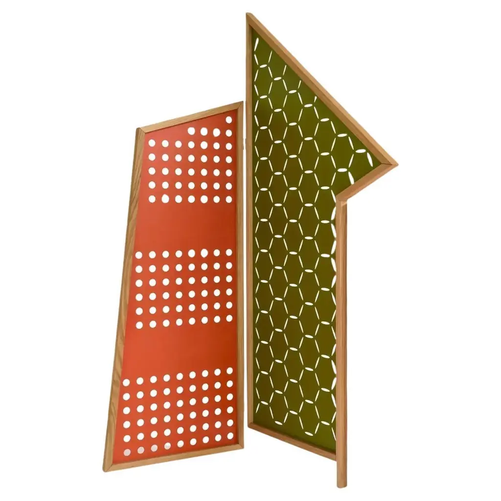 Opto Folding screen 4 colors Lacquered by Colé Italia with Lorenz + Kaz Dimensions: H 200, W 300, D 4 cm Materials: Laser-cut metal panels inside the frame, black anthracite or lacquered in four bright colors orange, green, rose, pale blue Finishing: Natural Oak Wood