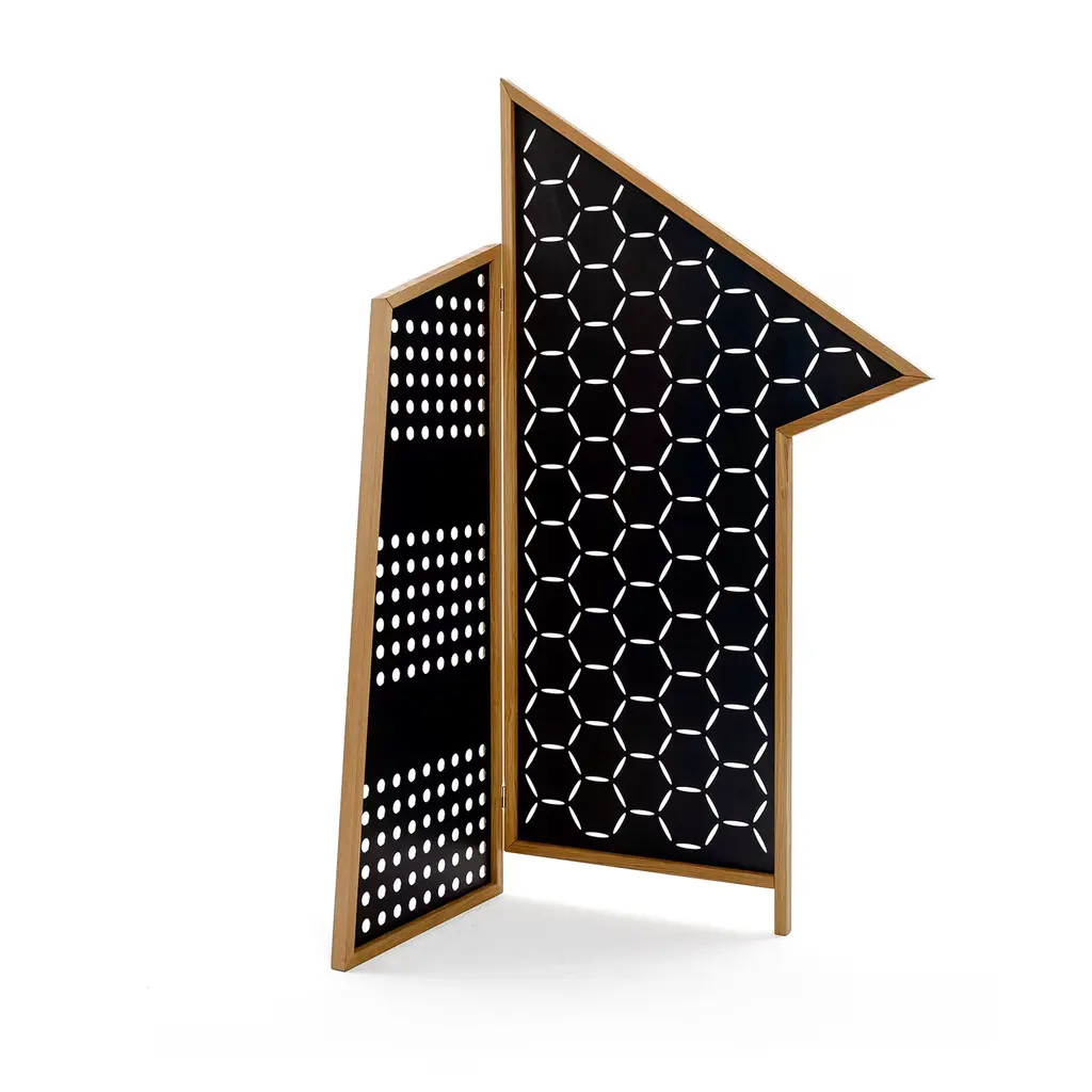 This elaborate folding screen is made up of four panels of irregular geometric shapes in iron, laser cut into brilliant patterns, and colored black. Each panel is framed in solid oak with a gorgeous shiny oil finish.