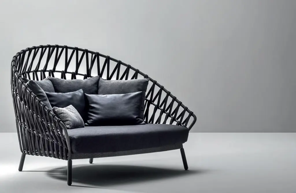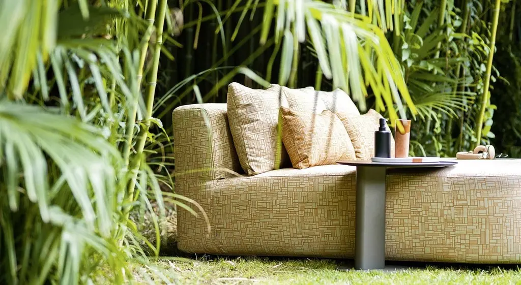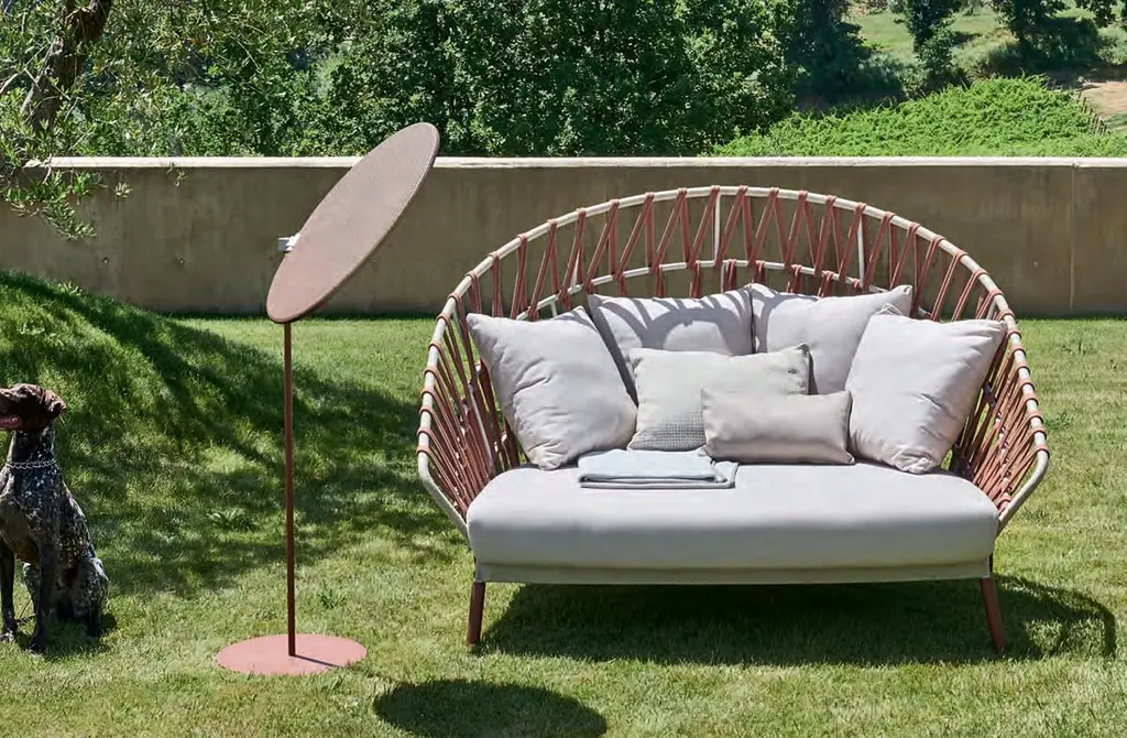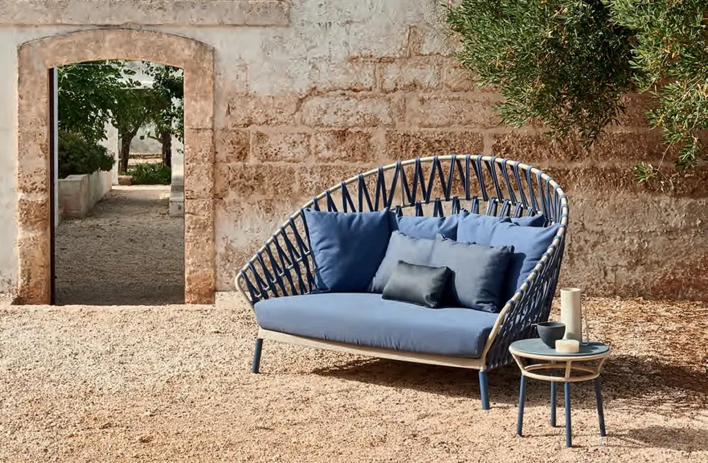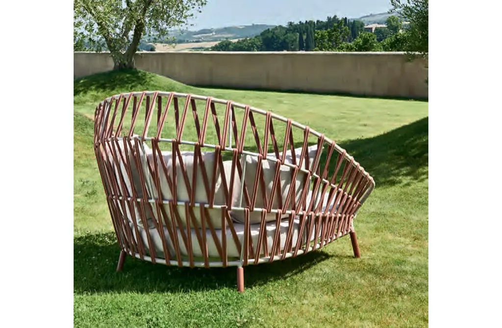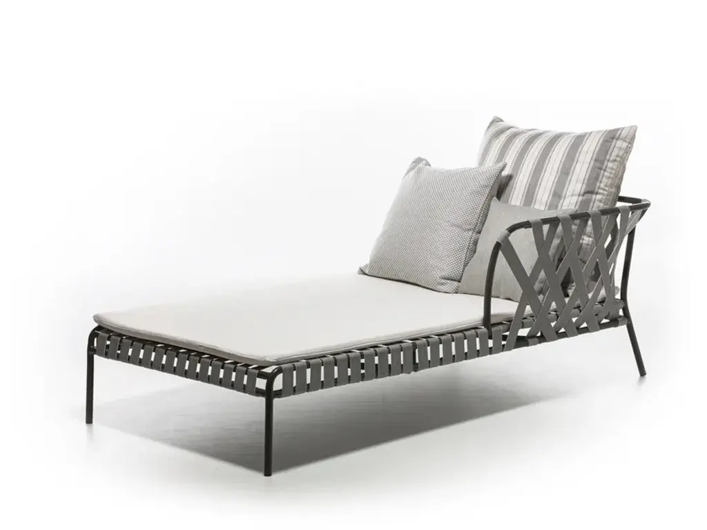 The idea of sofa meets the bed: and here is daybed. The one from the Emma Cross collection stands out for the shape, decidedly cocooning thanks to the backrest-armrests combination, distinguished by the weaving, handmade in acrylic fabric Band, on a powder-coated aluminium frame. The seat cushion with Dryfeel® foam padding, suitable for outdoor use, and the 7 back cushions are included.Powder-coated aluminium structureSeat cushions with Dryfeel® foam padding, suitable for outdoor use.Band in acrylic fabric.Legs/feet available in White, Silk Grey, Denim, Rust, Bronze Metal, Green, Grey, Moka, Black.Bucket in colours Silk Grey and Var#Rope Beige and in Grey and Var#Rope Dark Grey.Band available in colours Beige Band, Denim Band, Rust Band, Green Band, Anthracite Band.Sunscreen: W 16 7/8 ” - H 60 5/8” - D 33 1/2” Side table: W 21 5/8” - H 17 3/4” - D 15 3/4”We do our best to expedite production and to ship and deliver product within the listed lead time, however current lead times might be longer due to global shipping backlog and delays. These delays are out of our control and cannot be a reason to cancel an order.