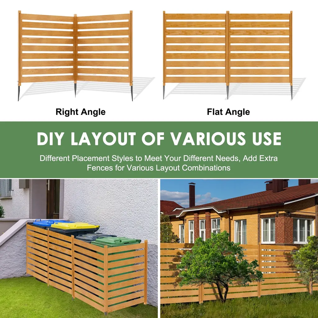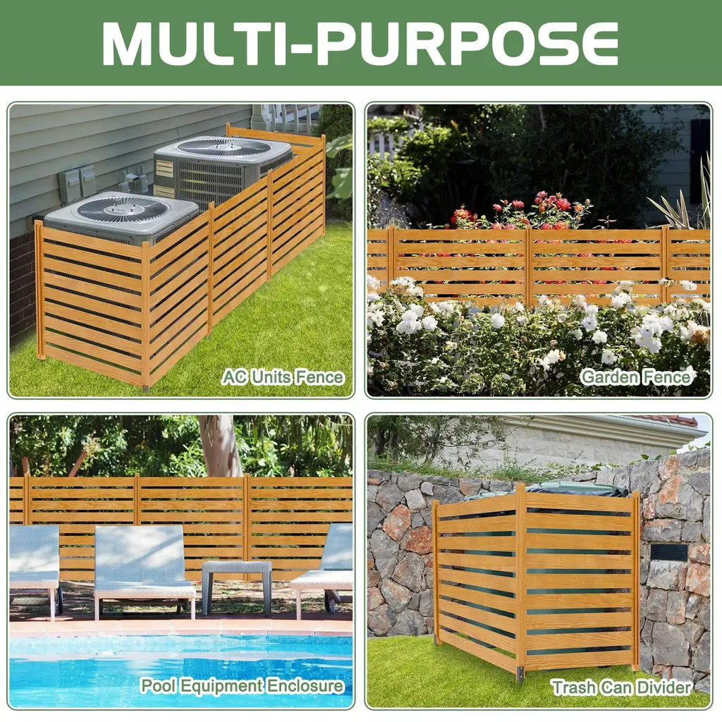 DoCred Outdoor Privacy Fence is made of sturdy, weatherproof material that hides air conditioners, trash cans, or other unsightly amenities. With the included accessories, you can easily install the fence on grass or concrete. The fence has a classic faux wood look that complements any garden, patio or yard.Features:Style_1:Style_2:USES: Great for hiding outdoor air conditioning units, trash cans, pool equipment enclosure, also can be used as garden fence, pet fence, perfect for decorating your garden and patio. Can be used in multiple combinations, if you decide to install them side by side, it is recommended to use concrete to fix the panels to the ground.