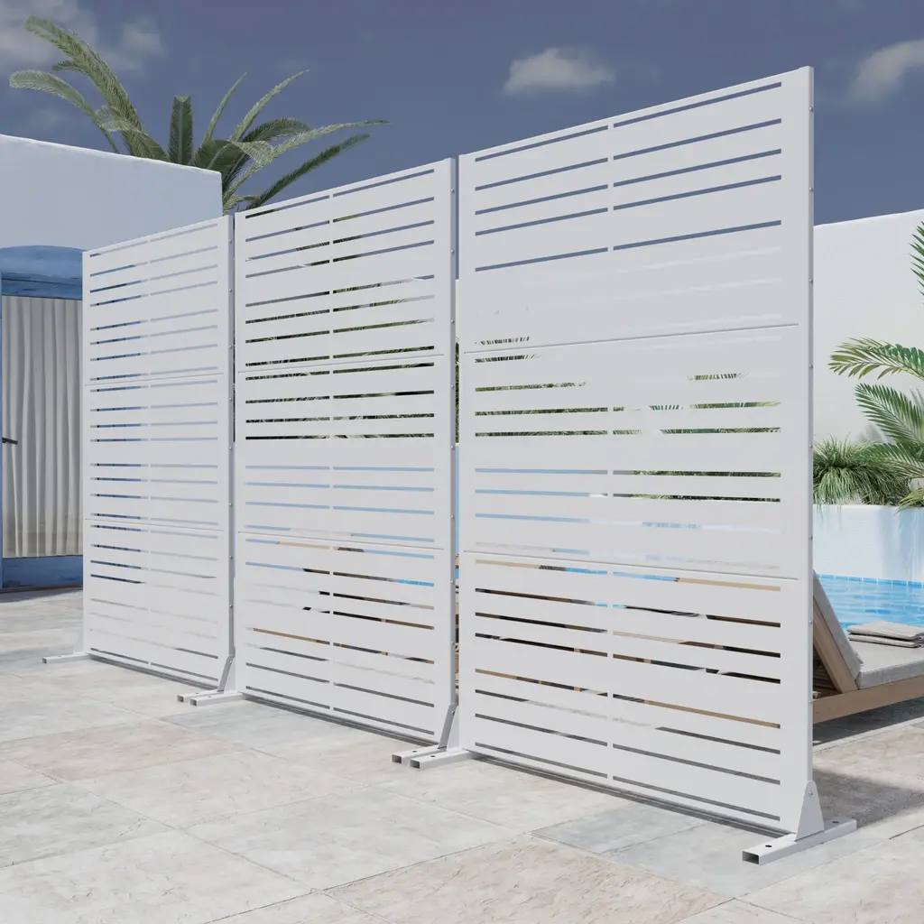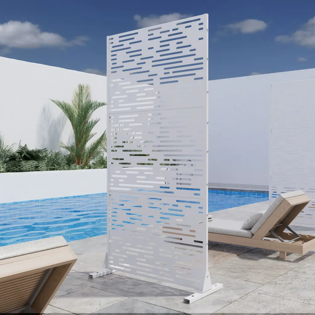 Add modern elegance and privacy to your space with our Privacy Screen Divider. Featuring an elegant pattern design, this screen enhances the aesthetics of indoor and outdoor areas while providing privacy protection. It's more than just decor—it acts as a barrier to safeguard your personal space. Features: Enhanced Privacy: Our privacy screen offers additional privacy protection wherever it's placed, adding modern style to your space. Premium Quality & Durability: Constructed with high-quality coated materials, our screen ensures corrosion resistance and long-term stability in various climates.Flexible Assembly & Versatile Application: With pre-drilled holes on all sides, customization is easy to meet your preferences. Perfect for gardens, patios, balconies, or pool areas, it seamlessly integrates into any setting. Important Notes: The latest version includes ground stakes for soft surfaces, and both old and new versions come with expansion screws for hard surfaces. Additional Accessories: For DIY enthusiasts, extra components can be sourced locally for added convenience. Wind Resistance: For windy areas, additional accessories are recommended to reinforce stability and safety.