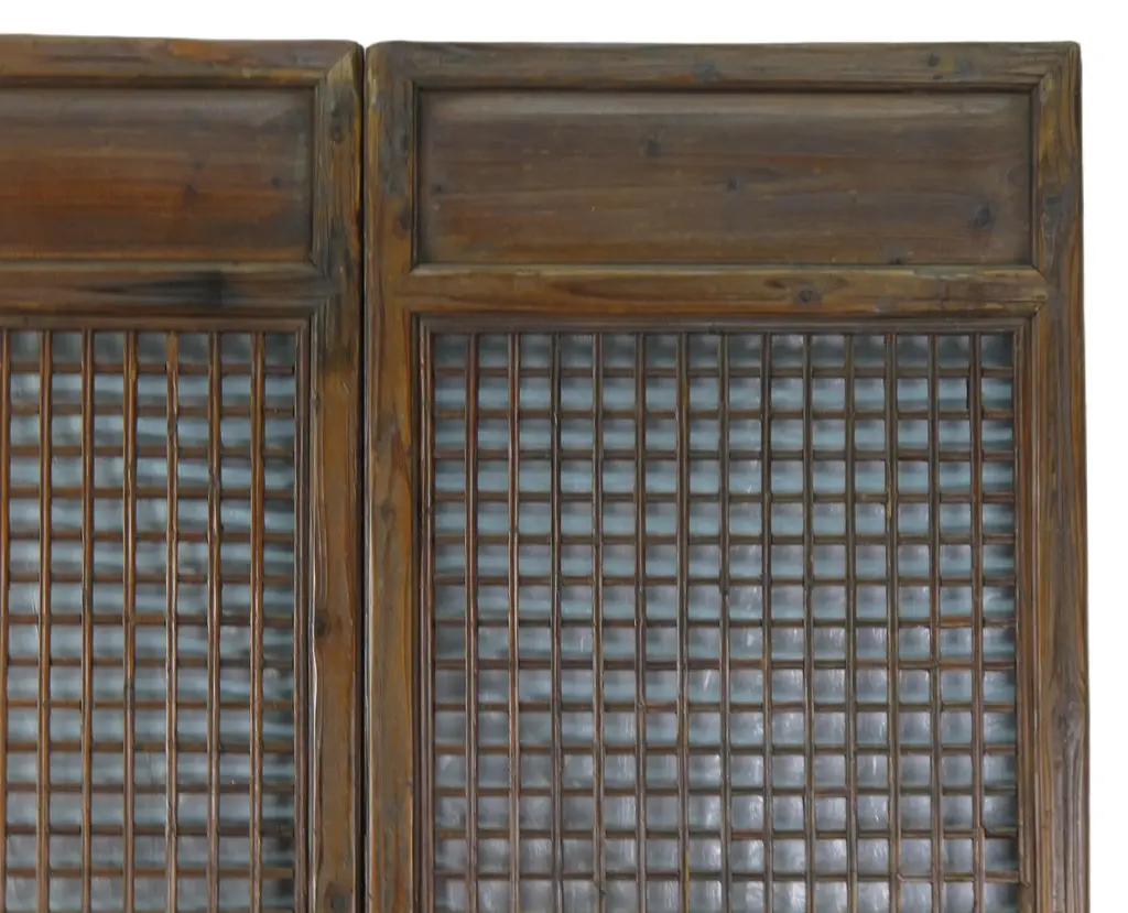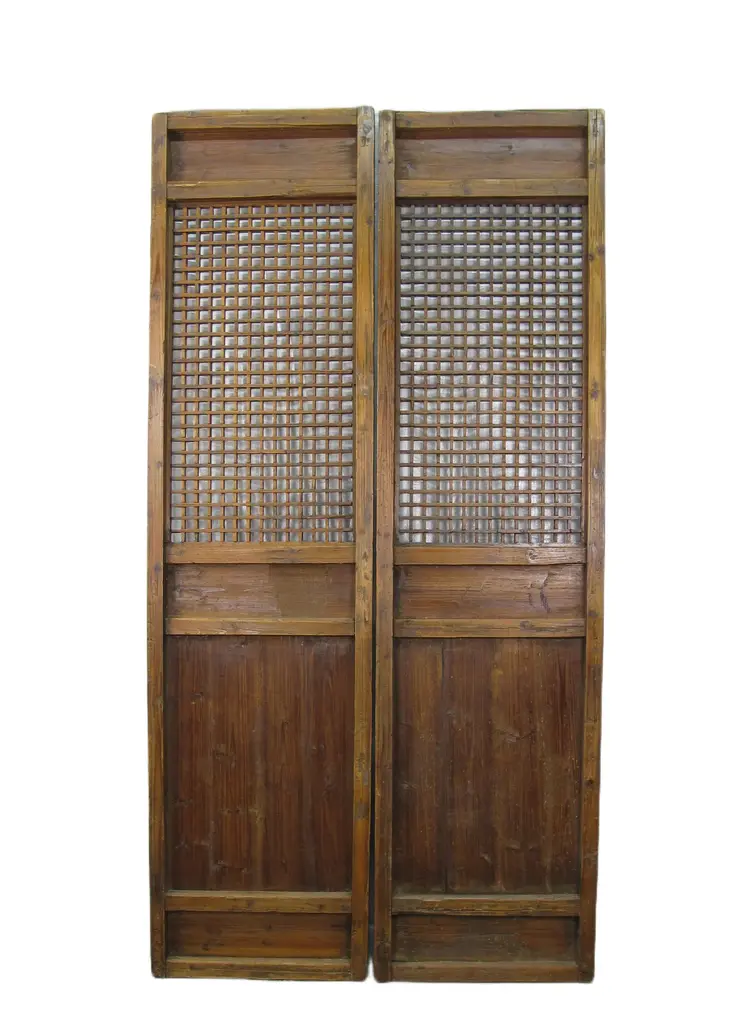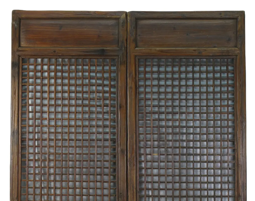 This pair antique Chinese screen door panels showcase hand made small checks lattice patterns. Each lattice panel has over hundred joint points and was tenor and mortise interlocked to allow air to circulate nicely, and sun shines through to creates a mesmerizing visual effect. With their intricate latticework and fine craftsmanship, these screen door panels are a true testament to the superb skill of traditional Chinese artisans. This 2 panel screen set can be used as room divider, screen doors, or a set of wall arts in living room or hall way and will last for generations to admire. These exquisite panels add warmth and elegance to any space. Item No.: DR2222 Dimension: Approx. 25.25"W, 2.75"D, 98.5"H Year: Late 19th century Origin: China Colors: Brown Materials: Pine