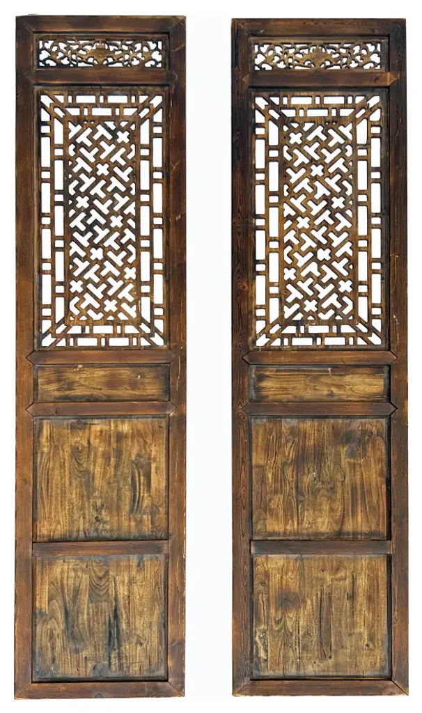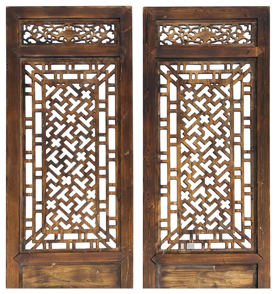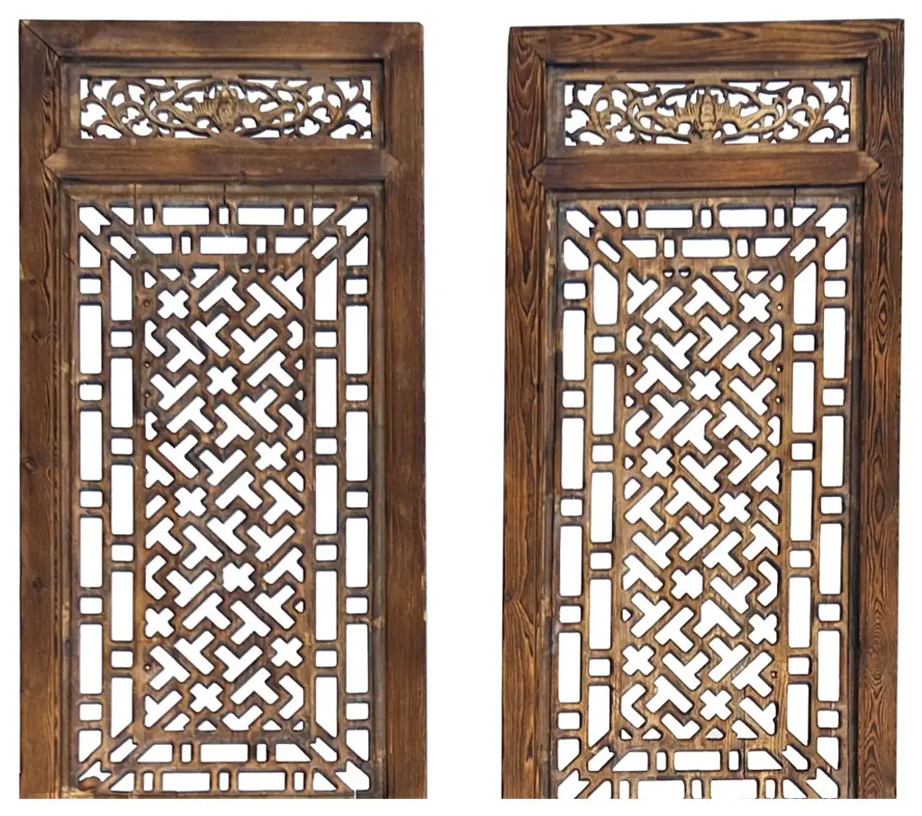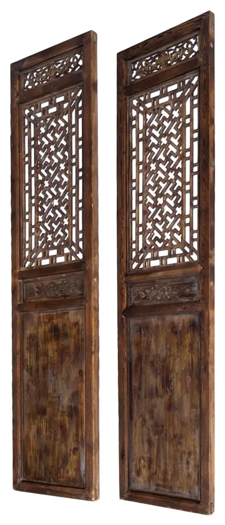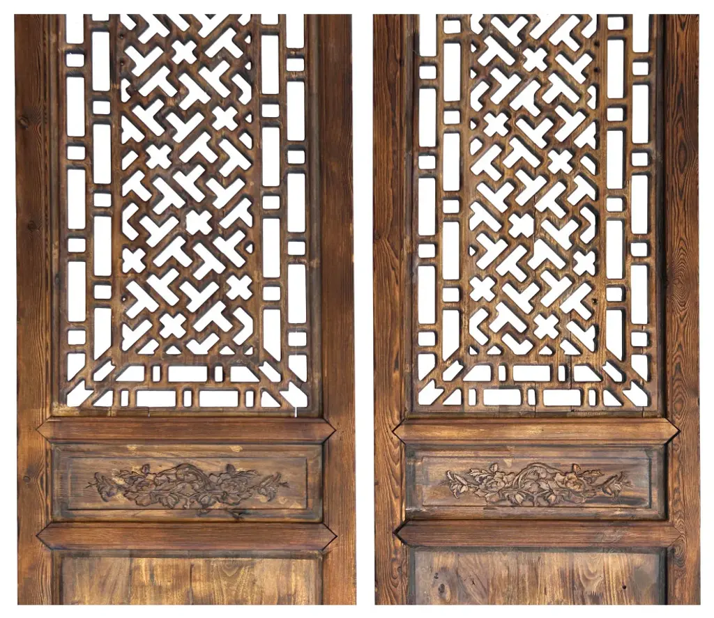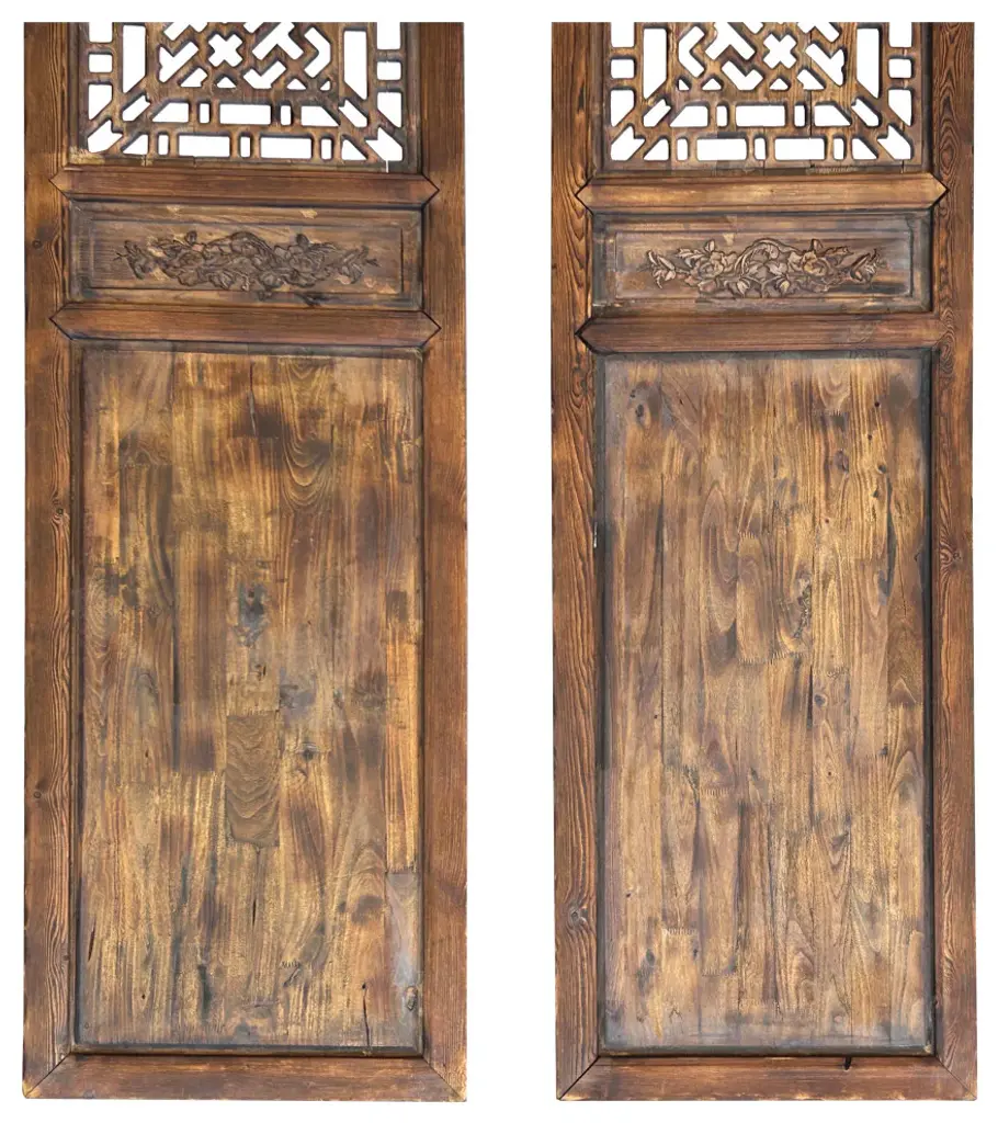 The Pair Oriental Bats Floral Geometric Pattern Tall Wood Door Panel Screen is an exquisite piece of artisanal craftsmanship, blending traditional Oriental design motifs with a contemporary touch. Crafted from high-quality wood, this tall door panel screen stands as a striking fusion of functionality and aesthetic appeal.At first glance, the intricate patterns catch the eye, featuring delicate floral motifs intertwined with geometric shapes, all meticulously hand-carved into the wood. The floral elements, in particular, evoke a sense of tranquility and natural beauty, while the geometric patterns add a touch of sophistication and order.The design is further enriched by the inclusion of bats, a symbol of good fortune and happiness in Oriental culture, subtly incorporated amidst the floral and geometric elements. This symbolic motif infuses the panel screen with an aura of positivity and auspiciousness.Standing tall and commanding, the door panel screen serves both practical and decorative purposes. It can be used to divide spaces, create privacy, or simply act as a stunning focal point in any room. Its rich wooden texture adds warmth and character to any environment, while its intricate design sparks conversation and admiration.Whether adorning the entrance of a room, separating living spaces, or adding a touch of elegance to a hallway, the Pair Oriental Bats Floral Geometric Pattern Tall Wood Door Panel Screen is a timeless masterpiece that elevates any interior décor with its beauty and cultural significance.Dimensions: w23.25" x h98.5" thickness 2" eachOrigin: ChinaMaterial: Elm WoodCondition: hand made, wood joint lines and wood gap crack lines due to dry weatherWe offer a flat shipping fee of $445 for customers in the contiguous United States (48 states) for convenient curbside delivery. (Additional shipping costs will apply to customers in New York, Hawaii, Alaska, US Islands, Florida Keywest, or Canada, based on their specific location). The shipping cost includes insurance and handling charges for added protection.For customers in San Francisco or the Bay Area, we provide local delivery at a cost determined by the distance. You can find the exact cost by entering your zip code during checkout. Alternatively, you can pick up your order in-store with no extra shipping fee.If you need extra care and a white-glove experience, we offer a specialized service with a 4-8 week transit time, tailored to your destination. Contact us for a detailed quote on this service.Upon receiving your shipment, please carefully inspect the exterior packaging while the delivery personnel are present. Note any visible damage on the delivery paperwork, as carriers do not typically honor concealed damage claims. Your cooperation in documenting any visible damage is greatly appreciated