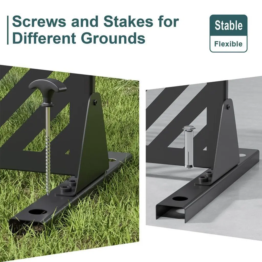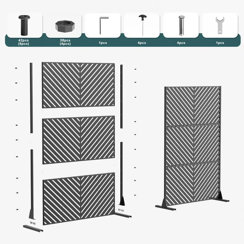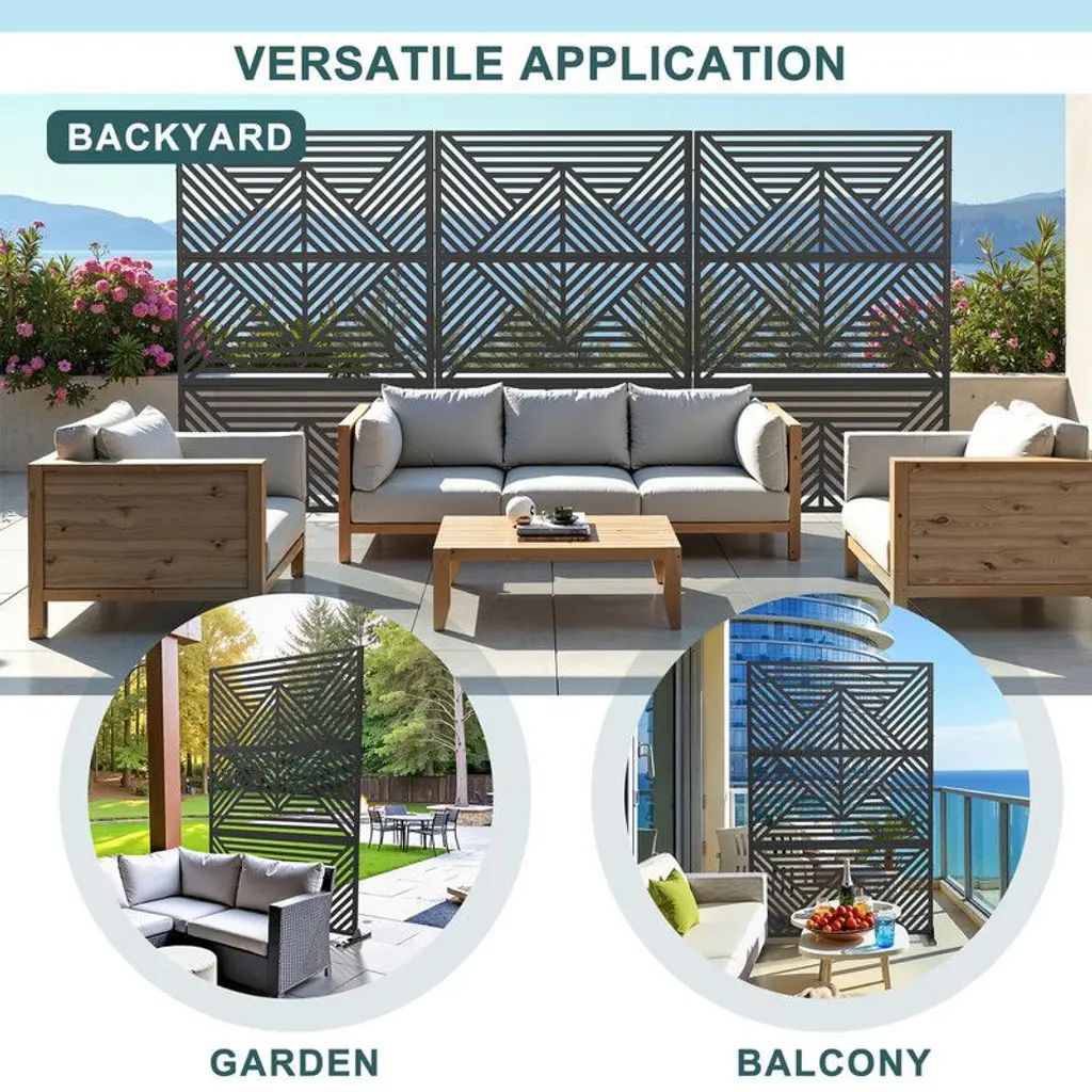 Transform your patio, balcony, or garden into a private oasis with our Freestanding Metal Privacy Screen. Crafted from rust-resistant powder-coated steel, this screen combines durability with modern aesthetics, featuring a decorative geometric pattern that blocks unwanted views while enhancing your outdoor decor. Its sturdy construction withstands rain, UV rays, and snow, ensuring year-round protection without fading or corrosion.