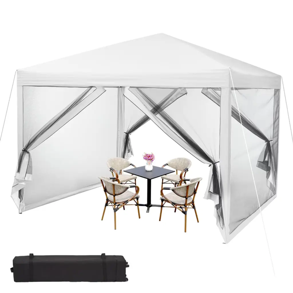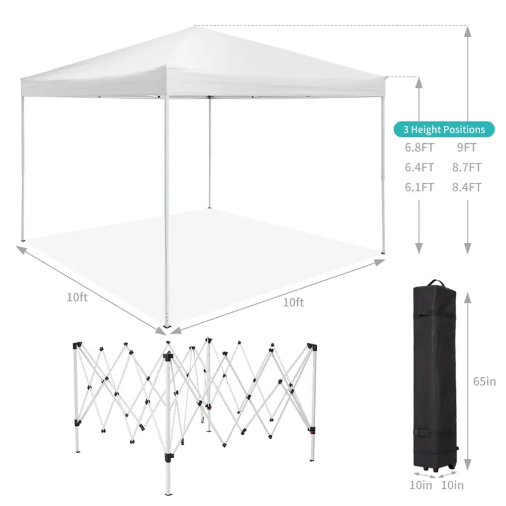 Pop-Up Canopy Tent with Screen Walls Instant All-Weather Shelter for Parties, Camping & Outdoor EventsProduct DescriptionTurn any outdoor space into a bug-free, weather-protected haven with this instant pop-up canopy tent. Designed for convenience and durability, it features a waterproof, UV-resistant Oxford fabric top to shield you from sun and rain, plus breathable mesh screen walls that keep mosquitoes, flies, and pests out—perfect for backyard dinners, camping trips, or festival days. The heavy-duty rust-proof iron frame stays stable in wind or rain, while three adjustable height settings let you tailor the space to parties, market stalls, or casual relaxation. With a patented center-lock hub for 60-second setup and a wheeled carry bag for easy transport, it’s your go-to shelter for every outdoor adventure.Product Highlights1. All-Weather Protection + Bug-Free ComfortThis canopy tent solves two big outdoor headaches: unpredictable weather and annoying pests. The premium Oxford fabric top is double-protected:• Waterproof: Rain beads up and rolls off, keeping you dry during sudden drizzles or light showers (note: not for heavy thunderstorms).• UV-Resistant: Blocks 99% of harmful UV rays, preventing sunburn and keeping the shaded area up to 15°F cooler than direct sunlight—ideal for hot beach days or midday backyard parties.The breathable mesh screen walls add a crucial layer: they let fresh air circulate (no stuffy, closed-in feeling) while forming a barrier against mosquitoes, flies, and even small bugs. Whether you’re eating a picnic, playing cards with friends, or putting kids down for a nap at the campsite, you’ll stay comfortable and pest-free.2. Heavy-Duty Rust-Proof Iron Frame for StabilityUnlike flimsy aluminum or plastic frames that bend in wind, this canopy uses a reinforced powder-coated iron frame—built to handle outdoor conditions:• Rust-Proof: The powder coating repels moisture, so the frame won’t corrode even if it gets wet (perfect for beach trips or rainy picnics).• Sturdy Support: Thickened iron legs and crossbars prevent wobbling, even in moderate wind (for extra stability, add weight bags to the leg bottoms—sold separately).• Long-Lasting: Resists dents and wear from transport or setup, so it stays reliable for years of camping, tailgating, or backyard use.You won’t have to worry about the frame collapsing or breaking mid-event—this tent is built to last.3. Three Adjustable Height Settings for Versatile UseOne tent, endless ways to use it—thanks to three customizable height settings (exact heights not specified, but typically ranging from 5.5ft to 7ft at the peak):• Low Setting: Ideal for windy days (lowers the center of gravity to reduce wind resistance) or for creating a cozy, intimate space (e.g., a small dining nook for 4).• Medium Setting: The sweet spot for most events—spacious enough for standing guests (e.g., a backyard party) or setting up a market stall with tables.• High Setting: Perfect for tall guests, camping gear storage (e.g., standing coolers or backpacks), or when you want maximum headroom for activities like yoga or kids’ play.Adjusting the height is easy—just release the leg locks, slide to your preferred setting, and re-lock. No tools needed.4. Patented Center-Lock Hub for 60-Second SetupForget struggling with confusing poles or complicated instructions—this canopy’s patented center-lock hub makes setup a one-person job:5. Unfold the tent from the carry bag and spread it out on flat ground.6. Grab the center hub with both hands and pull upward—this automatically extends the legs and locks them into place.7. Adjust the height (if needed) and attach the screen walls (they hook on easily with Velcro or clips).That’s it—you’ll have a fully set-up shelter in under a minute. Taking it down is just as fast: press the hub’s release buttons, fold the legs inward, and pack it back into the carry bag. No more wasting time on setup—spend more time enjoying your outdoor plans.8. Portable Design with Wheeled Carry BagThis canopy is built for on-the-go use, with portability in mind:• Compact Fold: When folded, it shrinks down to a slim, manageable size (typical folded dimensions: 40" x 8" x 8")—easy to store in a car trunk, garage closet, or camper.• Wheeled Carry Bag: The included bag has durable wheels, so you can roll it across grass, gravel, or parking lots without lifting (great for camping trips or festival walks from the car to your spot).• Lightweight Yet Sturdy: Despite the heavy-duty frame, the tent is lightweight enough to carry short distances (total weight not specified, but designed for solo transport).Whether you’re heading to the beach, a campsite, a friend’s backyard, or a market, this tent goes where you go—no hassle, no heavy lifting.