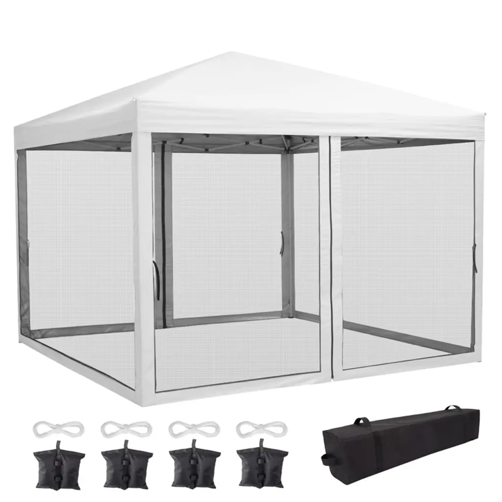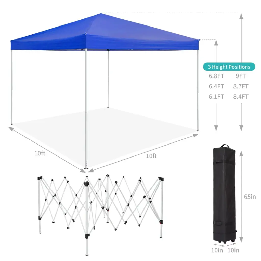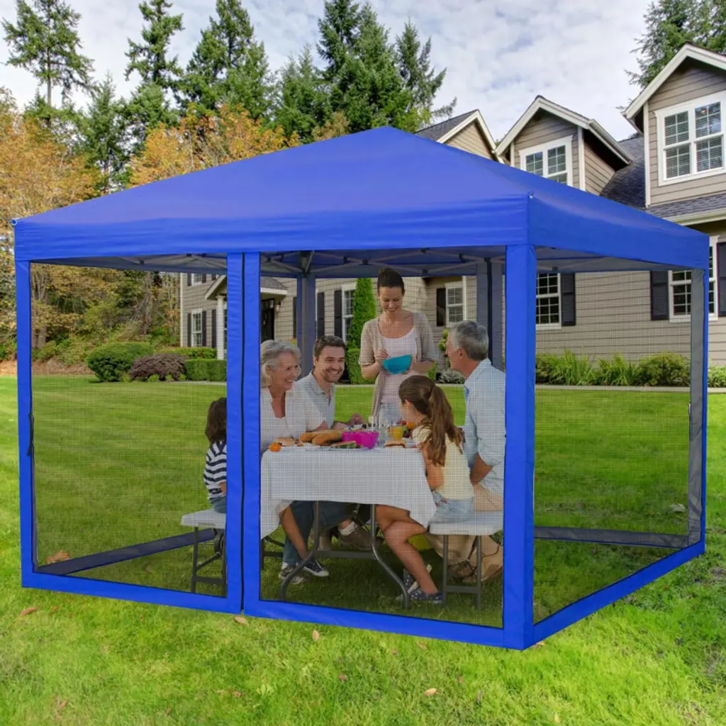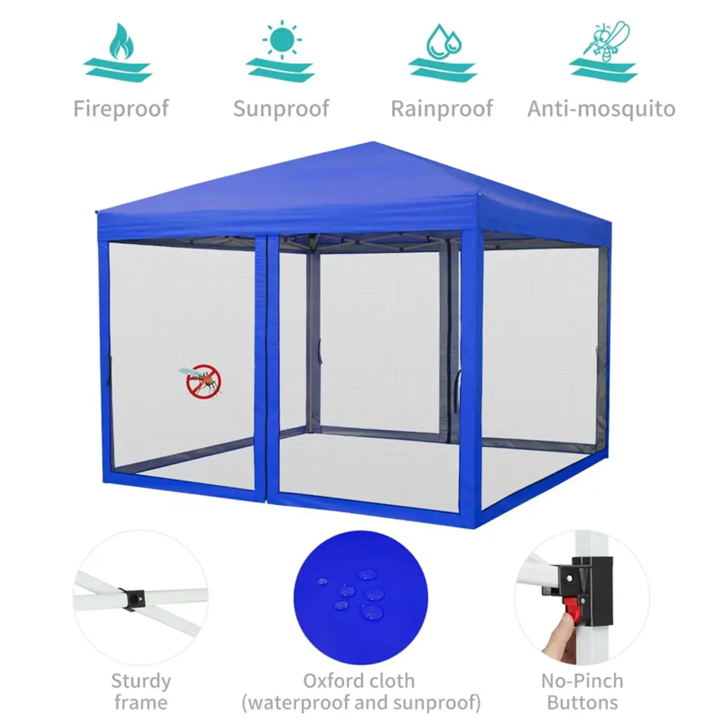 Pop-Up Canopy Tent with Screen Walls Instant All-Weather Shelter for Parties, Camping & Outdoor EventsProduct DescriptionTurn any outdoor space into a bug-free, weather-protected haven with this instant pop-up canopy tent. Designed for convenience and durability, it features a waterproof, UV-resistant Oxford fabric top to shield you from sun and rain, plus breathable mesh screen walls that keep mosquitoes, flies, and pests out—perfect for backyard dinners, camping trips, or festival days. The heavy-duty rust-proof iron frame stays stable in wind or rain, while three adjustable height settings let you tailor the space to parties, market stalls, or casual relaxation. With a patented center-lock hub for 60-second setup and a wheeled carry bag for easy transport, it’s your go-to shelter for every outdoor adventure.Product Highlights1. All-Weather Protection + Bug-Free ComfortThis canopy tent solves two big outdoor headaches: unpredictable weather and annoying pests. The premium Oxford fabric top is double-protected:• Waterproof: Rain beads up and rolls off, keeping you dry during sudden drizzles or light showers (note: not for heavy thunderstorms).• UV-Resistant: Blocks 99% of harmful UV rays, preventing sunburn and keeping the shaded area up to 15°F cooler than direct sunlight—ideal for hot beach days or midday backyard parties.The breathable mesh screen walls add a crucial layer: they let fresh air circulate (no stuffy, closed-in feeling) while forming a barrier against mosquitoes, flies, and even small bugs. Whether you’re eating a picnic, playing cards with friends, or putting kids down for a nap at the campsite, you’ll stay comfortable and pest-free.2. Heavy-Duty Rust-Proof Iron Frame for StabilityUnlike flimsy aluminum or plastic frames that bend in wind, this canopy uses a reinforced powder-coated iron frame—built to handle outdoor conditions:• Rust-Proof: The powder coating repels moisture, so the frame won’t corrode even if it gets wet (perfect for beach trips or rainy picnics).• Sturdy Support: Thickened iron legs and crossbars prevent wobbling, even in moderate wind (for extra stability, add weight bags to the leg bottoms—sold separately).• Long-Lasting: Resists dents and wear from transport or setup, so it stays reliable for years of camping, tailgating, or backyard use.You won’t have to worry about the frame collapsing or breaking mid-event—this tent is built to last.3. Three Adjustable Height Settings for Versatile UseOne tent, endless ways to use it—thanks to three customizable height settings (exact heights not specified, but typically ranging from 5.5ft to 7ft at the peak):• Low Setting: Ideal for windy days (lowers the center of gravity to reduce wind resistance) or for creating a cozy, intimate space (e.g., a small dining nook for 4).• Medium Setting: The sweet spot for most events—spacious enough for standing guests (e.g., a backyard party) or setting up a market stall with tables.• High Setting: Perfect for tall guests, camping gear storage (e.g., standing coolers or backpacks), or when you want maximum headroom for activities like yoga or kids’ play.Adjusting the height is easy—just release the leg locks, slide to your preferred setting, and re-lock. No tools needed.4. Patented Center-Lock Hub for 60-Second SetupForget struggling with confusing poles or complicated instructions—this canopy’s patented center-lock hub makes setup a one-person job:5. Unfold the tent from the carry bag and spread it out on flat ground.6. Grab the center hub with both hands and pull upward—this automatically extends the legs and locks them into place.7. Adjust the height (if needed) and attach the screen walls (they hook on easily with Velcro or clips).That’s it—you’ll have a fully set-up shelter in under a minute. Taking it down is just as fast: press the hub’s release buttons, fold the legs inward, and pack it back into the carry bag. No more wasting time on setup—spend more time enjoying your outdoor plans.8. Portable Design with Wheeled Carry BagThis canopy is built for on-the-go use, with portability in mind:• Compact Fold: When folded, it shrinks down to a slim, manageable size (typical folded dimensions: 40" x 8" x 8")—easy to store in a car trunk, garage closet, or camper.• Wheeled Carry Bag: The included bag has durable wheels, so you can roll it across grass, gravel, or parking lots without lifting (great for camping trips or festival walks from the car to your spot).• Lightweight Yet Sturdy: Despite the heavy-duty frame, the tent is lightweight enough to carry short distances (total weight not specified, but designed for solo transport).Whether you’re heading to the beach, a campsite, a friend’s backyard, or a market, this tent goes where you go—no hassle, no heavy lifting.