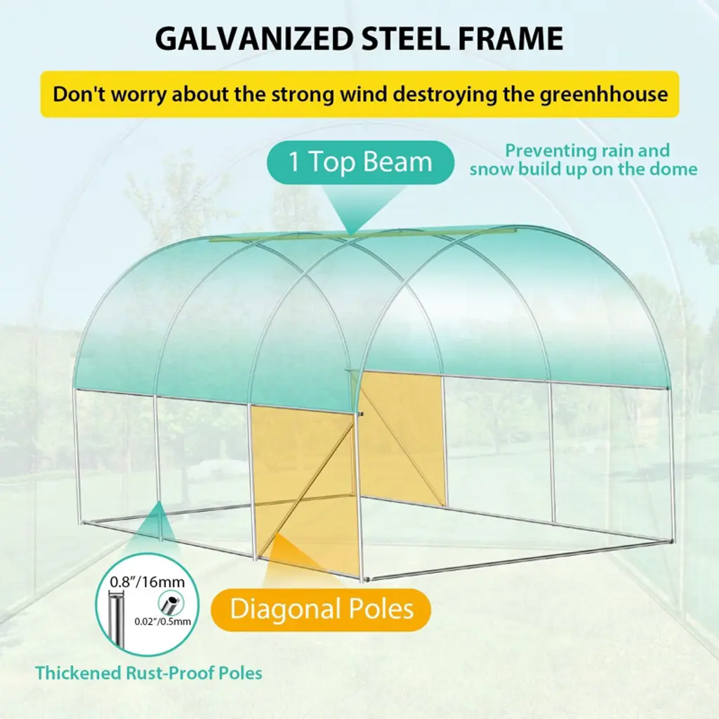 Our walk - in tunnel greenhouse is a top - notch choice for gardening enthusiasts, offering a range of high - quality features. The durable 140G green PE grid fabric cover provides excellent light transmission and insulation, effectively regulating internal temperatures to encourage plant growth, especially during winter months, making it ideal for winter gardening. Its robust galvanized pipe frame (19x0.6) ensures outstanding stability and long - lasting durability, with the galvanized construction preventing rust for use in various outdoor environments. The specially designed widthened bottom enhances stability and wind resistance, protecting plants from external weather impacts like bright sunshine or snowstorms. For ventilation and access, it has six mesh windows and a convenient zipper roll door that can be fully opened, improving air circulation, keeping pests out, and providing easy access. Additionally, it's easy to assemble with all necessary installation accessories included, such as white gloves, screws, a wrench, ground pegs, and guy ropes, requiring no professional skills and making it accessible to all.
