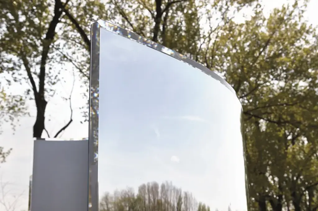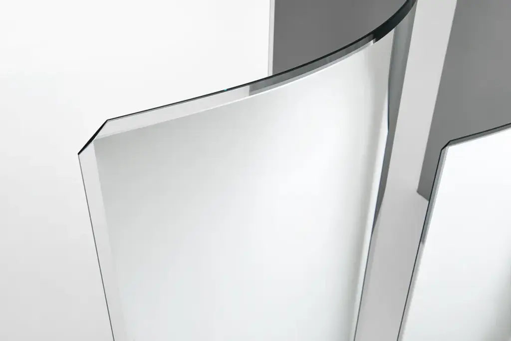 Prism Partition is a screen in 8 mm thick extralight glass, hand-curved and silvered, available in two different sizes. The corners are smoothed, whilst the vertical and the upper side are embellished with transparent edges with a large chamfer. On the reverse there is a safety anti-crushing film in silver colour.Attention, curved mirror can present irregularities adn small imperfections