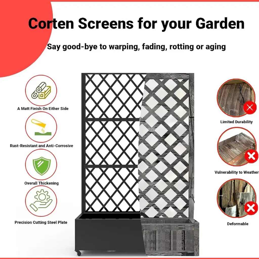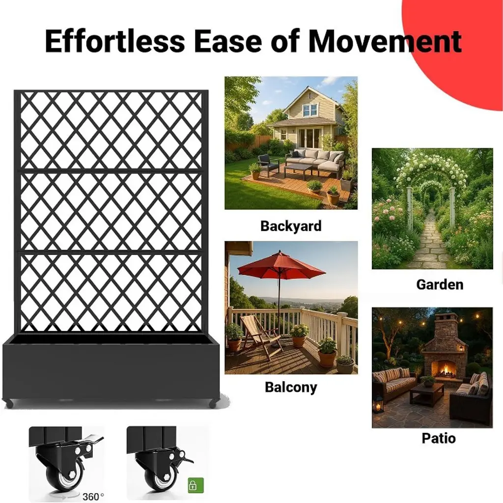 Product DescriptionPerfect for homeowners, gardeners, and outdoor enthusiasts, this product offers a seamless blend of natural privacy enhancement and modern outdoor decor. Whether you want to block unwelcome views, create a green oasis with climbing vines, or simply add a stylish element to your garden, this metal privacy screen provides a reliable and beautiful solution.Perfect For✔ Urban gardeners with limited space✔ Patio & balcony privacy screens✔ Decorative garden trellises✔ Mobile herb & vegetable plantersProduct InformationColor: BlackPattern Style: lattice, Tree, GeometricMaterial: MetalDimensions: 15.7"D x 47"W x 72"H Weight: 50.7 PoundsPacking List1 x Metal Privacy Screen1 x Instructions1 x Assembly Kit