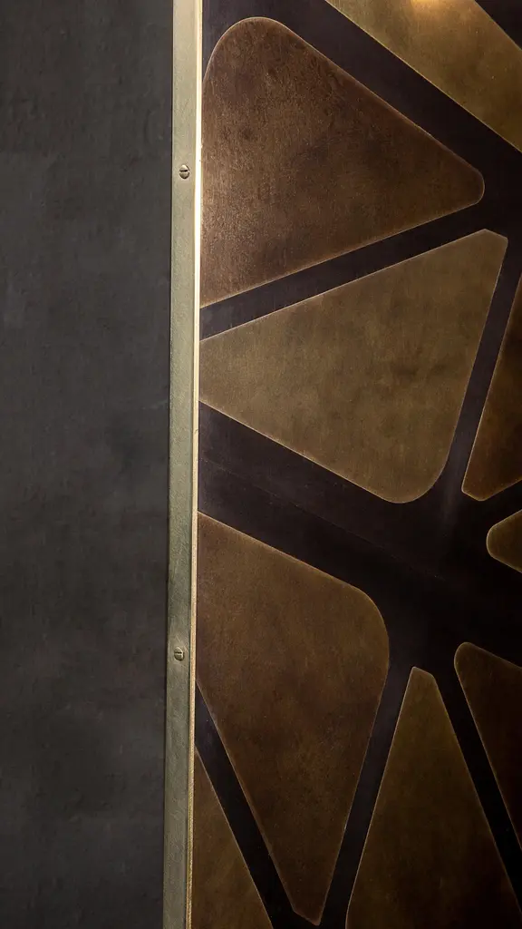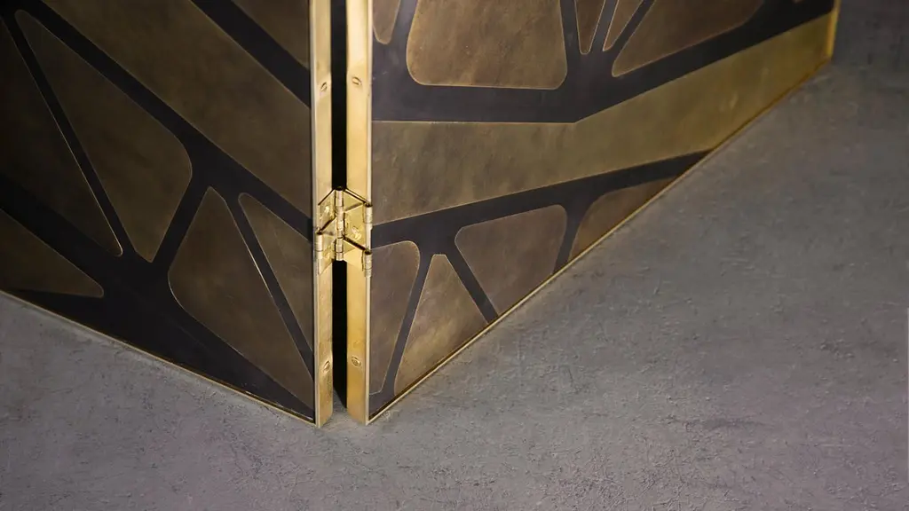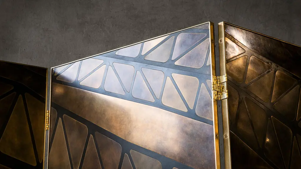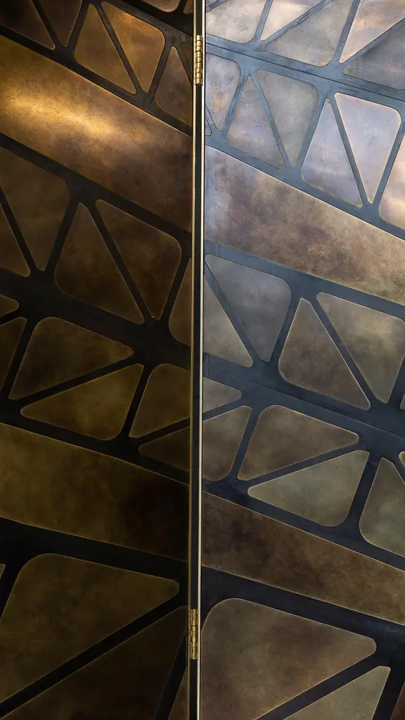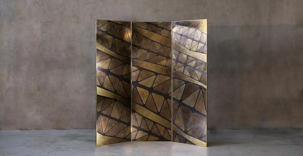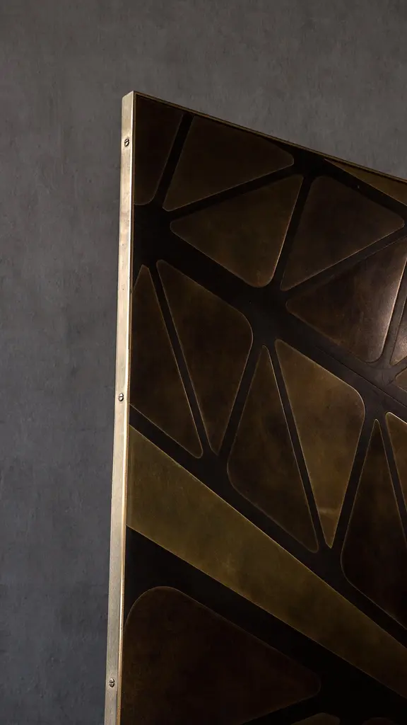 A three-panelled feature screen in patinated brass, inspired by one of the iconic bridges which cross the River Tyne. Hand crafted in the North to order. Custom sizes and finishes are available.Measures: 180cm (width) x 180cm (height) x 2cm (depth).Custom sizes available.Made to order in 12 weeks.Price excludes VAT.