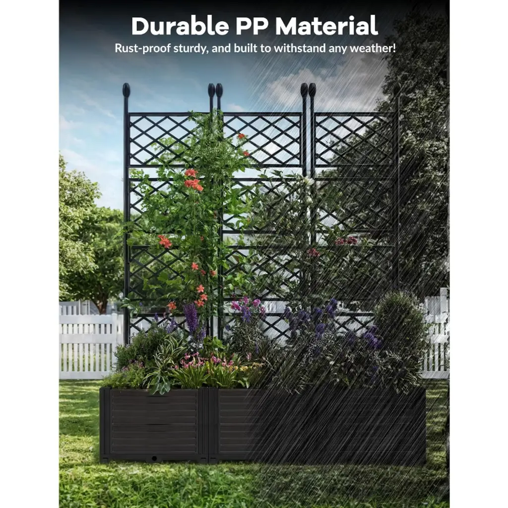 Transform your outdoor space with this dual-purpose planter box featuring an integrated metal trellis perfect for climbing plants, vegetables, or flowers. The durable plastic construction resists rot and weathering, while the convenient drain plug prevents overwatering. The attached powder-coated steel trellis creates a beautiful vertical garden that doubles as a natural privacy screen. Ideal for patios, decks, or small yards, this elevated garden bed brings ergonomic planting height and stylish greenery to your outdoor living area.