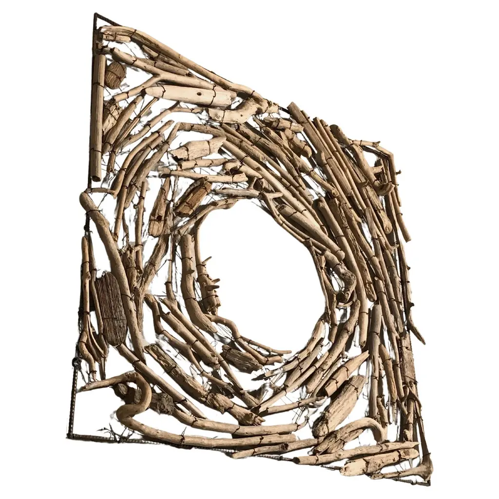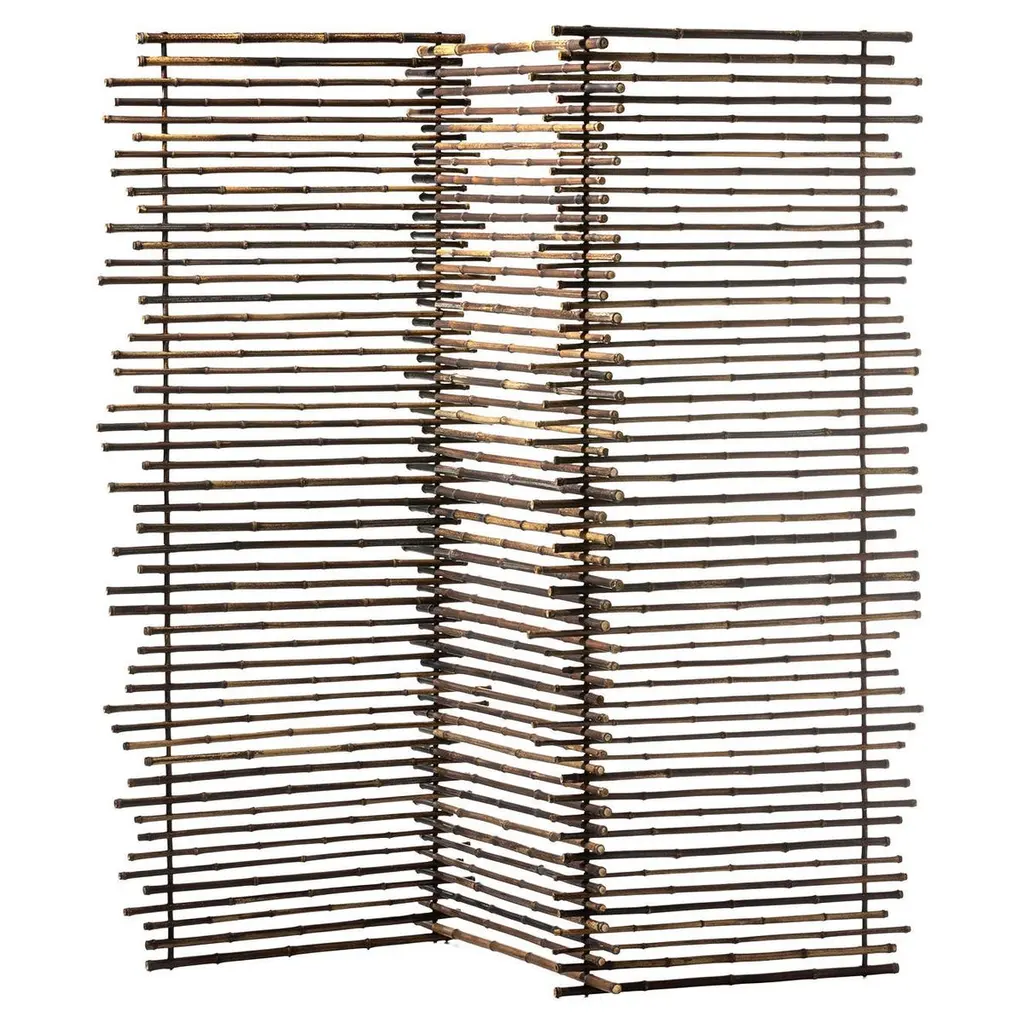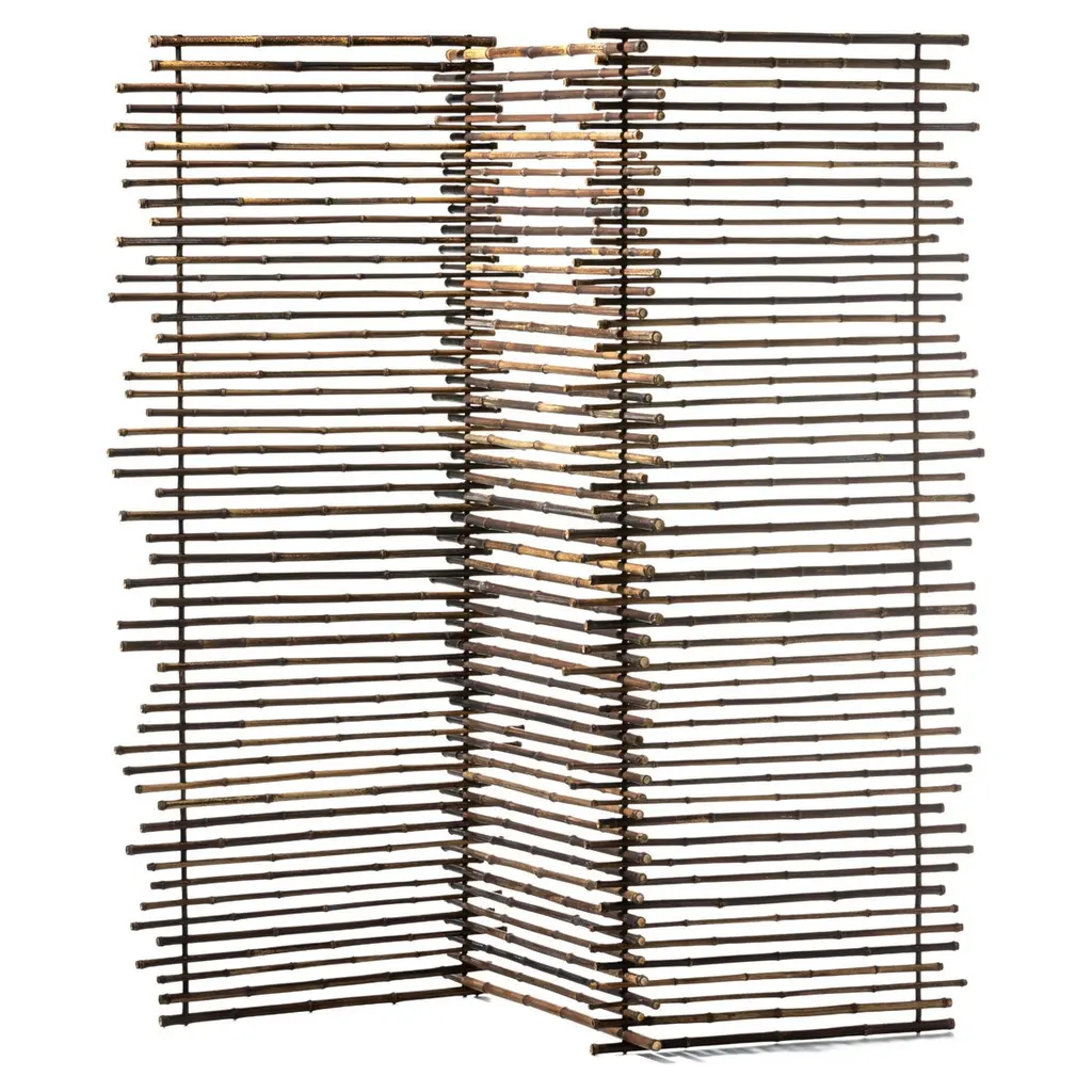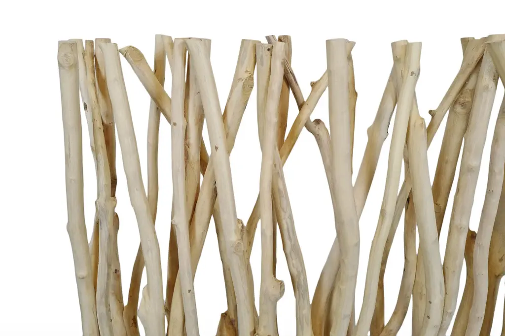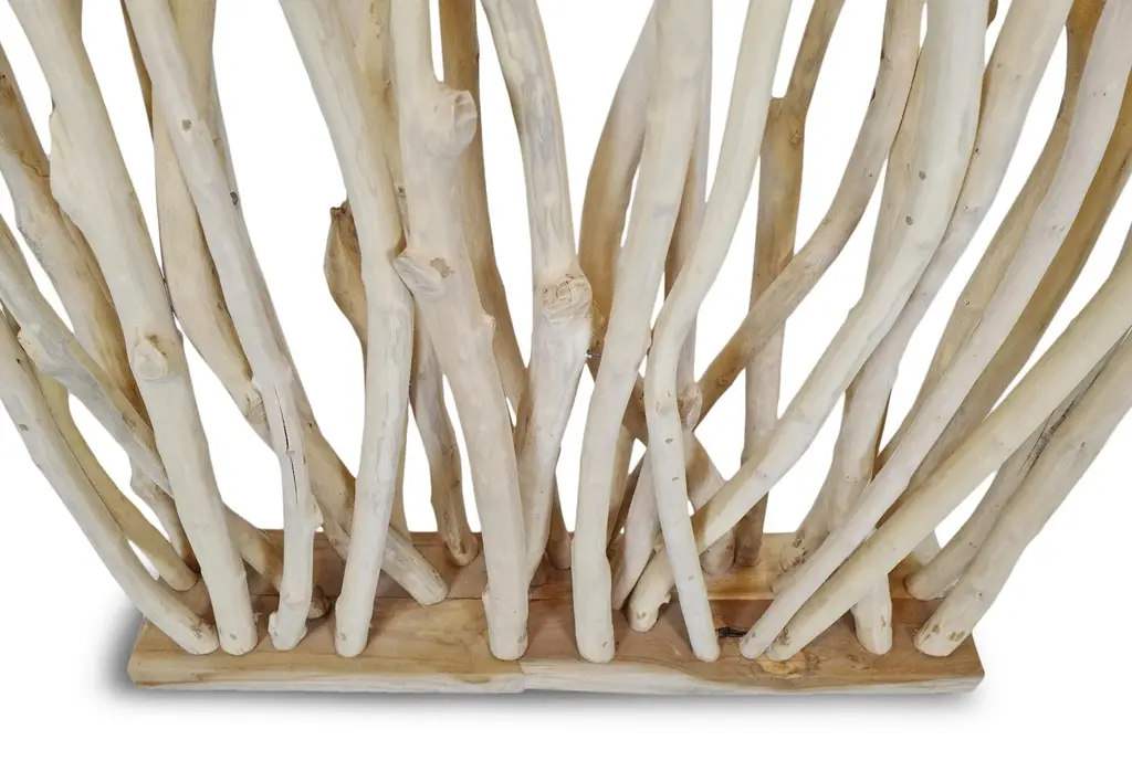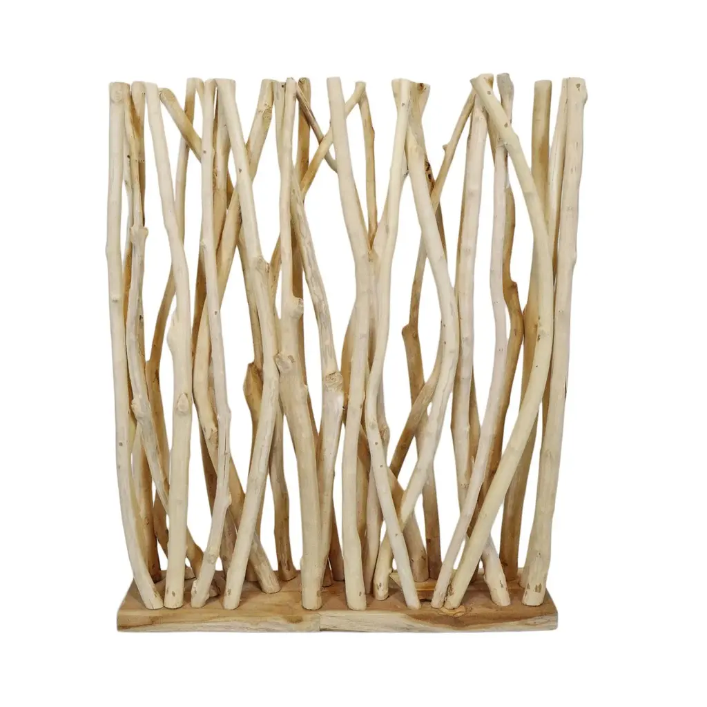 Free standing raw bleached stick wood screen or room divider piece. Intertwined 47" high free form narrow design with many uses such as room or outdoor space separation and for many display purposes. Each is unique.