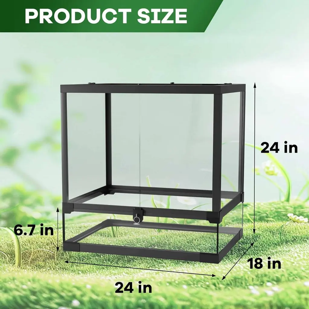 ANTI-ESCAPE DESIGN: The 4 safety clasps on the lid ensure that the terrarium tank closes tightly, preventing your reptile amphibian chameleon pet from escaping. The security lock prevents your child from accidentally opening the door of the tank, ensuring your child's safety. FREEDOM TO CHANGE BOTH ENVIRONMENTS: A 6.3inch water-tight base allows this reptile tank to be used as either a desert terrarium or a rainforest terrarium. This tall terrarium tank is suitable for normal reptile amphibian pets such as lizards, frogs, snakes, tortoises and more. TEMPERED GLASS TANK: This reptile terrarium is made of high quality 4.8mm tempered glass. Durable and with good light transmission, you can observe and interact with your pets easily. Make this tank a bright spot in your home! TOP SCREEN VENTILATION: The wire top screen provides ventilation, allowing UV and infrared rays to penetrate, as well as making it easy for you to clean and feed. The top screen has pre-drilled wire entry holes for easy organization of wires and tubes. QUICK 5-MINUTE INSTALLATION: This tank is so easy to install that one person can set it up or take it down in less than 5 minutes. Just follow the steps in the instructions you will soon be able to set up the perfect glass terrarium for your beloved pet.