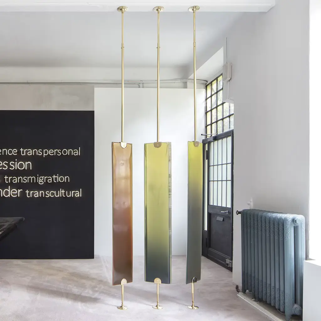 Exploring transparency in epoxy resin, Reverso is a dual-facing room divider that adds a colored veil to the surrounding space. The soft, shaded nuances are achieved through a handcrafted resin-casting technique, carried out entirely by skilled artisans in our atelier. A semi-gloss brass frame allows the partition to rotate on its axis. Available in different colors.