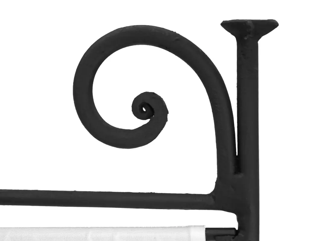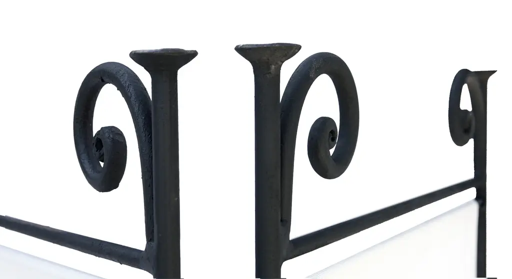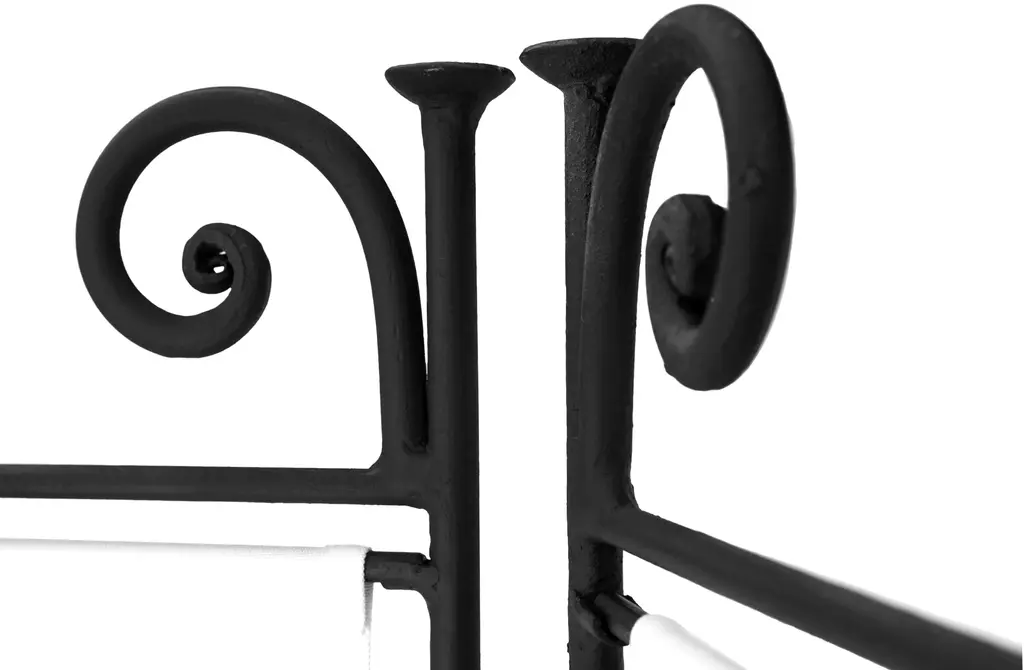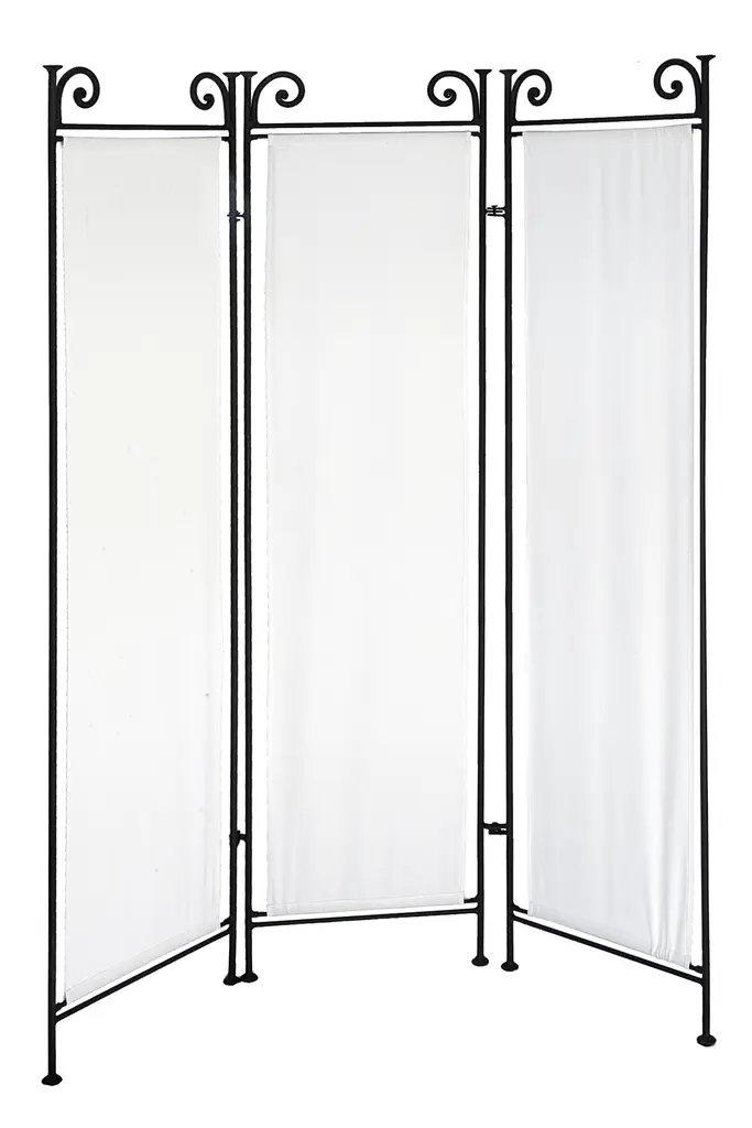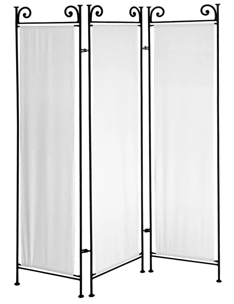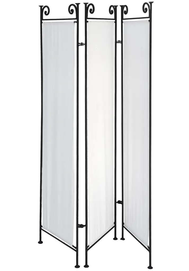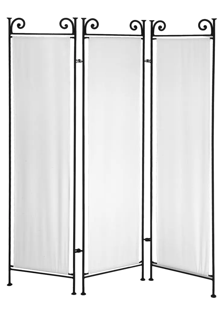 Freestanding wrought iron three-paneled folding screens with custom-made Sunbrella fabric panels, making it possible to use both indoors & out. Professionally painted in soft black. Sturdy frame with great bearing. Easy to store when not in use. This item has been professionally refinished with new Sunbrella panels.