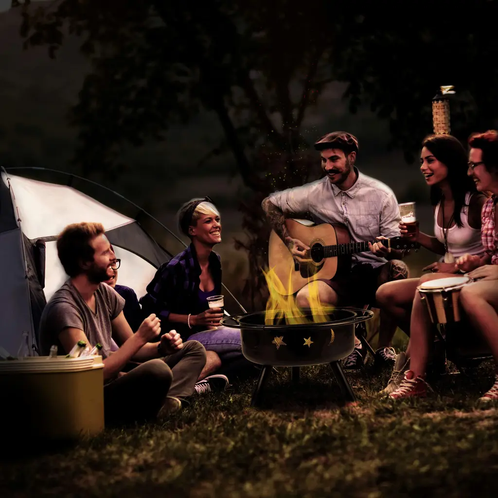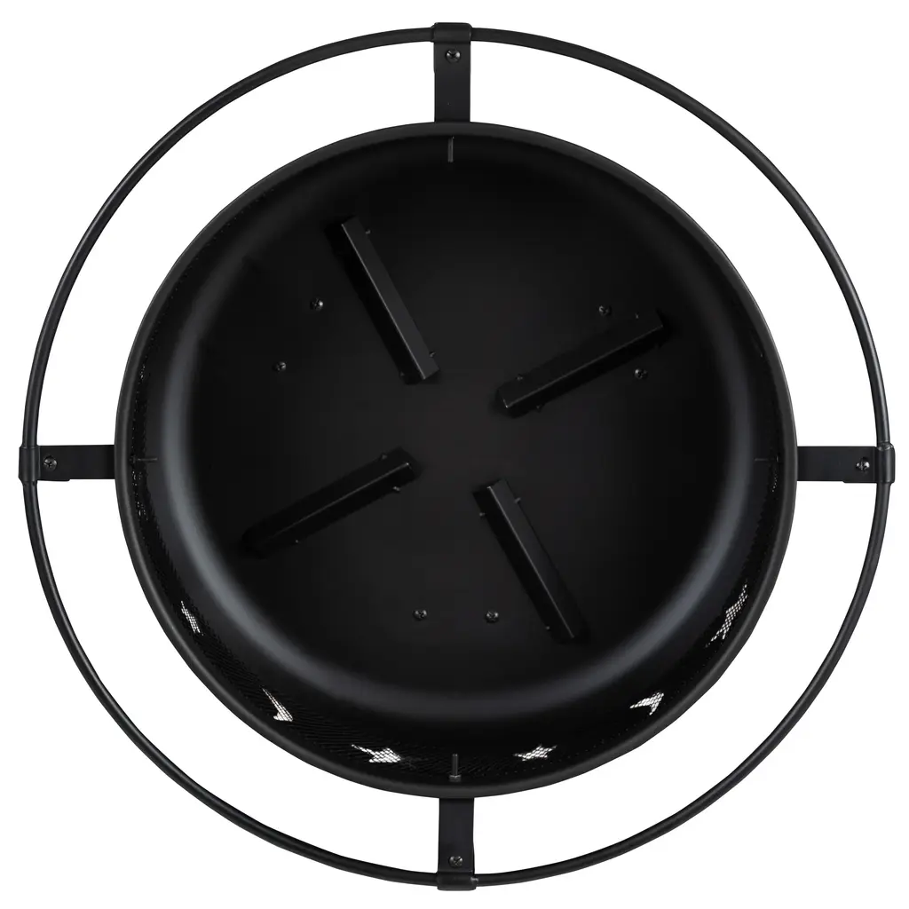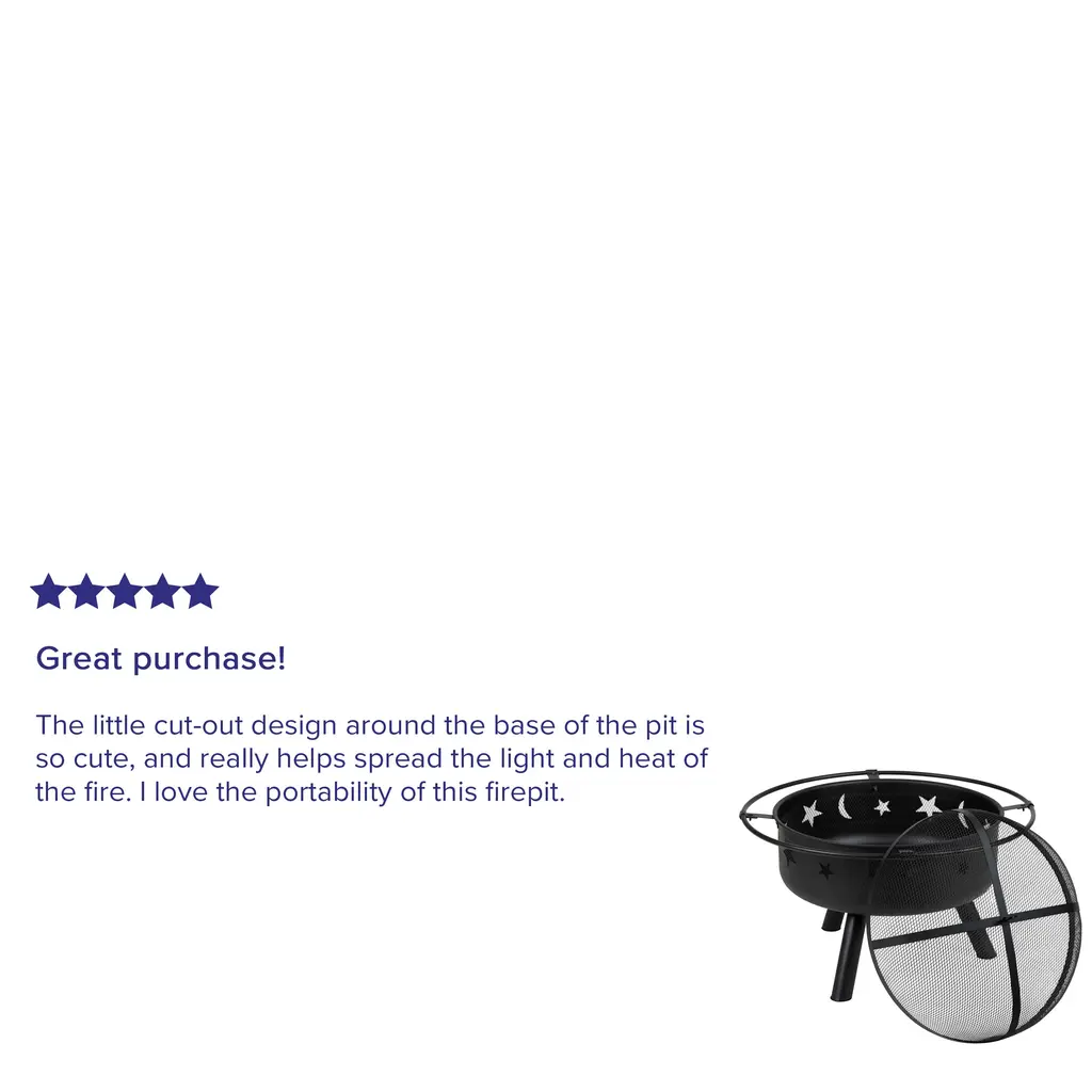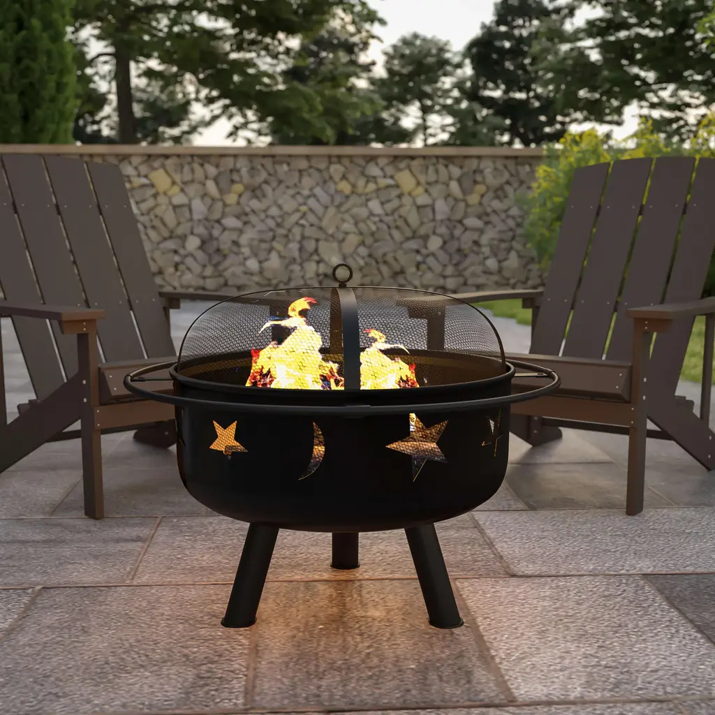 Grab your bag of marshmallows, that superbly comfy sweatshirt and blanket and hang out around this wood burning fire pit with friends and family. The moon and stars in the sky won't be the only ones you see with this outdoor wood fire pit. This gorgeous piece has moon and star cutouts on the sides that provide ventilation for continual burning while adding charm with a bit of whimsy to your backyard. This fire pit has an attractive finish and comes with a mesh top to prevent sparks from escaping. This round backyard fire pit is made of iron for long lasting durability and has a high temperature coating that will look great season after season. Assembly takes less than 10 minutes so you can get down to the business of relaxing. Clean the exterior with a mild dishwashing detergent or baking soda. For stubborn areas use a citrus based degreaser and a nylon scrub brush. Purchase several of this bonfire fire pit and make great memories at home, the beach or at the campground. Pair this metal fire pit with our all-weather adirondack chairs or all-weather rocking chairs to unwind and let your worries go.