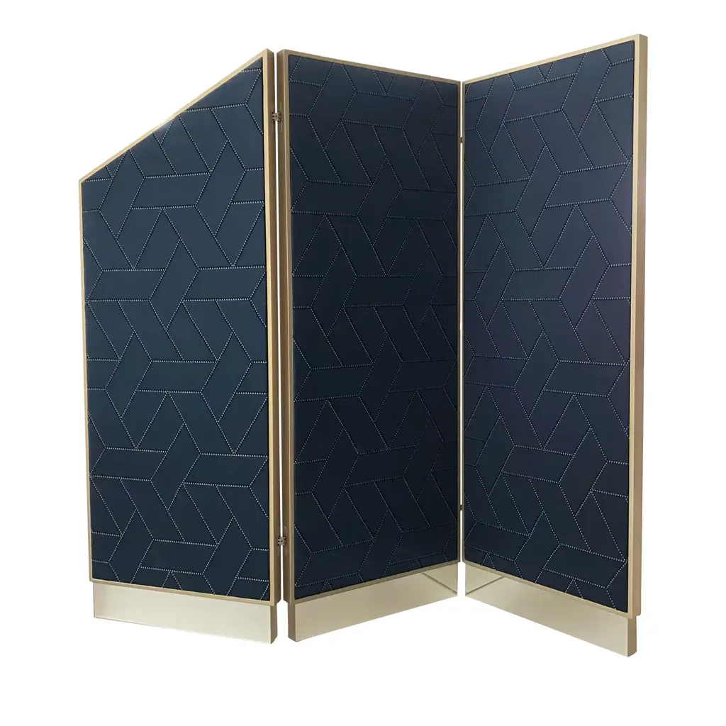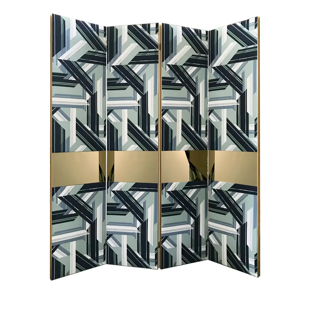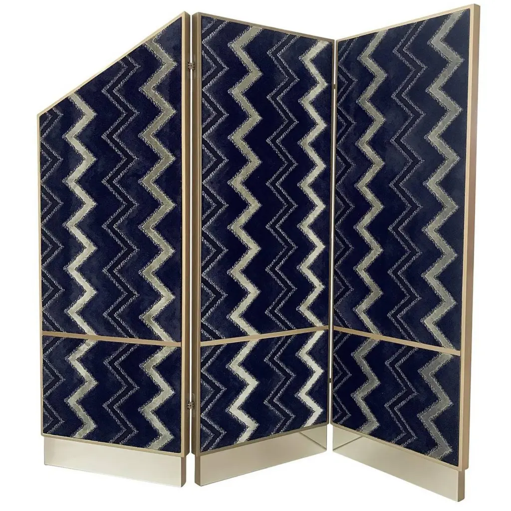 This superb screen was made entirely by master craftsmen using artisanal techniques. Its geometric silhouette, inspired by art deco, will enrich any decor. The three panels rest on a mirrored base with a light silver finish, which appears also in the two back panels. The structure is in brushed brass that adds a sophisticated accent to the panels and complements the abstract decorative patterns of the fabric that upholsters them in an elegant dark blue color with golden and black inlays.
