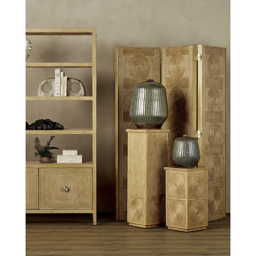 The Santos Sea Sand Screen has a split rattan pattern on both sides of each folding section, which is made by hand and applied to a solid mahogany frame. Then a sea sand finish is applied to the entire piece. A design detail of note is how the five layered circular patterns flow into the horizontal segments of the pattern to create textural interest. This tan room screen was designed by Aimee Kurzner.