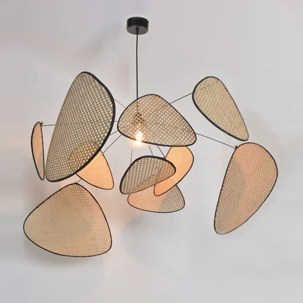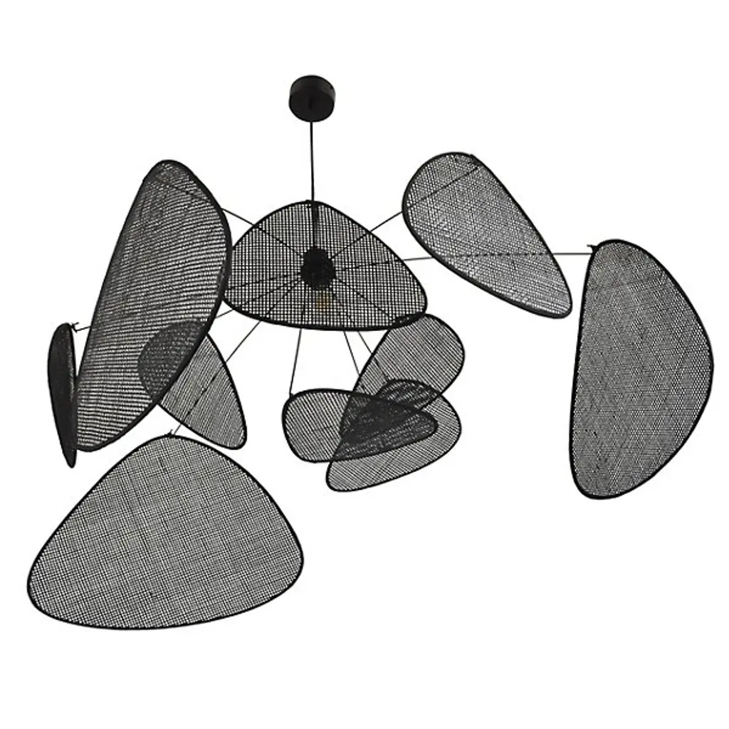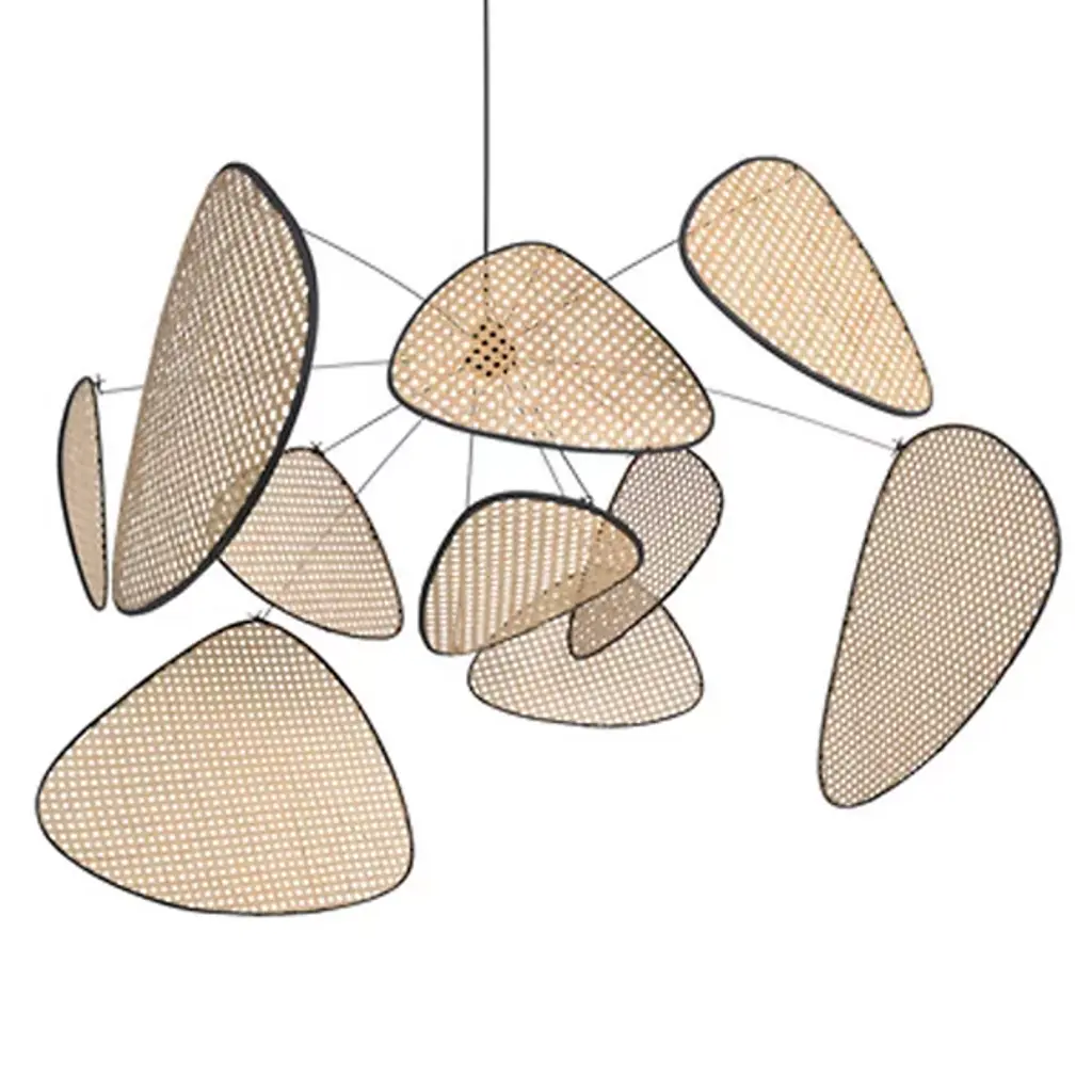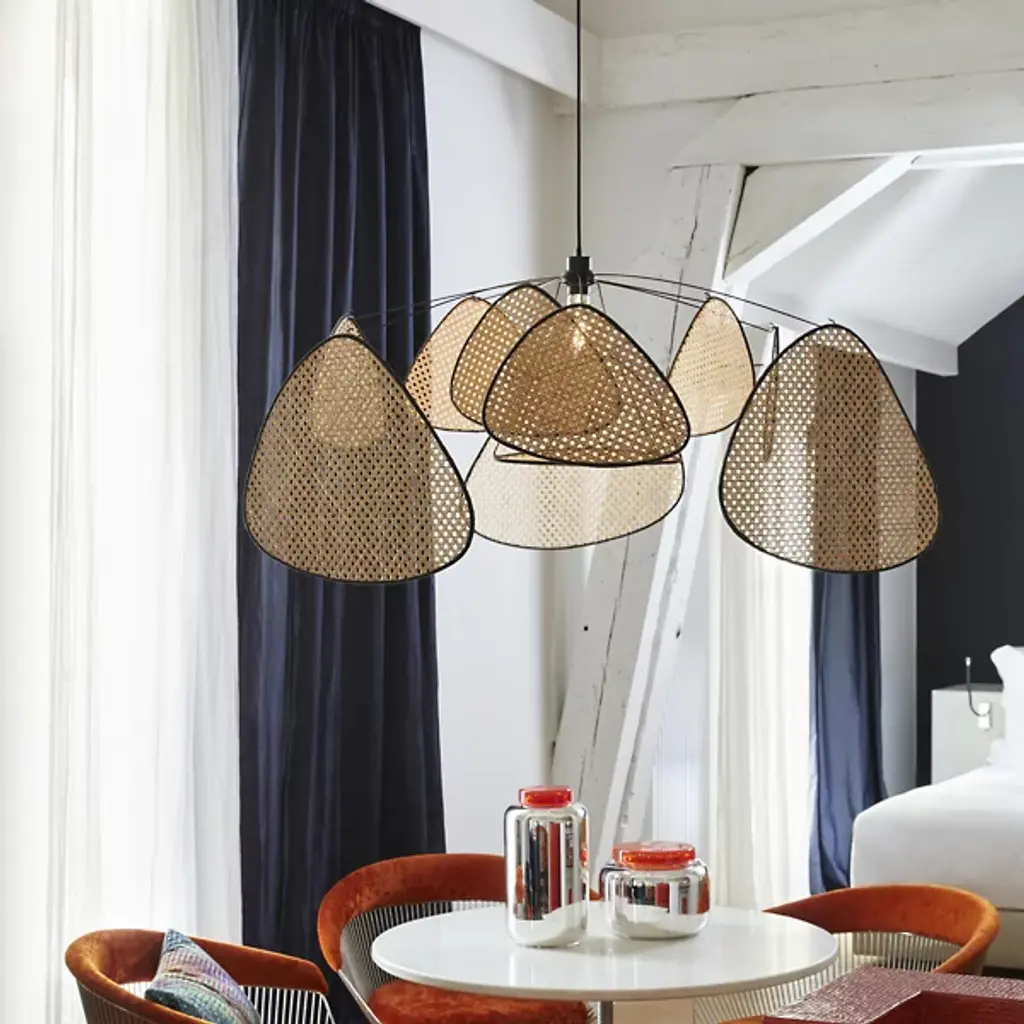 The Screen Chandelier from Market Set is an airy, graphic wonder inspired by traditional Japanese craftsmanship. The studio at Market set infuses each piece with a contemporary aesthetic and a chic, graphic look. The chandelier’s chic side shows with a fine fabric suspension. A series of painted metal arms shoot out from the core as delicate lines. Exuding retro charm, abstract shades hang above with a weightless feeling around the core bulb to eliminate glare. The shades sport an intricate cane work mesh that delivers a bold silhouette and a comfortable filtered glow.