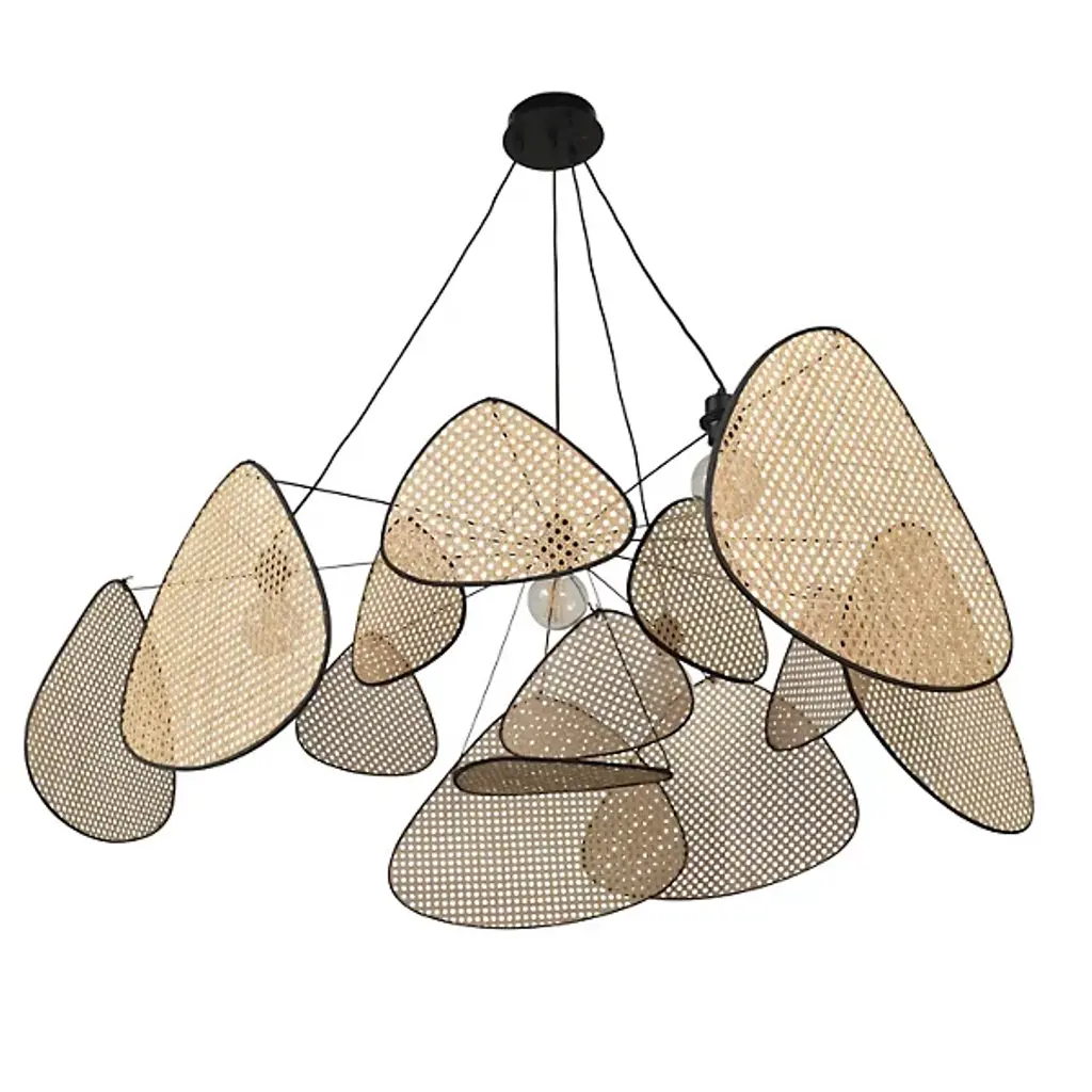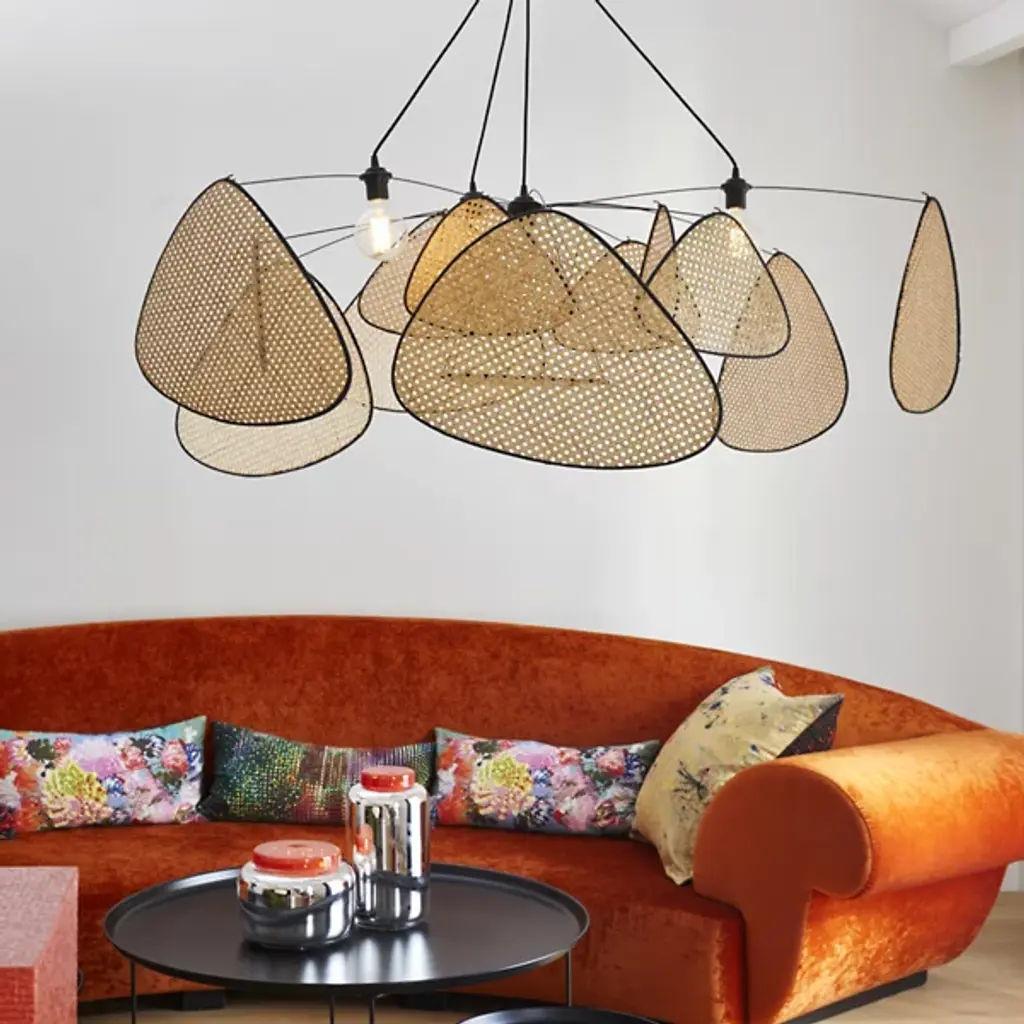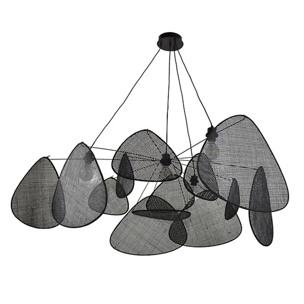 The Screen Chandelier from Market Set is an airy, graphic wonder inspired by traditional Japanese craftsmanship. The studio at Market set infuses each piece with a contemporary aesthetic and a chic, graphic look. The chandelier’s chic side shows with a fine fabric suspension. A series of painted metal arms shoot out from the core as delicate lines. Exuding retro charm, abstract shades hang above with a weightless feeling around the core bulb to eliminate glare. The shades sport an intricate cane work mesh that delivers a bold silhouette and a comfortable filtered glow.