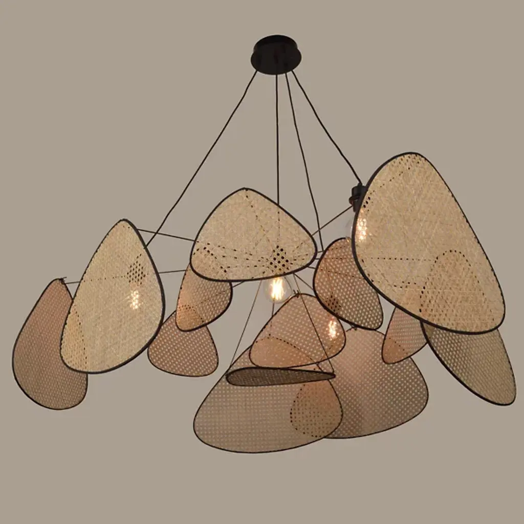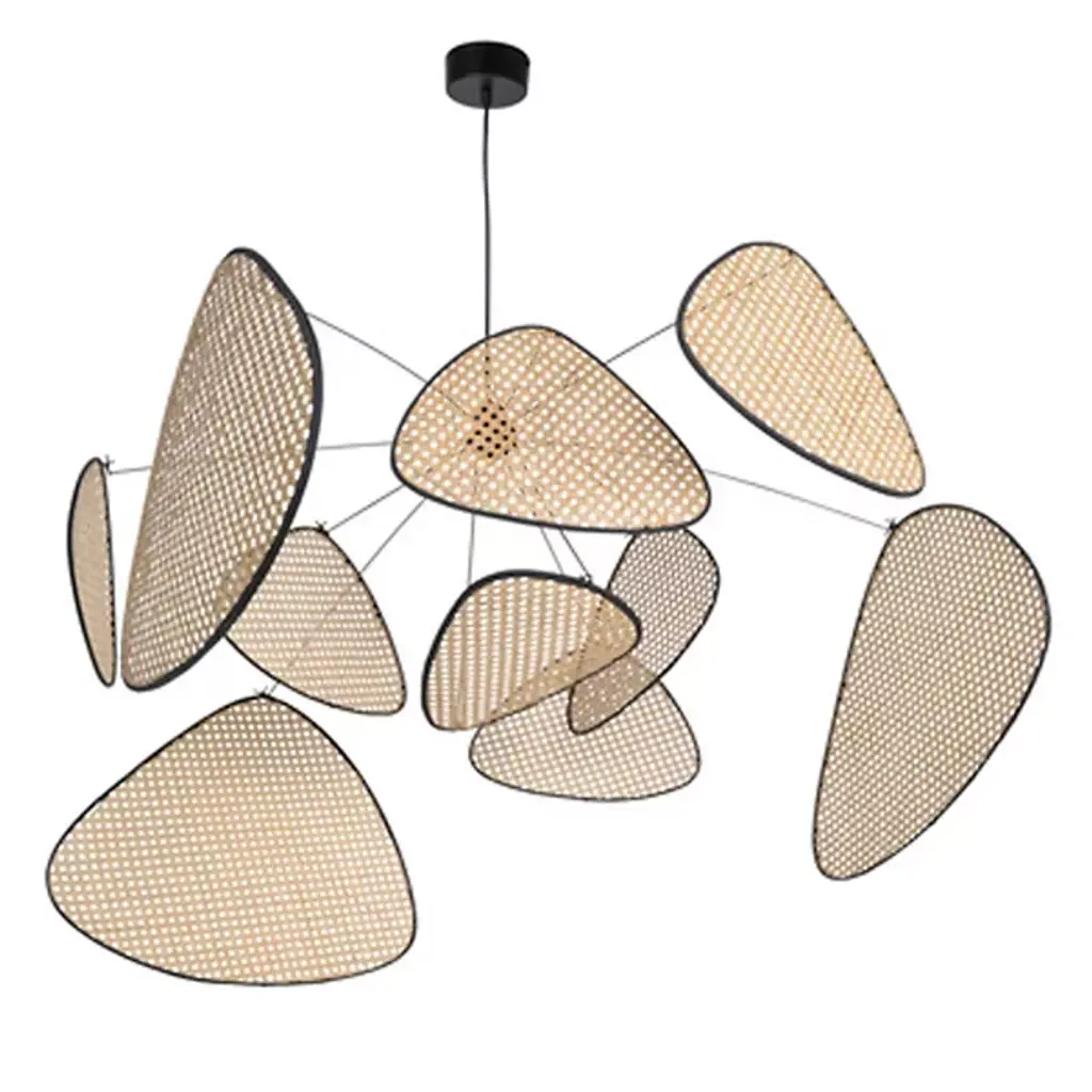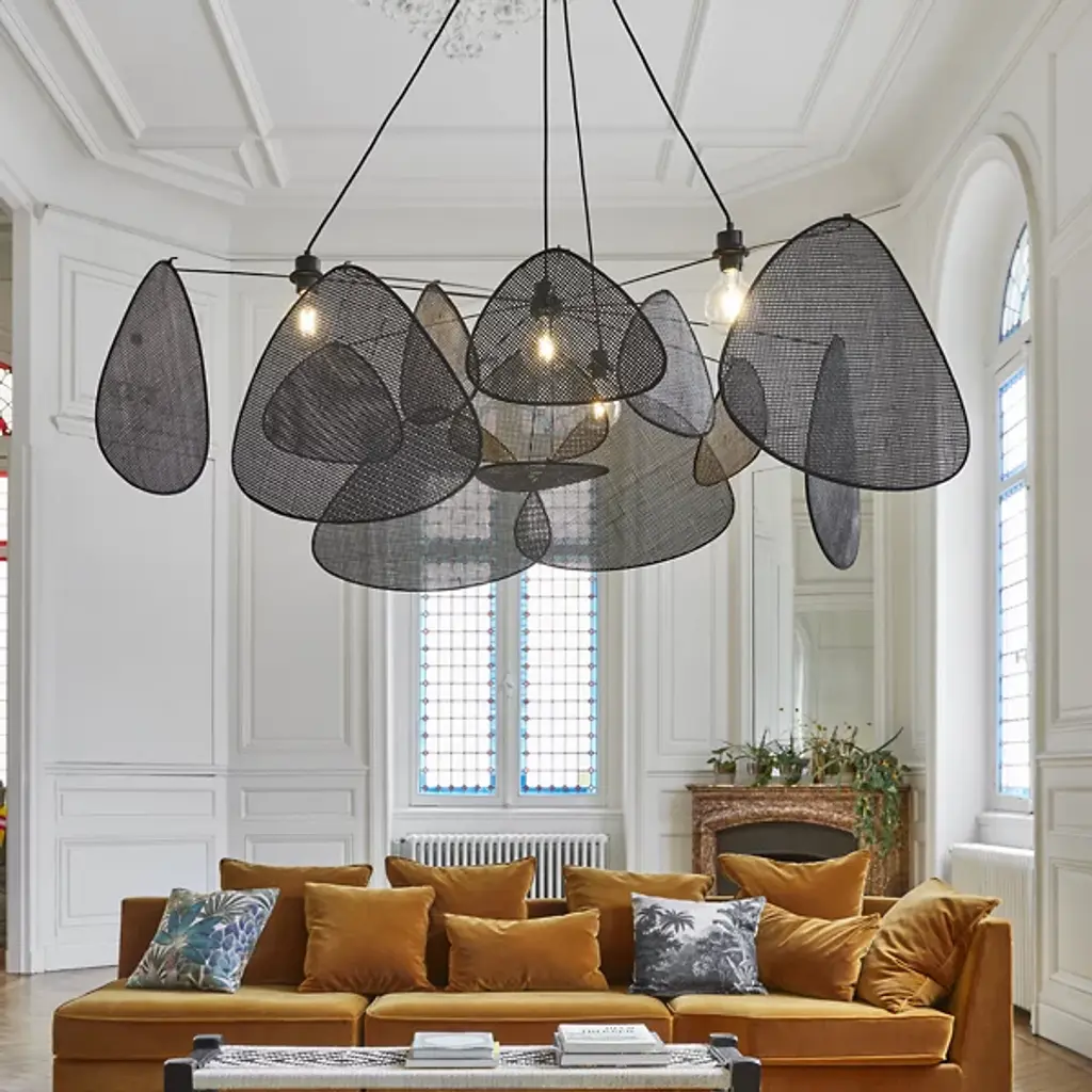 The Screen Chandelier from Market Set is an airy, graphic wonder inspired by traditional Japanese craftsmanship. The studio at Market set infuses each piece with a contemporary aesthetic and a chic, graphic look. The chandelier’s chic side shows with a fine fabric suspension. A series of painted metal arms shoot out from the core as delicate lines. Exuding retro charm, abstract shades hang above with a weightless feeling around the core bulb to eliminate glare. The shades sport an intricate cane work mesh that delivers a bold silhouette and a comfortable filtered glow.