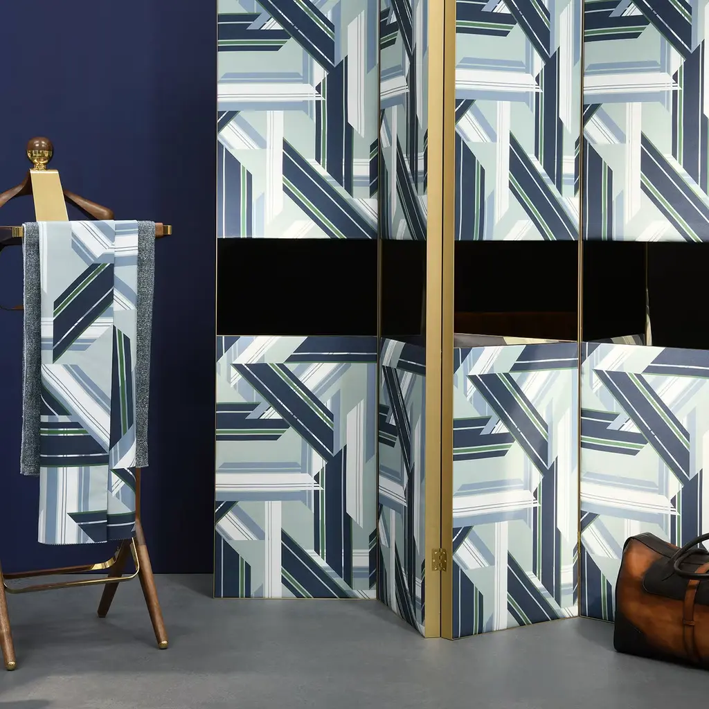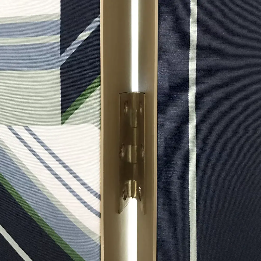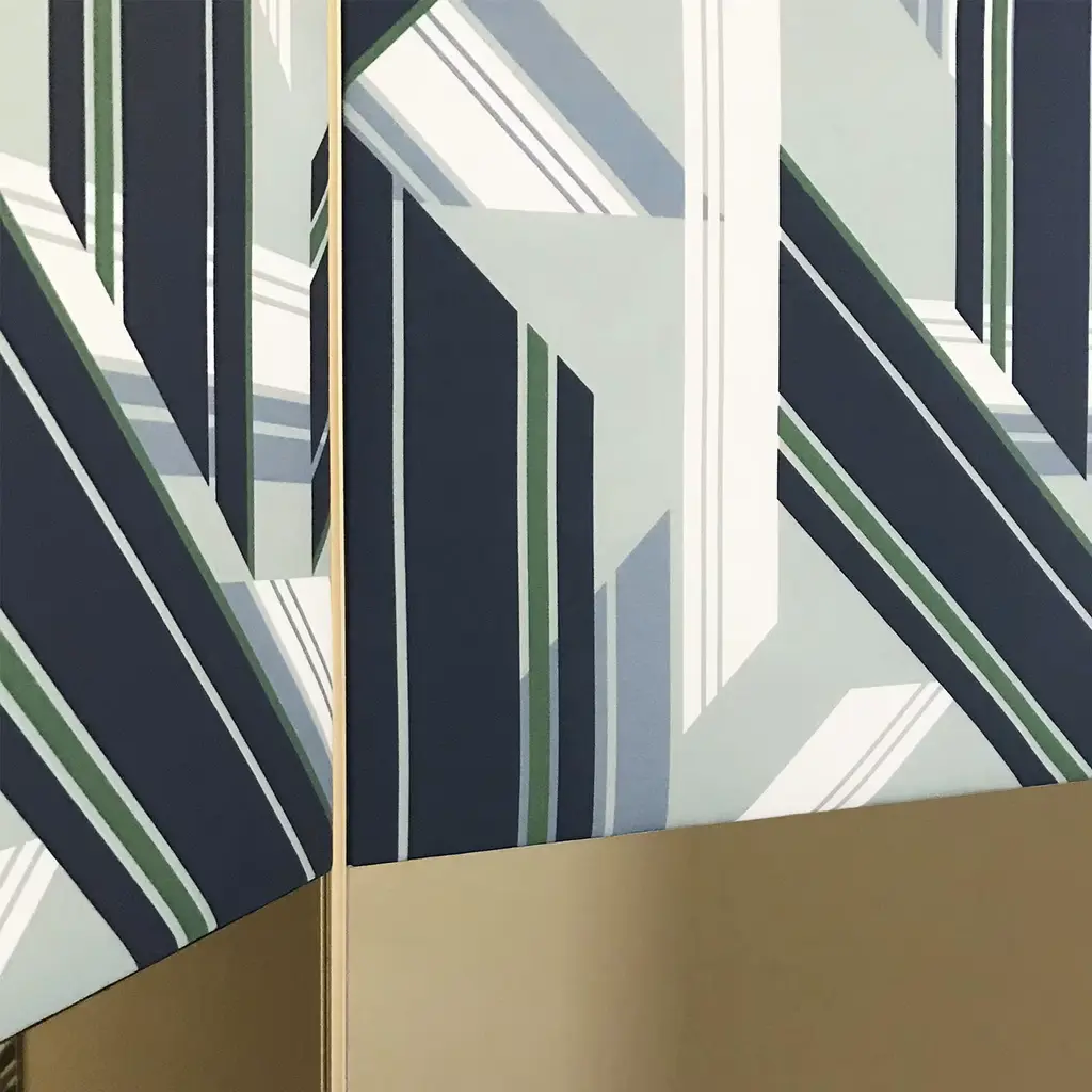 This refined screen was crafted by expert artisans and is a precious decorative and functional piece that will enrich a room with sophistication, while also allowing to divide a space, adding a unique and modern textural element. The brass structure with a gold brushed finish supports high panels partially covered with a strikingly printed fabric from the No.23 collection by Lelièvre, Paris. The white, blue, and green geometric decoration elegantly complements the warm glow of the metal and the central mirror inserts boasting a silver-bronzed finish.