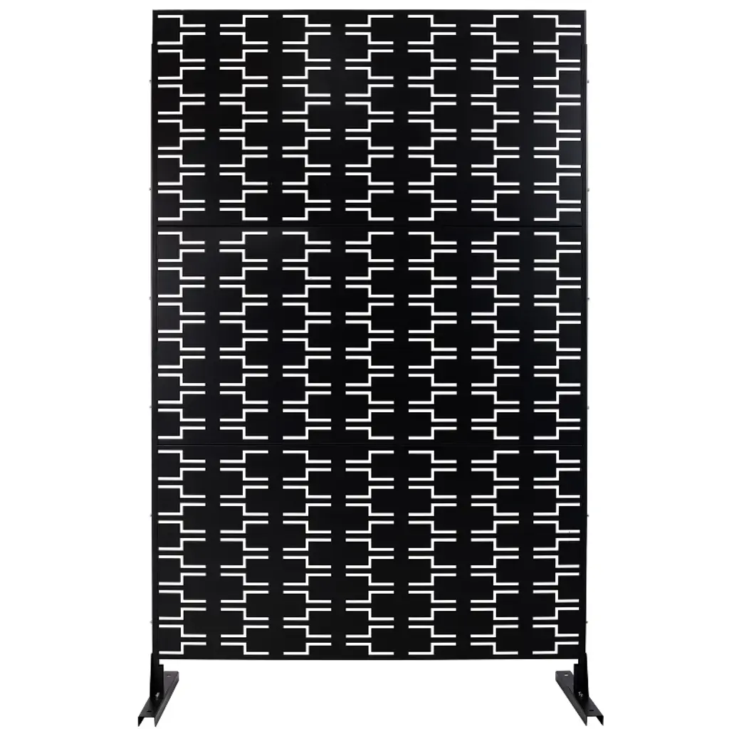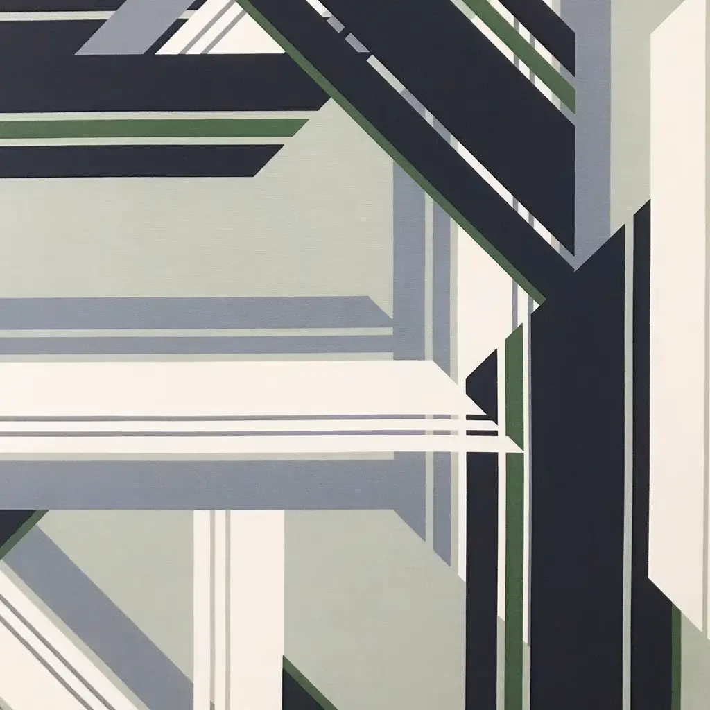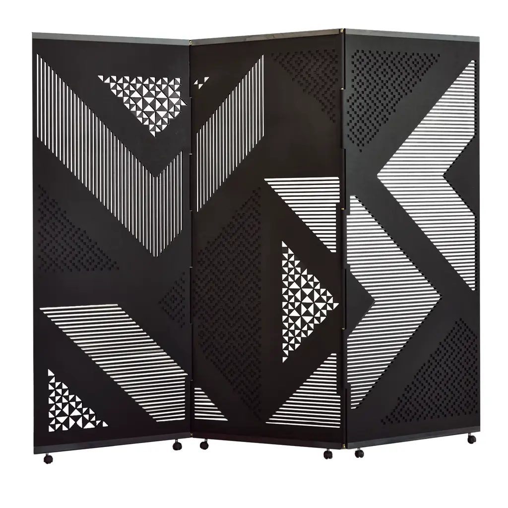 This refined screen was crafted by expert artisans and is a precious decorative and functional piece that will enrich a room with sophistication, while also allowing to divide a space, adding a unique and modern textural element. The brass structure with a gold brushed finish supports high panels partially covered with a strikingly printed fabric from the No.23 collection by Lelièvre, Paris. The white, blue, and green geometric decoration elegantly complements the warm glow of the metal and the central mirror inserts boasting a silver-bronzed finish.