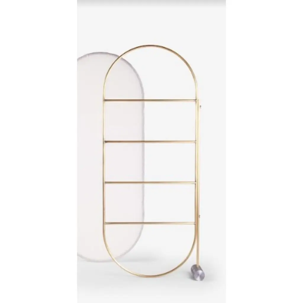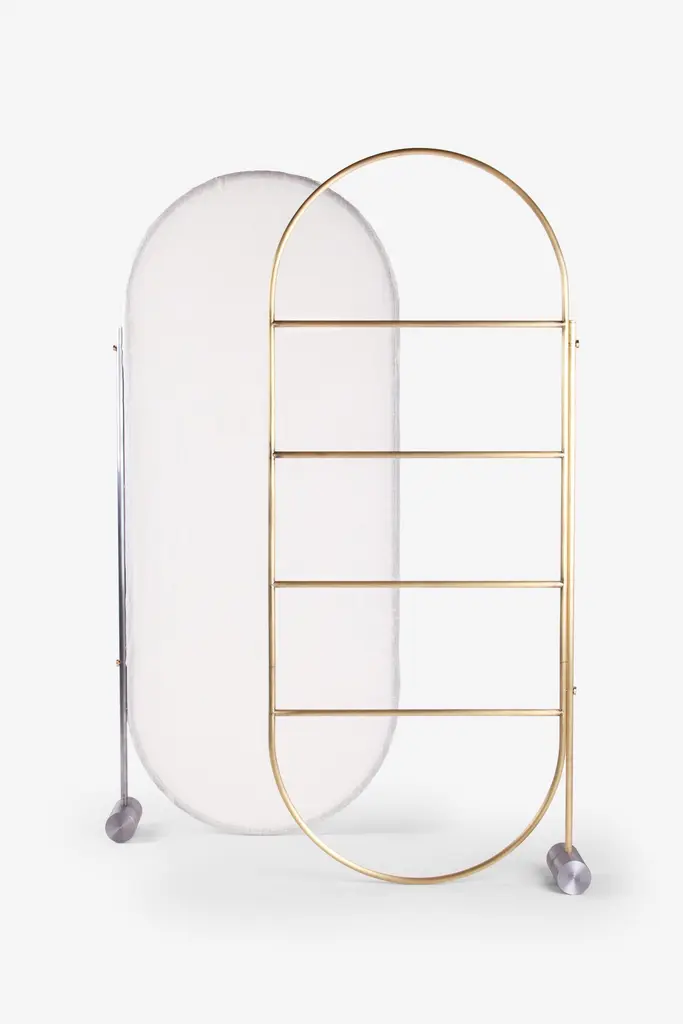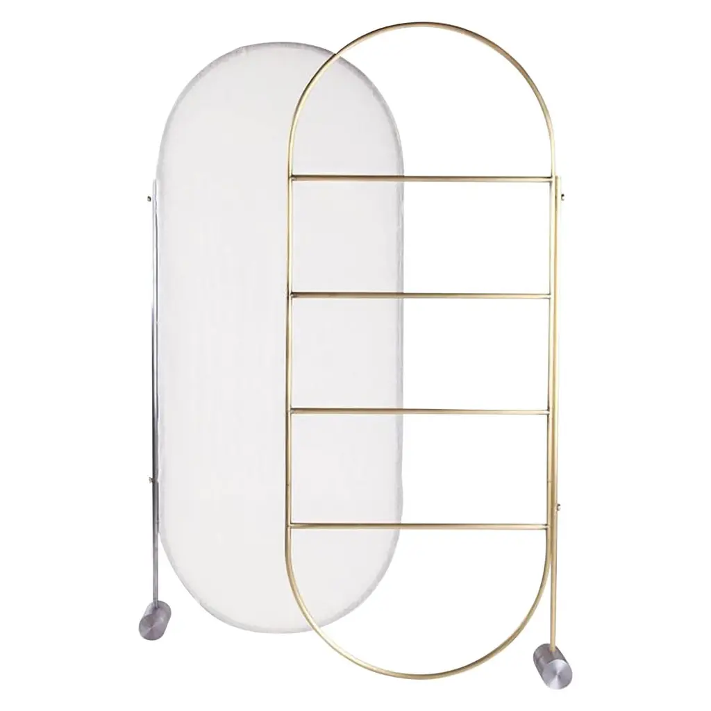 Separè room divider with Horizontal Divisions by MingardoDimensions: D72 x W20 x H170 cm Materials: satin natural brass structure. Iron baseWeight: 17 kgAlso Available in different finishes.Separè, is a multi-use space divider, centered around a vertical metal frame kept upright via cylindrical anchor weight at its base. The light handcrafted membrane frame and the heavy cylinder contrast each other in form, creating a vivid relationship in function.A frame coated with a semi-transparent natural fabric creates light and flexible division of spaces while open frame option with horizontal divisions allows for a multi-use rack.Mingardo Ilario founded Mingardo Blacksmith Workshop in 1970, after over twenty years’ experience in the metal processing field.The production was initially focused on simple blacksmith works for the construction industry. Over the time, it has become more refined, enabling the company to collaborate with internationally renowned companies and architects: from the first collaborations with architect Carlo Scarpa to the more recent commissions for Museo del Novecento in Milan, Parco della Musica in Florence, and Teatro Petruzzelli in Bari.Over the years, the Workshop has achieved great results, with the production of unique metal products, all hand-wrought by a highly skilled team of specialized artisans. Nowadays, it is highly regarded in the local artisan field for its high-end refined finishing touches and details, and for its know-how.