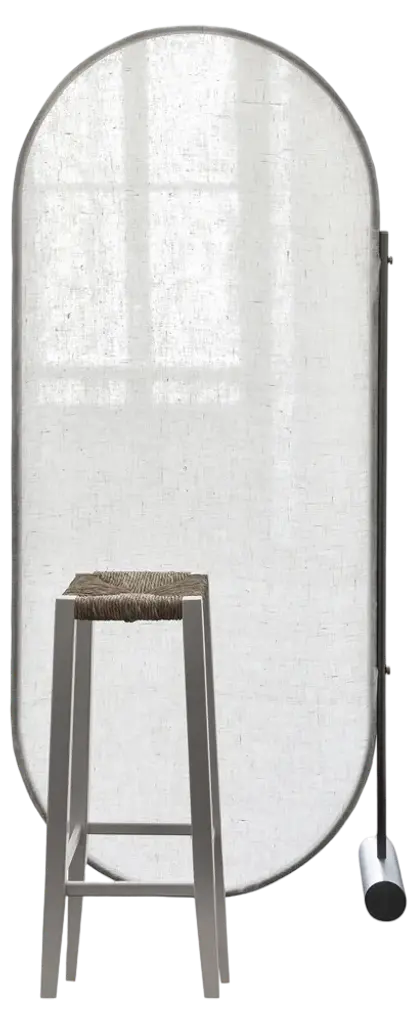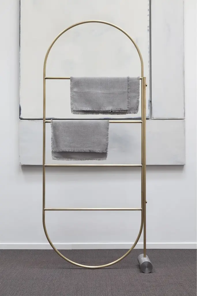 Separè room divider with semi-transparent and natural fabric by MingardoDimensions: D72 x W20 x H170 cm Materials: Satin natural brass structure and satin natural iron base, Semi-Transparent and Natural FabricWeight: 14 kgAlso Available in different finishes. price without the stoolSeparè, is a multi-use space divider, centered around a vertical metal frame kept upright via cylindrical anchor weight at its base. The light handcrafted membrane frame and the heavy cylinder contrast each other in form, creating a vivid relationship in function.A frame coated with a semi-transparent natural fabric creates light and flexible division of spaces while open frame option with horizontal divisions allows for a multi-use rack.Mingardo Ilario founded Mingardo Blacksmith Workshop in 1970, after over twenty years’ experience in the metal processing field.The production was initially focused on simple blacksmith works for the construction industry. Over the time, it has become more refined, enabling the company to collaborate with internationally renowned companies and architects: from the first collaborations with architect Carlo Scarpa to the more recent commissions for Museo del Novecento in Milan, Parco della Musica in Florence, and Teatro Petruzzelli in Bari.Over the years, the Workshop has achieved great results, with the production of unique metal products, all hand-wrought by a highly skilled team of specialized artisans. Nowadays, it is highly regarded in the local artisan field for its high-end refined finishing touches and details, and for its know-how.