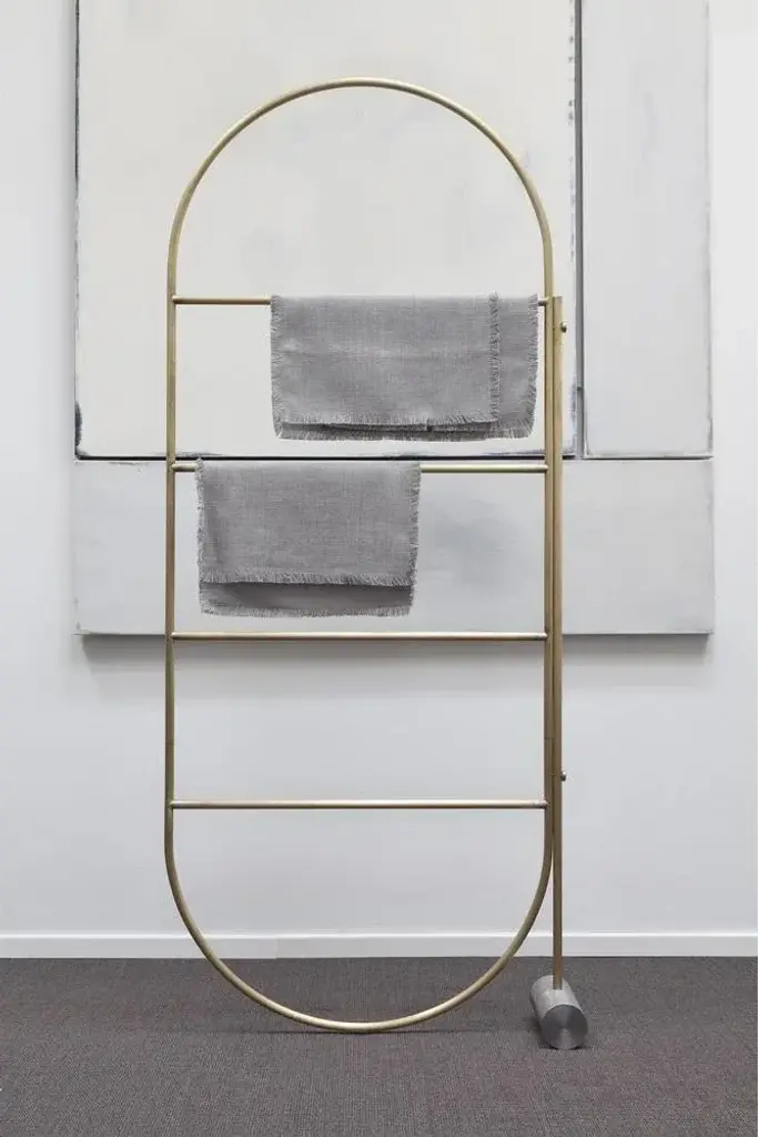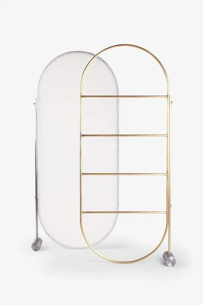 Separè room divider with semi-transparent and natural fabric by mingardo dimensions: d72 x w20 x h170 cm materials: satin natural brass structure and satin natural iron base, semi-transparent and natural fabric weight: 14 kg also available in different finishes. **price without the stool separè, is a multi-use space divider, centered around a vertical metal frame kept upright via cylindrical anchor weight at its base. The light handcrafted membrane frame and the heavy cylinder contrast each other in form, creating a vivid relationship in function. A frame coated with a semi-transparent natural fabric creates light and flexible division of spaces while open frame option with horizontal divisions allows for a multi-use rack. Mingardo ilario founded mingardo blacksmith workshop in 1970, after over twenty years’ experience in the metal processing field. The production was initially focused on simple blacksmith works for the construction industry. Over the time, it has become more refined, enabling the company to collaborate with internationally renowned companies and architects: from the first collaborations with architect carlo scarpa to the more recent commissions for museo del novecento in milan, parco della musica in florence, and teatro petruzzelli in bari. Over the years, the workshop has achieved great results, with the production of unique metal products, all hand-wrought by a highly skilled team of specialized artisans. Nowadays, it is highly regarded in the local artisan field for its high-end refined finishing touches and details, and for its know-how.