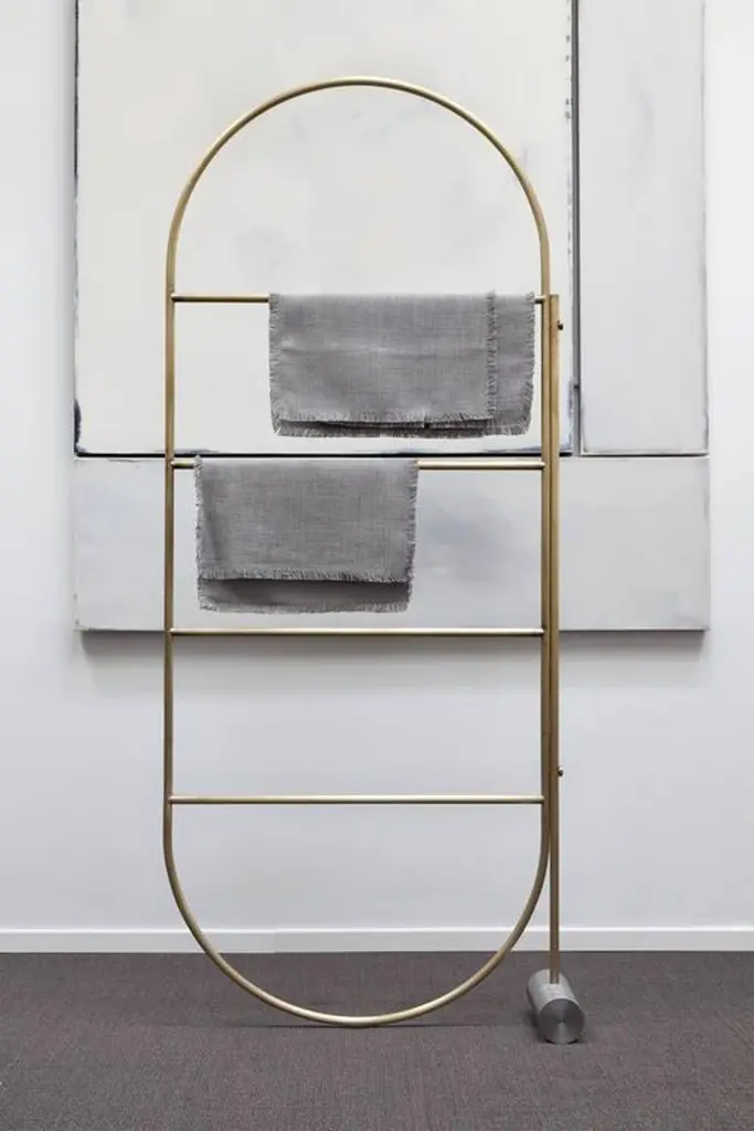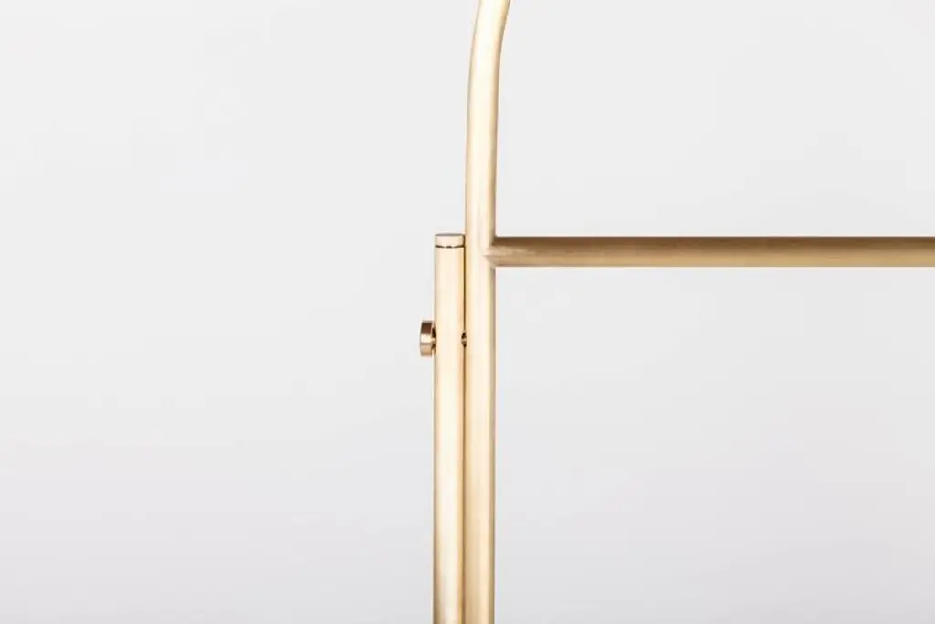 Separe` is a multi-use screen/space divider, centered around a vertical metal frame kept upright via cylindrical anchor weight at its base. The light handcrafted membrane frame and the heavy cylinder contrast each other in form, creating a vivid relationship in function. A frame coated with a semi-transparent natural fabric creates light and flexible division of spaces while the open frame option with horizontal divisions allows for a multi-use rack.Designed by Omri Revesz + Damian TatangeloAvailable in natural brass or natural iron.Dimensions: cm 20 x 72 x H 170 in 7.87 x 28.35 x H 66.93.