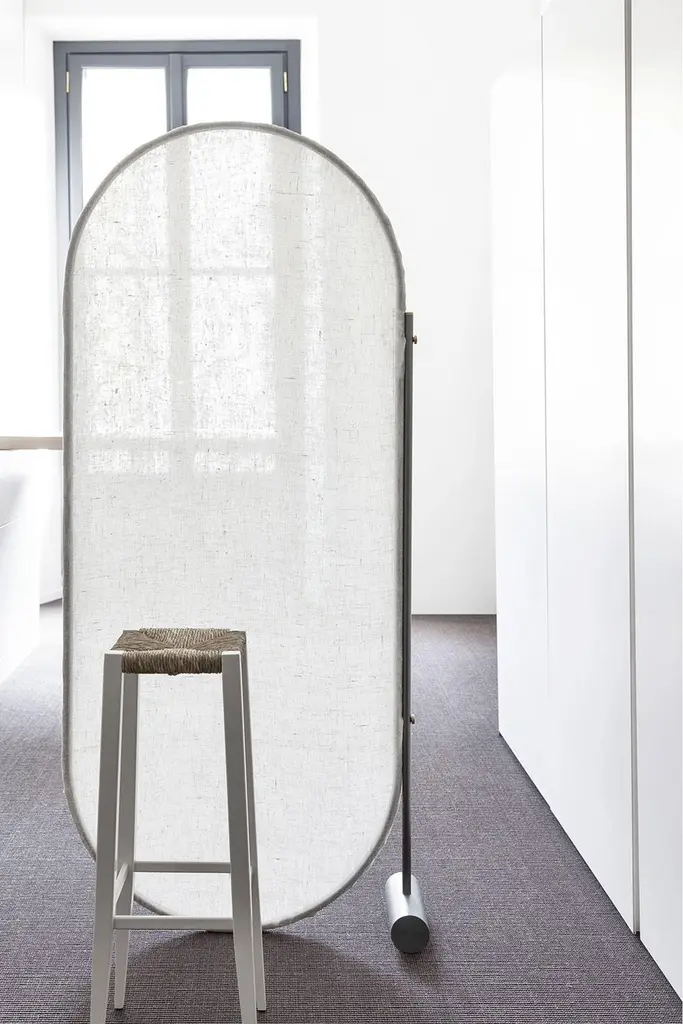 Set of 2 Separè room Dividers vby MingardoDimensions: D72 x W20 x H170 cm Materials: satin natural brass structure. Iron base. FabricWeight: 14-17 kgAlso Available in different finishes. Separè, is a multi-use space divider, centered around a vertical metal frame kept upright via cylindrical anchor weight at its base. The light handcrafted membrane frame and the heavy cylinder contrast each other in form, creating a vivid relationship in function.A frame coated with a semi-transparent natural fabric creates light and flexible division of spaces while open frame option with horizontal divisions allows for a multi-use rack.Mingardo Ilario founded Mingardo Blacksmith Workshop in 1970, after over twenty years’ experience in the metal processing field.The production was initially focused on simple blacksmith works for the construction industry. Over the time, it has become more refined, enabling the company to collaborate with internationally renowned companies and architects: from the first collaborations with architect Carlo Scarpa to the more recent commissions for Museo del Novecento in Milan, Parco della Musica in Florence, and Teatro Petruzzelli in Bari.Over the years, the Workshop has achieved great results, with the production of unique metal products, all hand-wrought by a highly skilled team of specialized artisans. Nowadays, it is highly regarded in the local artisan field for its high-end refined finishing touches and details, and for its know-how.