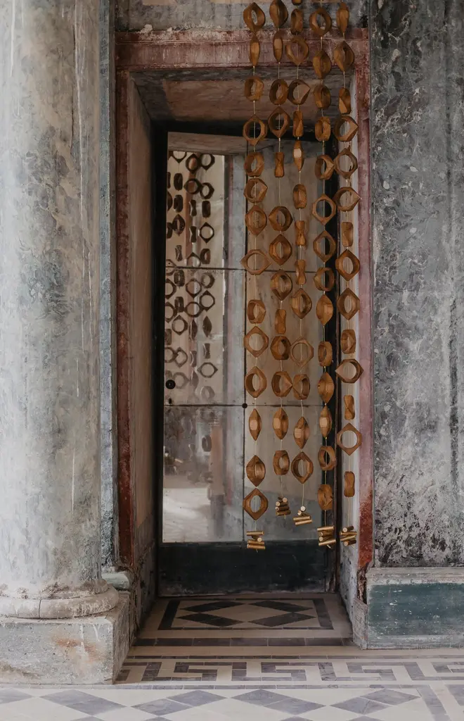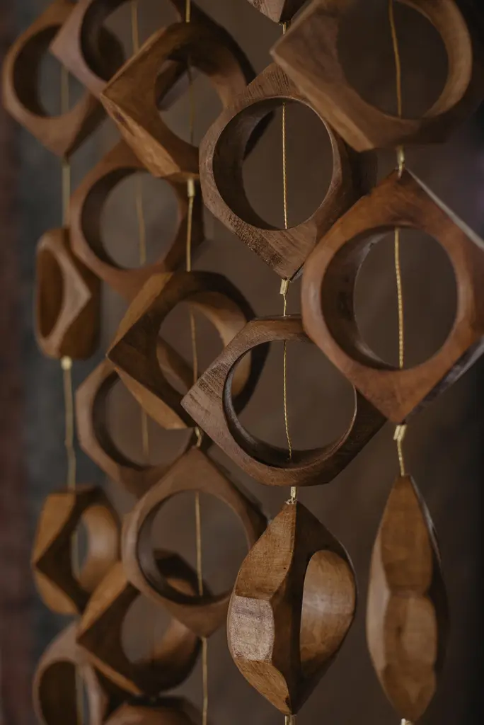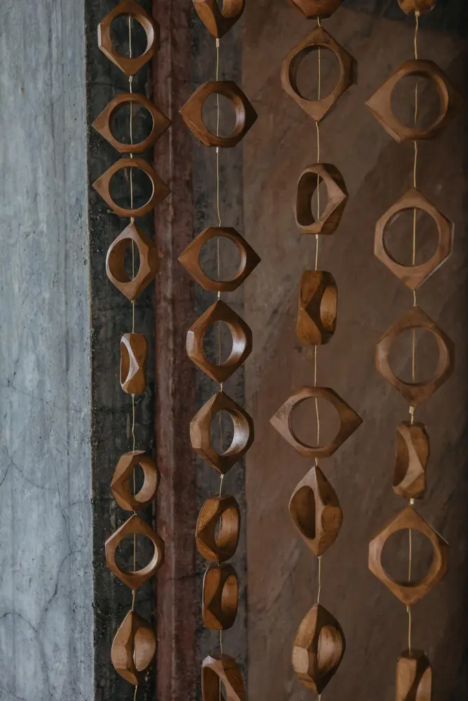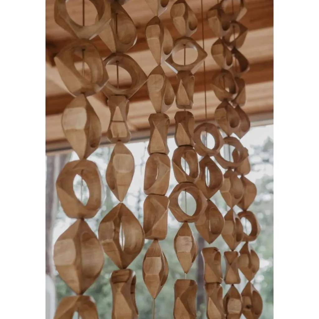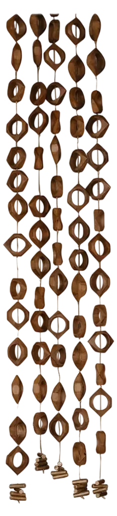 Set Of 5 Claustra Room Dividers by Mylene NiedzialkowskiDimensions: W 12 x H 230 cm (each unit).Materials: Beech wood, golden steel wire and brass.Different lenghts available: 6 pieces per module (100 cm), 9 pieces per module (150 cm), 12 pieces per module (200 cm) and 15 pieces per module (230 cm). The colors can differ and make each piece unique. Please contact us. Inspired by room dividers and certain bas reliefs from the 70s in the vast halls, Claustra is a string of wooden modules strung on a weighted metal cable. Sold "by the stem", Claustra is at its best when played in accumulation, as in the photos. It can be used as a room divider or as a wall decoration. Beech from eco-managed forest on steel cable, brass weight. Modules are 12cm wide. Hanging hook provided. Claustra is made at the Château de Méritein, our Béarnaise factory. The elements are varnished then mounted on cable.All our collections start from an exploration, from a curiosity for the material, from the discovery of the gesture to work it, from the application to master it and finally, from the care to arrive at the object that you discover while browsing these pages. Georges adorns himself with rare fibers and raw materials to carefully manufacture, entirely by hand, sincere objects and other numbered masterpieces, always in a reasoned approach.All our objects and lights are handmade in our factory in Béarn, in Méritein. In this castle, our teams use simple and raw materials sourced as close as possible and transformed on site. A manufacturing process that is economical in resources, generous in know-how and respectful of the environment.At the basis of each object, there is a permanent desire to experiment. To understand matter, its constraints, its properties. And to transform it, taking care to only work on it as minimally as possible.From this desire to leave the raw material as raw as possible, Mylene Niedzialkowski draws and designs pieces with minimal lines, with singular and assertive irregularities.Sailing between the South West of France and Paris, fascinated by arte povera and popular arts, Mylene Niedzialkowski strives to accumulate local raw materials in her workshop, from neighboring regions, basic and common materials, ordinary and daily, both household and industrial or even from production residues. From this collection which oscillates between material library and cabinet of curiosities, simple objects with clean lines are created, sometimes everyday, sometimes with an essentially decorative function.