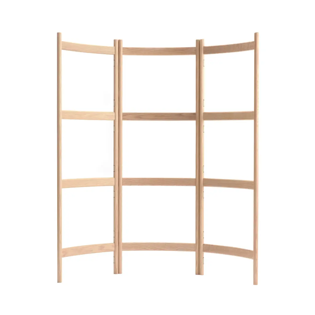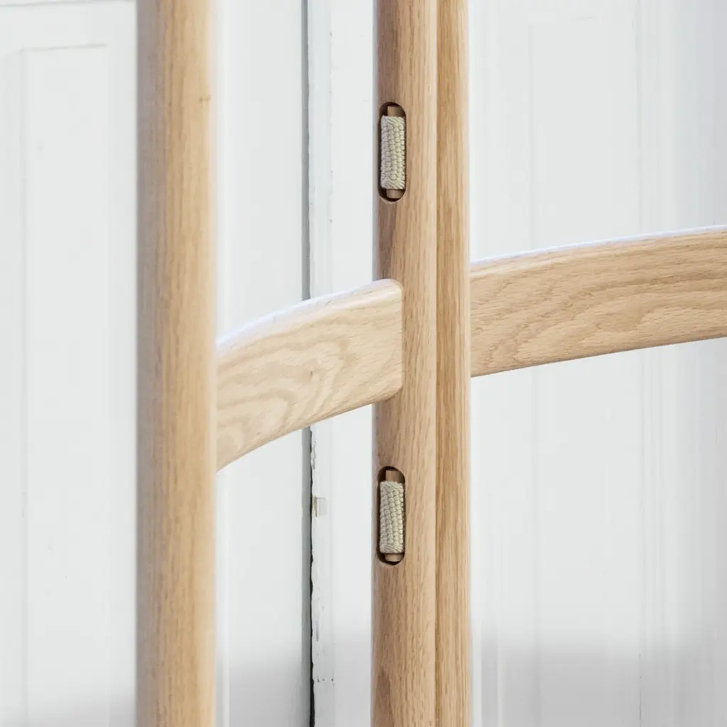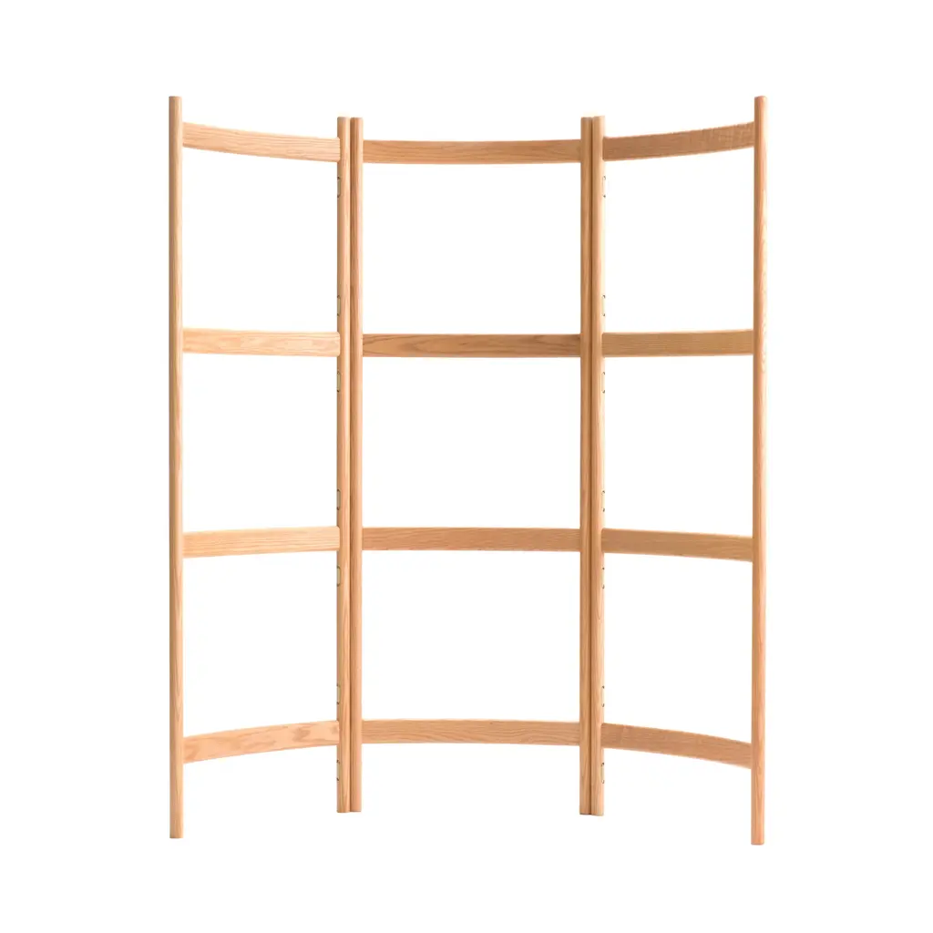 The Shoji Screen by Ariake is a versatile space divider that can also fold into a coat rack. Designed with functionality in mind, it features hinges made of elastic canvas straps and a structure of steam-bent solid wood. This design allows users to hang items like blankets, throws, and hats. Available in oak or ash.