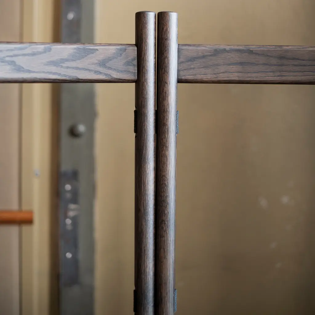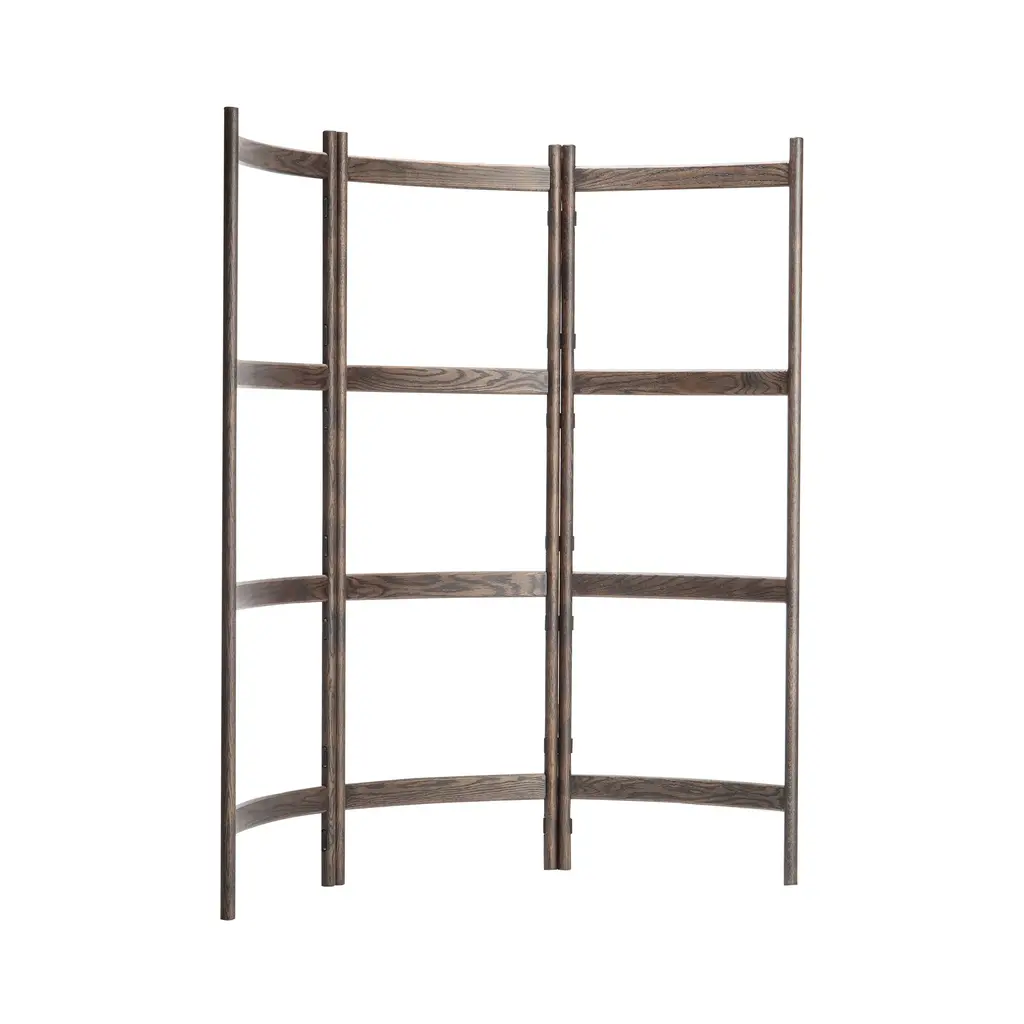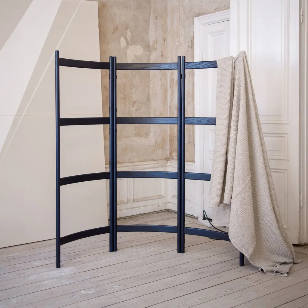 The Shoji Screen by Ariake is a versatile space divider that can also fold into a coat rack. Designed with functionality in mind, it features hinges made of elastic canvas straps and a structure of steam-bent solid wood. This design allows users to hang items like blankets, throws, and hats. Available in oak or ash.