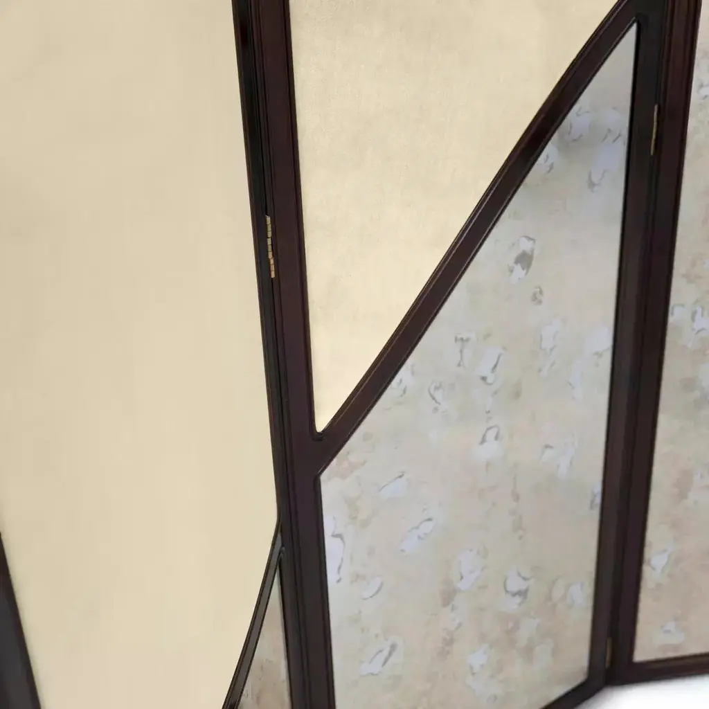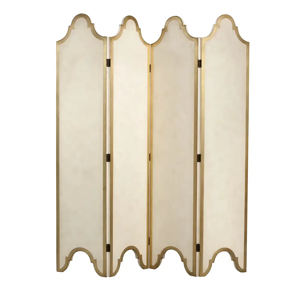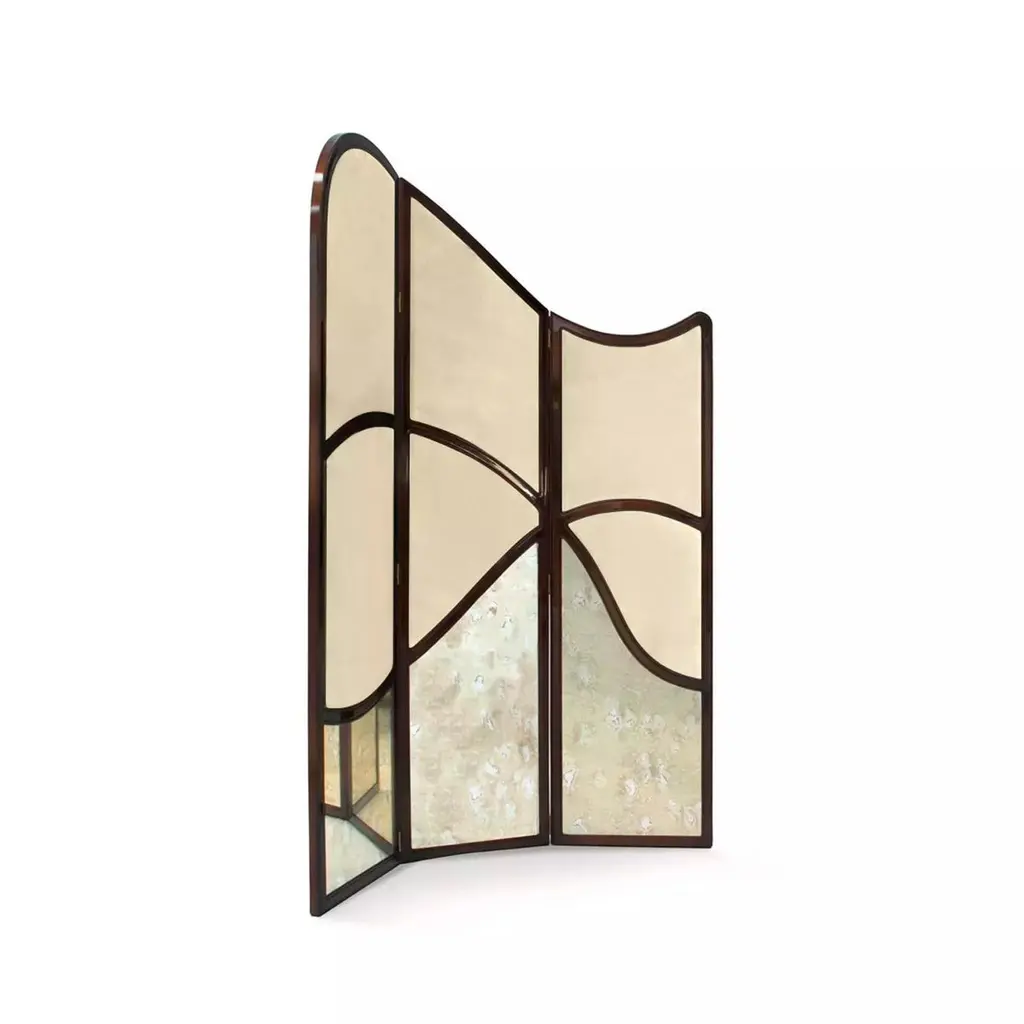 Gentle curves of dark bronze undulate to create the Simone screen's charismatic form. A bold yet subtle work of art,Simone's soft panels of upholstery and elegant panes of antique mirror are sure to bring the allure of vintage glamour toany space.Materials & FinishesPanels: Lux Velvet Ivory 0099 from the KOKET Textiles collectionFrame: Iridescent Caramel (High Gloss Finish)Details: Aged MirrorClean & CareWood and lacquered pieces have been stained and/or polished to bring depth and beauty to each finish. Although most are protected with either a clear coat or wax, they are still susceptible to wear. Care for your wood and lacquer pieces by dusting regularly with a soft cloth. Maintain wood, lacquer and mother of pearl by not placing near heaters and air conditioning units to prevent over-drying or exposure to excessive moisture. Avoid extreme humidity changes in your home, as extremely dry air can cause wood to crack and lacquer to lift. Do not place/leave hot or moist objects directly on the wood. Rubber or plastic left on the wood finish can also damage the finish. Clean by using a dry or slightly damp soft cloth. Follow by polishing with a dry soft cloth. Do not use commercial, eavy-duty polishes or waxes, as they can yellow light finishes. We recommend that stained or soiled wood, lacquer or mother of pearl pieces be professionally cleaned or refinished.