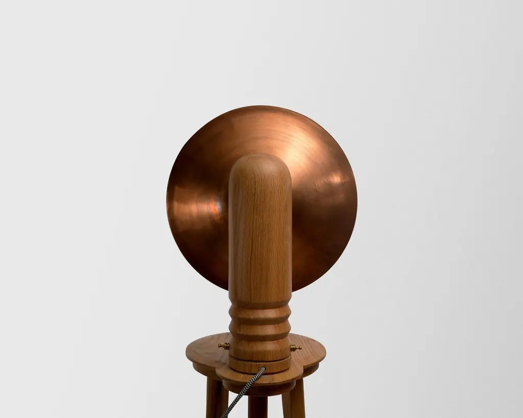 Sousaphone draws inspiration from the gleaming gramophones of the early twentieth century and reinterprets them to illuminate spaces. Its brass or copper screen creates unique and soft reflections. Where social gatherings were once enlivened by the gramophone's rough sound, ACOOCOORO now seeks to recreate its shine, silhouette, and presence.As with the rest of ACOOCOORO’s collection, this piece carved and polished by hand, and assembled using traditional wood joints. Both the metallic screen and the two-tier oak tripod offer some options for customization. The signs of time, history, and use are valuable for ACOOCOORO. Most finishes and materials used in this collection are meant to reflect the passage of time, and may change and age in appearance.
