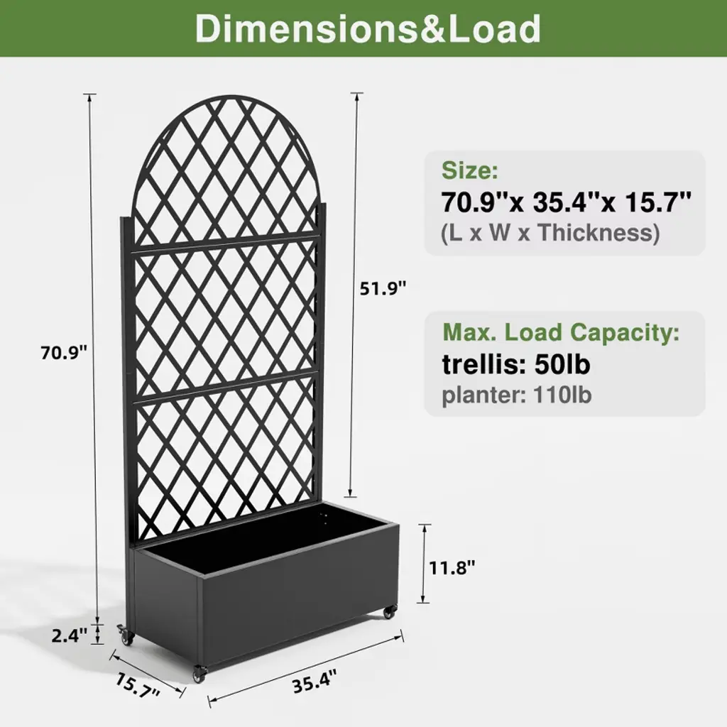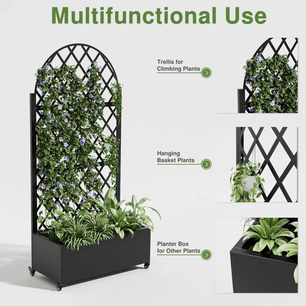 Introducing the Metal Planter Box with Trellis Raised Garden Bed with Arbor Privacy Screen with Wheels - the ultimate solution for creating a beautiful and functional outdoor or indoor space. This versatile garden bed combines the elegance of a trellis with the practicality of a raised bed. It also can be a perfect choice as a privacy screen when creating more beauty for your home.