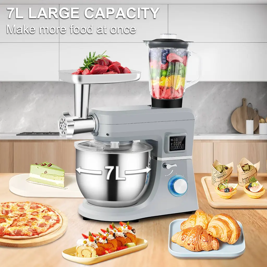 Comfortable User-Friendly Control Panel: Get ready to benefit from the intelligent LCD panel, operating this stand mixer couldn't be any easier. You can clearly perceive the precise remaining time from the screen, and set different durations according to different purposes. Thanks to the auto-stop function, you don't have to keep an eye on the machine all the time. Start a hassle-free baking journey even when your hands are occupied. Complete Accessories for Outstanding Performance: Everything you need to create the perfect mix is included. Our planetary mixer comes with 3 attachments (all dishwasher-safe): a dough hook to knead flour, a beater to mix butter & mashed potatoes, and a whisk to whip creams & custards. Thoughtful accessories like a scraper and splash-proof cover are also provided. Besides, you can extend its use with the front-mounted meat grinder and top-mounted juice cup. Get ready to enjoy effortless baking and food preparation with this compact kitchen all-rounder. Unstoppable 6-Speed Pure Copper Motor: Choose how you mix! Equipped with a 660 W gear-driven copper motor, this mixer features continuous high-torque mixing, quiet operation, and outstanding reliability, standing up to the most demanding work in your kitchen. 6 speed levels allow you to perfectly mix different products at different speeds, from kneading dough slowly to whipping cream quickly. 1st-2nd speed for bread & cakes, 3rd-4th for butter & salad, 5th-6th for cream & egg white, and 6th can also be used for meat & juice. Start mixing like never before. 7.4 Qt Stainless Bowl with Fermentation: Designed with a built-in thermostatic heating element, the 7.4 Qt / 7 L stainless steel bowl can automatically heat up to the appropriate temperature for fermentation. Raw materials for 6 toasts can be kneaded at a time, saving half of your waiting time even in winter. It is convenient to change the attachments and pour in the ingredients thanks to the tilt-head design. Plus, the bowl is dishwasher-safe and comes with a splash-proof cover. Never Worry About Mixing: Are you ready to mix! Don't stop! The planetary mixing and stirring mechanisms greatly contribute to full contact between the beater and the bowl's inner wall. The flat beater is designed with a soft silicone edge, which can effortlessly scrape off the sticky ingredients on the bowl and then mix them together. It doesn't even matter if they are left on the sides or at the bottom. Don't hesitate to knead dough and various bakery essentials with 's commercial mixer. Package Content 1 x Stand Mixer 1 x 7L Stainless Bowl (with Cover) 1 x Set of Mixing Part (Hook / Beater / Whisk) 1 x Scraper 1 x Meat Grinder (with Tray)( for 5 IN 1 option) 1 x Juice Cup (with Pusher)( for 5 IN 1 option) 1 x User Manual( for 5 IN 1 option)