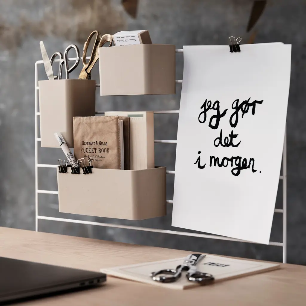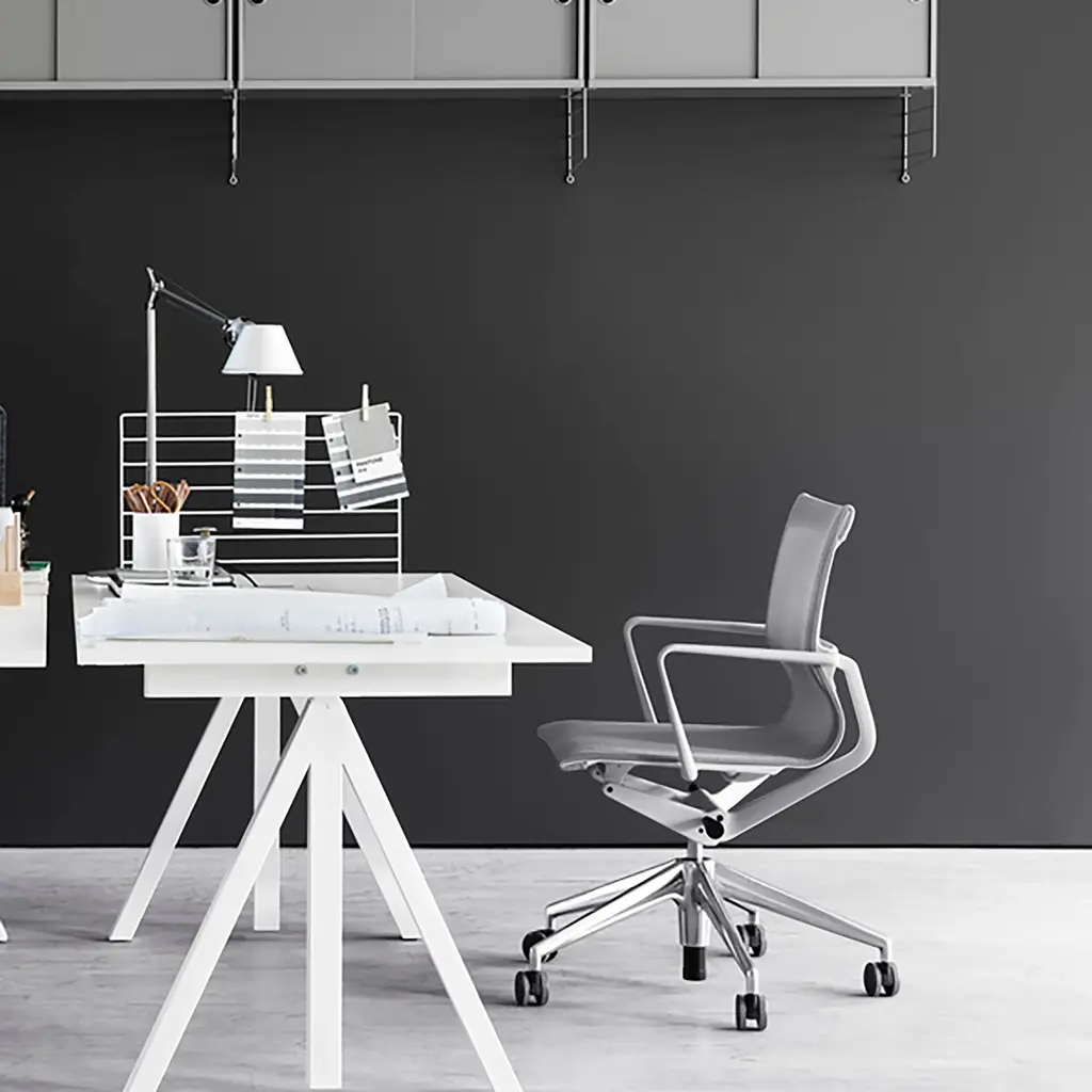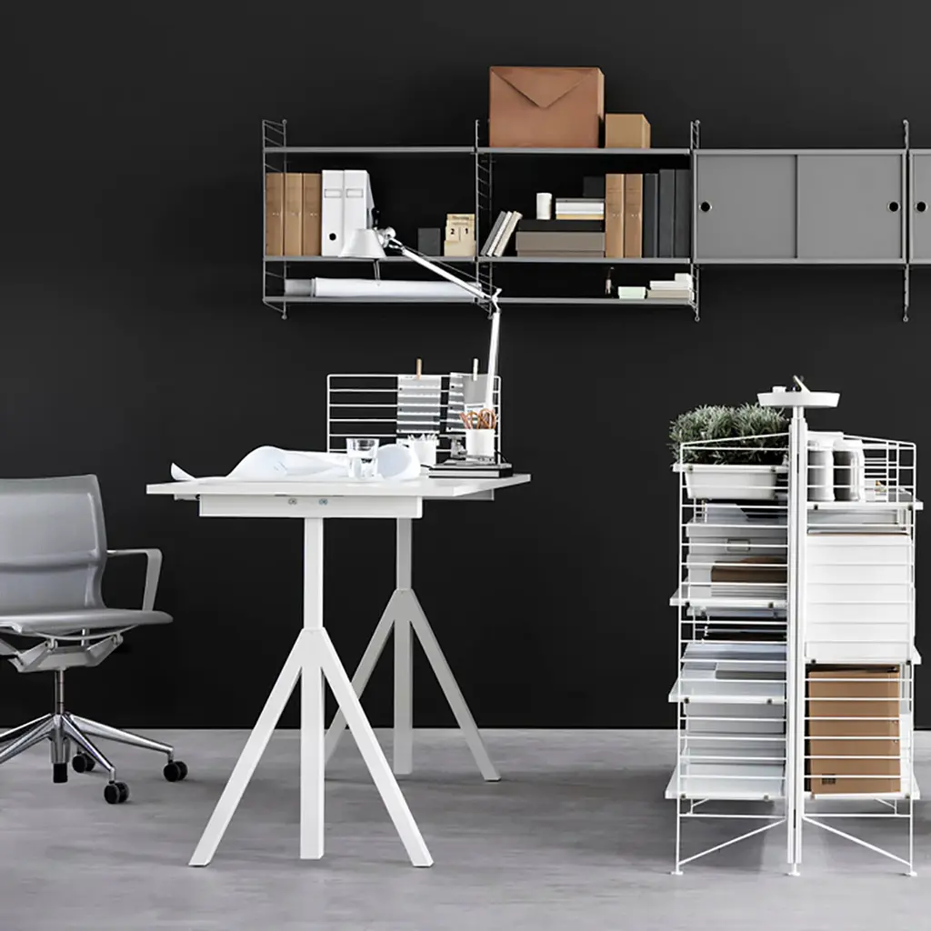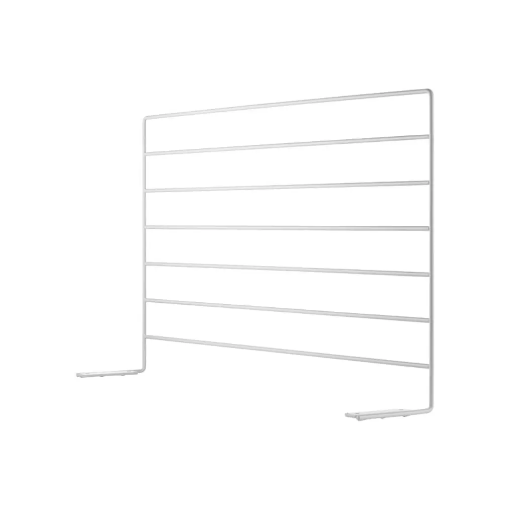 String offers a versatile desk component that can be used as a semi-open partition between workstations or as a bulletin board or holder for hooks and organizers. Wire Screen is fashioned in powder-coat gloss finish white. An optional grey felt cover allows for additional privacy and sound reduction or serves for use as a pin board.
