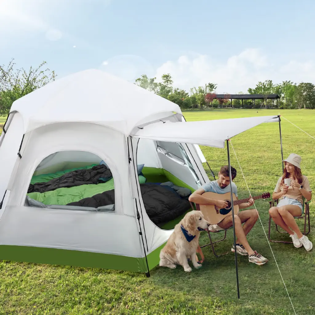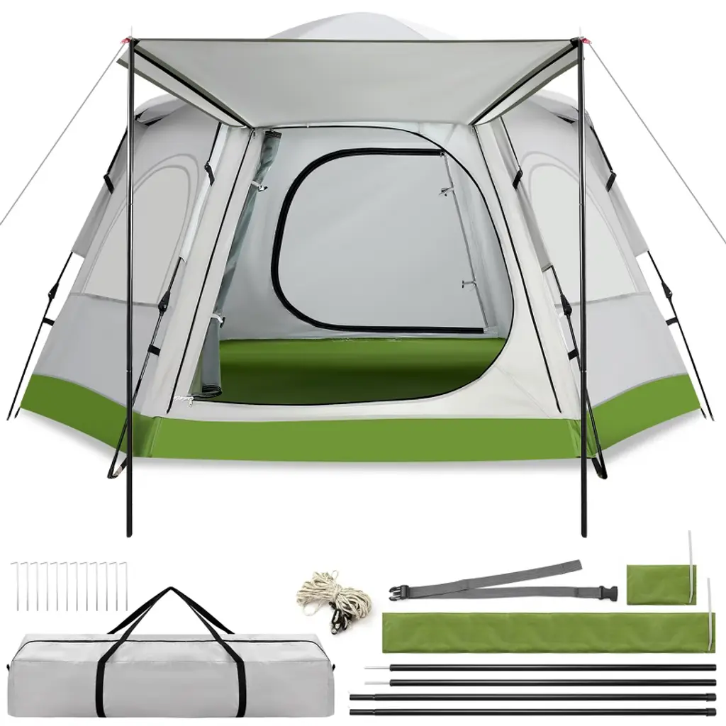 Enjoy your next outdoor adventure with this roomy and breathable 4-person camping tent. Designed for quick setup and maximum ventilation, this family tent features mesh windows on all sides, a weatherproof rainfly, and a spacious interior that fits a full air mattress or multiple sleeping bags. Whether you're heading to the mountains, beach, park, or the wilderness, this durable tent offers comfort, convenience, and protection from the elements. Ideal for families, couples, and small groups. Features All-around mesh screen windows and doors Fits up to 4 adults or a small family Includes carry bag, stakes, and support poles Waterproof floor and durable outer shell Sunshade front awning for extra coverage Specifications Product Dimensions: 110.23" L x 94.5" W x 62.2" H Material: 210D oxford fabric with PU coating Window Type: Mesh screen (4-sided) Door: 1 front entry with dual-layer flap Ventilation: All-around airflow design Setup Type: Manual with support poles & tie-downs Included Accessories: Carry bag, stakes, guy lines, poles, awning rods Suitable Capacity: 3–4 people