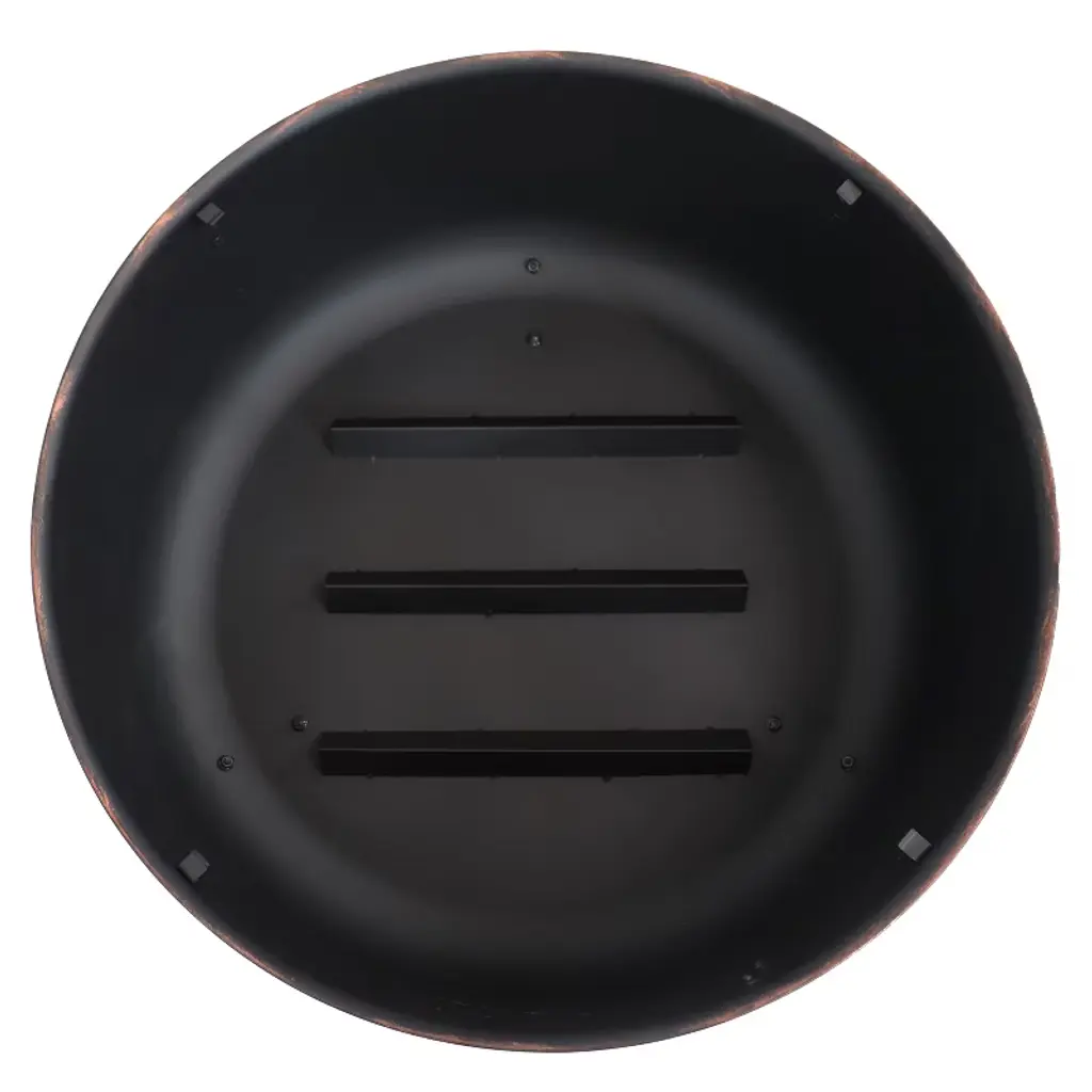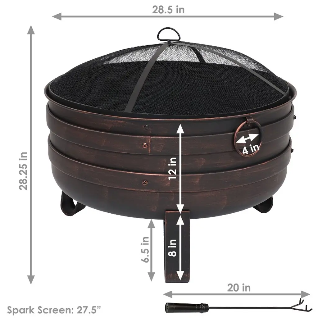 Gather friends and family around this portable wood fire pit for a fun evening. This sturdy cauldron-style fire bowl is an elegant centerpiece for the patio or backyard. It features a convenient handle on each side of the fire pit that makes it easy to grip and move from place to place. The open design of the fire pit is wonderful for toasting marshmallows and roasting hotdogs. This heavy-duty fire pit is made from durable steel with a heat-resistant paint finish in brushed bronze for lasting strength and beauty. Plus, this fire pit includes a tough PVC cover for protection from the outdoor elements when not in use. It also features a steel spark screen to help keep stray embers safely contained within the fire pit. Once the fire is completely extinguished and cool to the touch, place the cover over the metal fire pit until the next time.• GREAT FOR COZY GATHERINGS: This outdoor patio fire pit measures 28.5" in diameter x 18" H and weighs 21.8 lbs. It has a clearance height of 6.5" H and each leg measures 8" H. It features a 4" diameter handle ring on either side to make it easy to move from place to place. The spark screen measures 27.5" in diameter x 7" H.• HEAVY-DUTY CONSTRUCTION: This sturdy portable fire pit is made from durable steel with a brushed bronze, heat-resistant paint finish that is sure to last fire after fire. Plus, a tough PVC fire pit cover is included to protect the fire pit from the outdoor elements when not in use.• INCLUDES SPARK SCREEN, WOOD GRATE, AND COVER: This product comes complete with everything needed to enjoy an outdoor fire pit. The spark screen will help keep stray sparks and embers safely contained within the fire pit. The wood grate positions the firewood for optimal airflow so you can build roaring fires. Once the fire is extinguished and completely cool, cover the fire pit with the durable cover to protect it against the outdoor elements.• EASY TO MOVE: The side handles and light weight make it easy to move this wood-burning fire pit from place to place. Place it in the backyard, on the deck, or on the patio to create a fun outdoor gathering place.• WORRY-FREE PURCHASING: Sunnydaze Decor backs its products with a 1-year manufacturer's warranty.