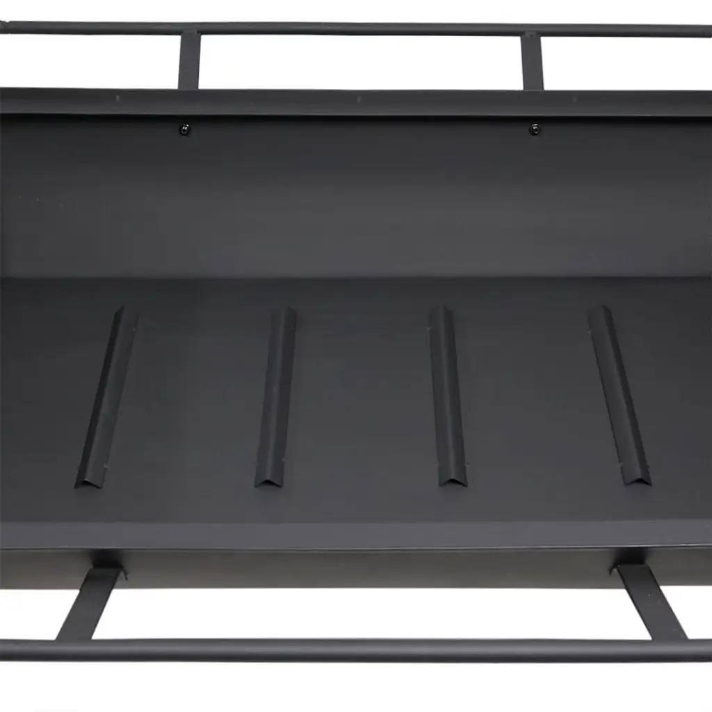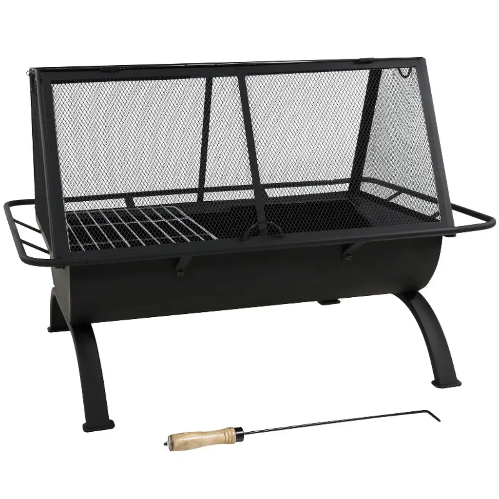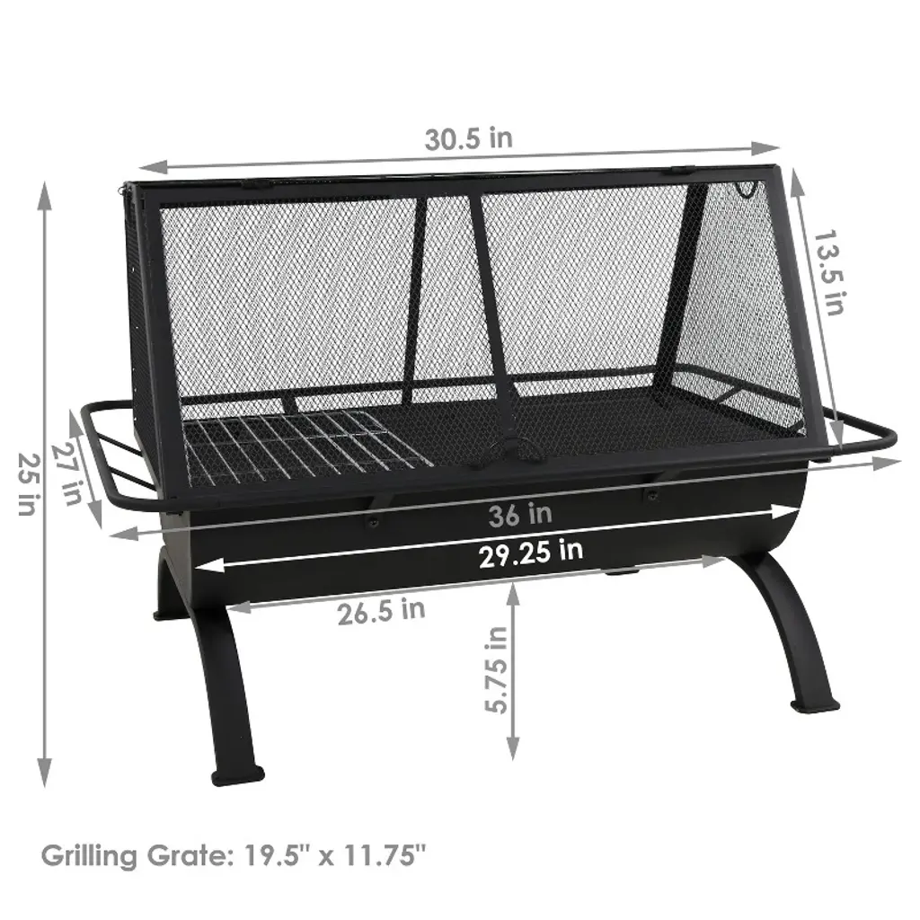 This unique, outdoor firepit with grill features a trapezoidal metal mesh topper for keeping sparks and embers contained while cooking your favorite foods over the fire. Its grand, lengthy design with a convenient grilling area is great for parties of all kinds. It incorporates a cooking grate that makes it ideal for barbecue areas on patios and in backyards. The firepit for outside is made from solid steel and is durably finished in black for a contemporary look and resistance to the outdoor elements. A hinged access door on the side of the mesh topper provides easy access to burning logs and the grilling surface. A tubular metal rail encircles the brazier, making it easy to lift and move. An ideal wood-burning fire pit for patios and yards, this unit comes with a grilling grate, a multi-purpose poker tool to safely maintain the fire, and a durable, fitted vinyl cover to keep this fire pit grill combo safe in the off-season!• GREAT SIZE FOR ENTERTAINING: This large fire pit accommodates fires on the patio, in the backyard, or at the campsite. The overall dimensions are 36" W x 27" D x 25" H. This fire pit weighs 30 lbs. The grate measures 19.5" W x 11.75" D.• SERVE UP DELICIOUS FOOD: This rectangle fire pit works well for cookouts on the lawn. It has a hinged door on the mesh screen to easily access burning logs, the grilling grate, or add firewood to the flame. The tubular metal rail encircles the brazier, making it easily portable to bring along on camping trips.• STURDY CONSTRUCTION: This outdoor fire pit for wood burning is made from durable steel and features a black, high-temperature paint finish for resistance to heat and rust. It fits any outdoor decor theme so you can light up the night in the backyard or enjoy cozy memories at the campground.• FULL GRILL SET INCLUDED: This heavy-duty fire pit includes a durable rectangular chrome cooking grate for serving food, a spark screen for added safety from flying sparks, a poker tool to control the flame, and a weather-resistant cover.• WORRY-FREE PURCHASING: Sunnydaze Decor backs its products with a 1-year manufacturer's warranty.